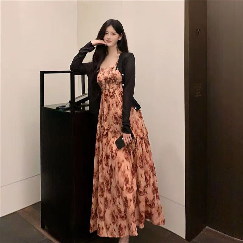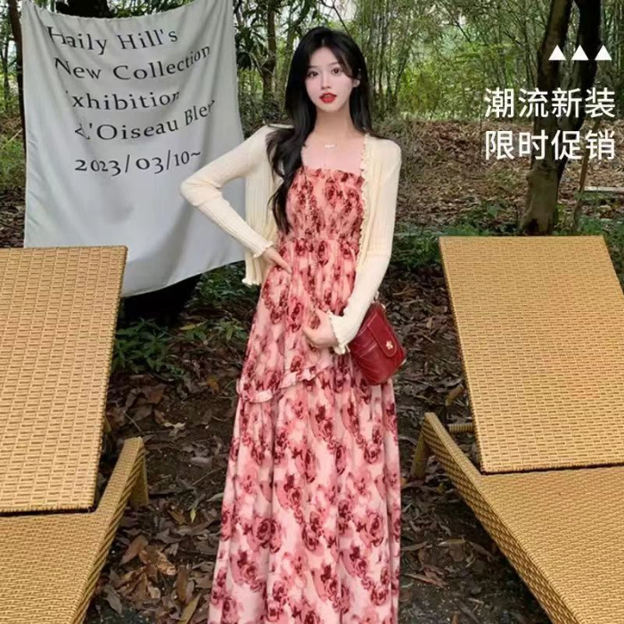 장미 꽃 Pleated Sling 원피스 여성의 2024 여름 새로운 프랑스 스타일 슬리밍 사교계 우아한 긴 원피스 타이트 허리