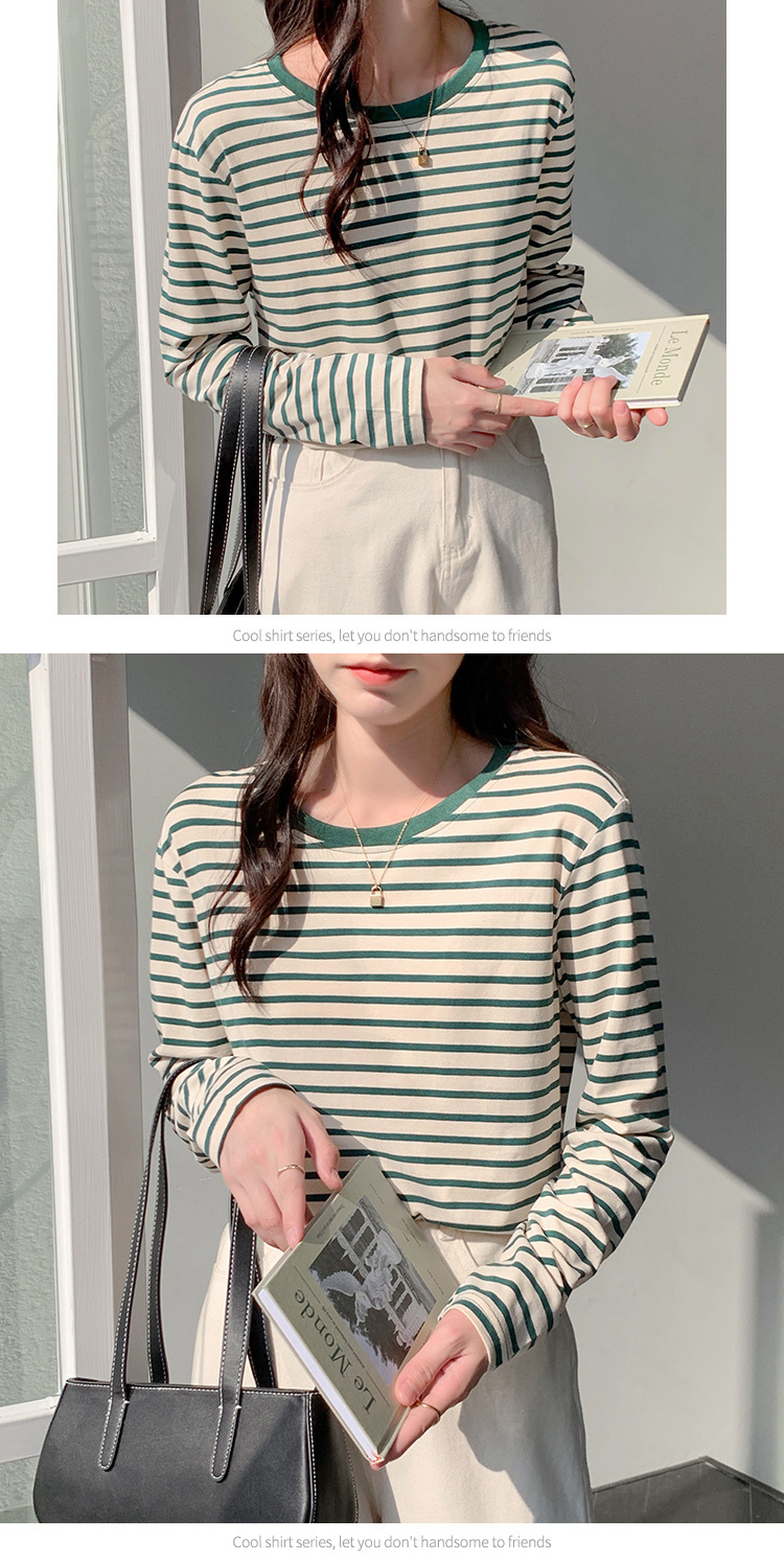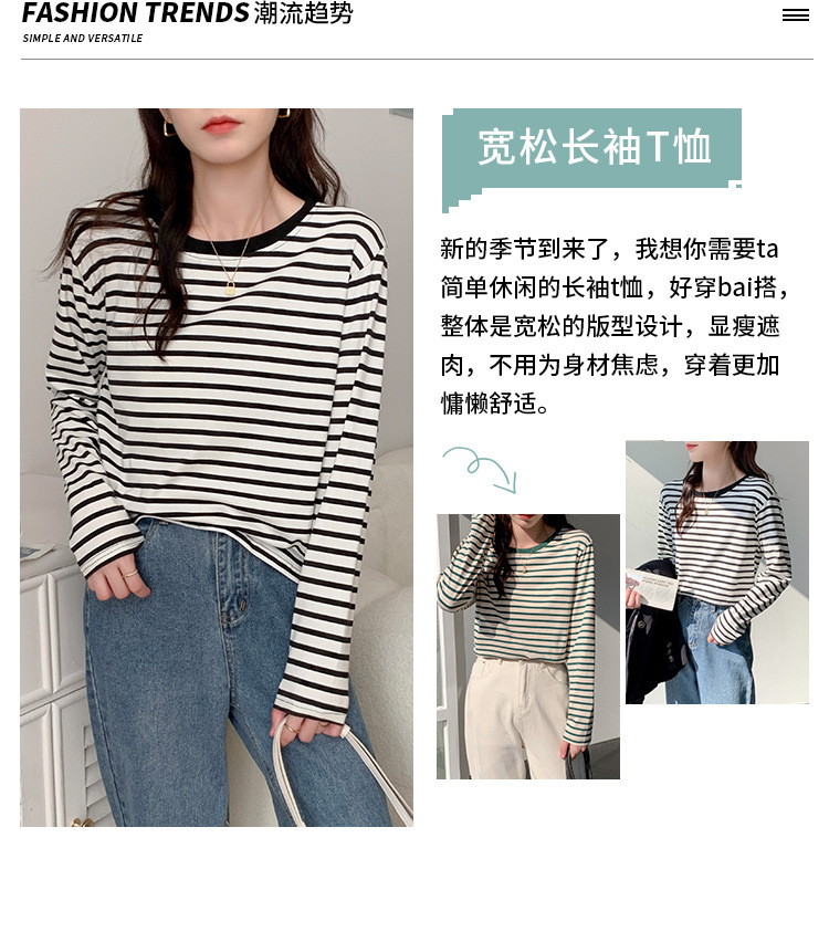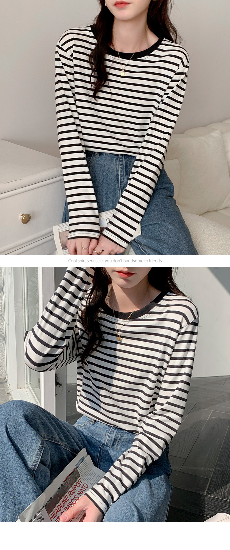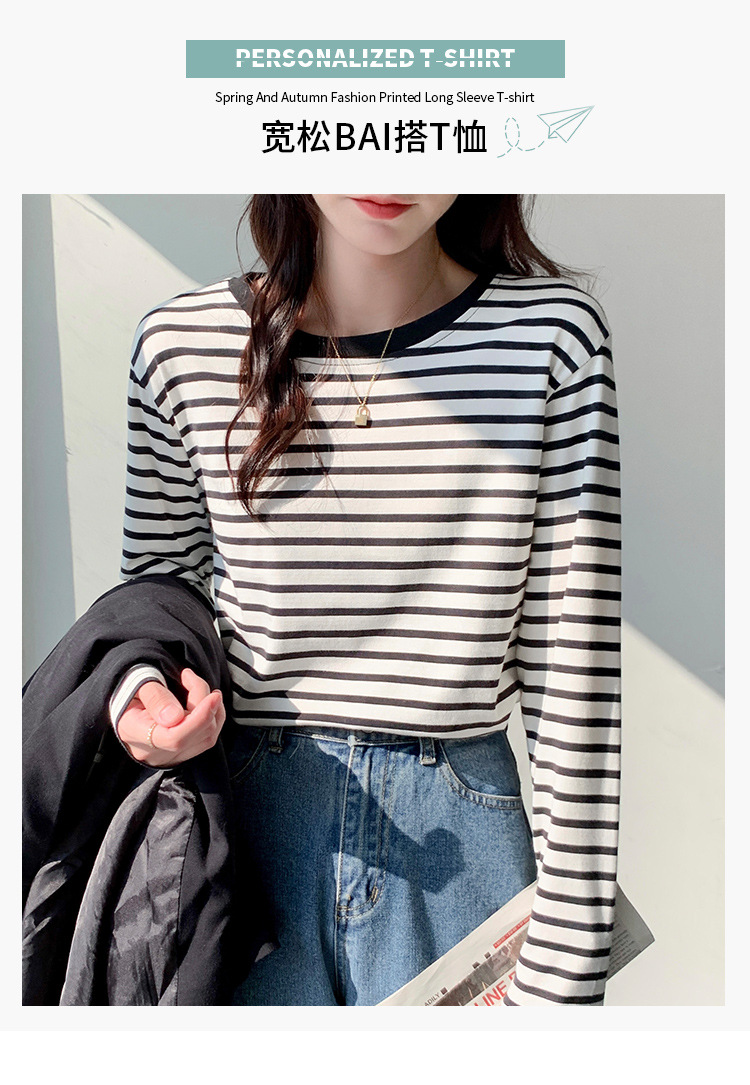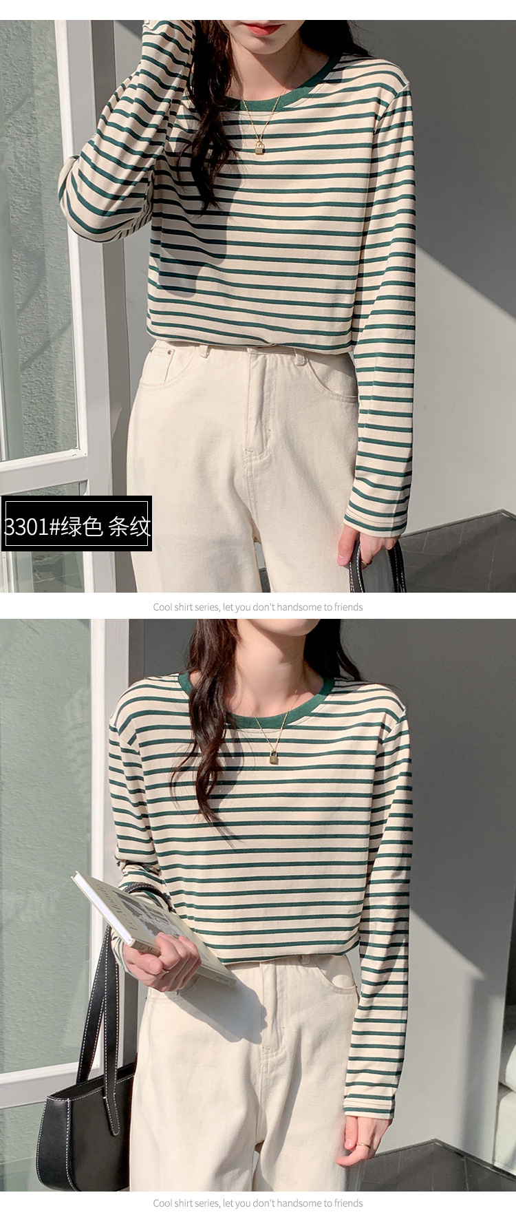 봄과 가을 한국 스타일 라운드 넥 대형 퓨어 코튼 스트라이프 긴팔 티셔츠 여성용 느슨한 내베이스 탑스토어 가기
