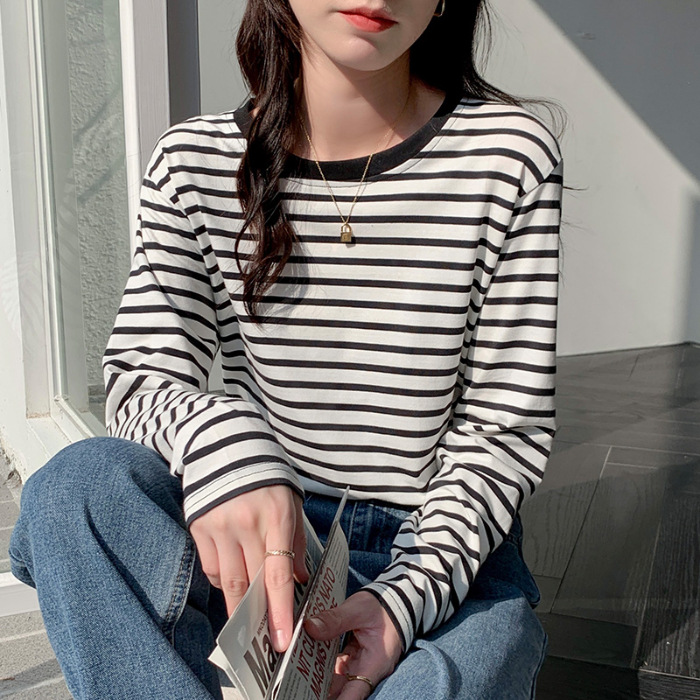 봄과 가을 한국 스타일 라운드 넥 대형 퓨어 코튼 스트라이프 긴팔 티셔츠 여성용 느슨한 내베이스 탑