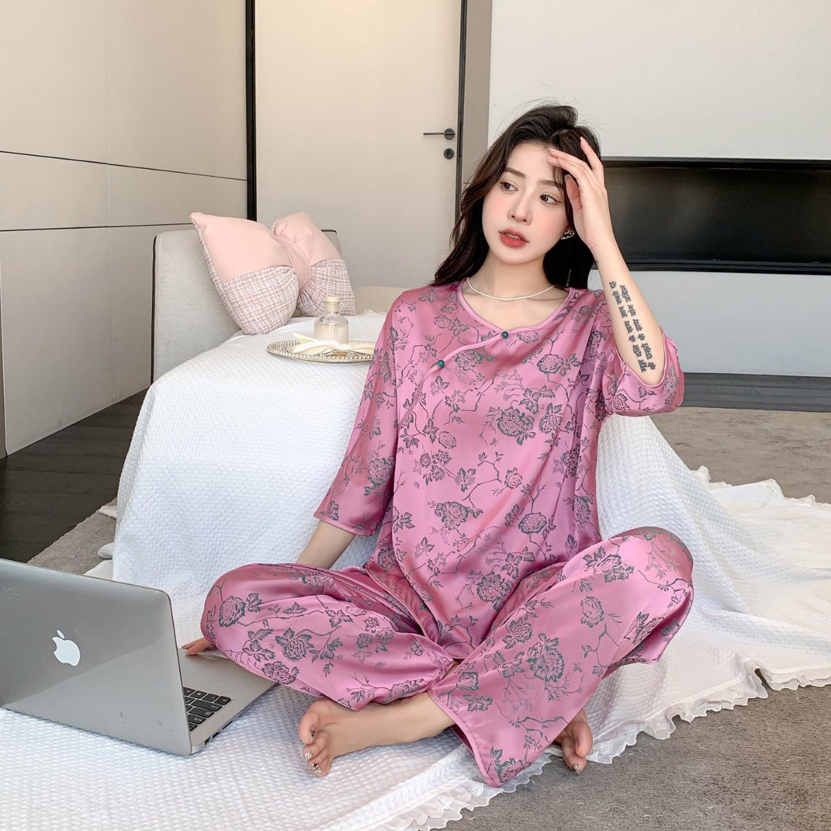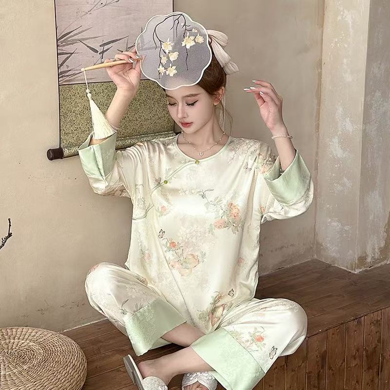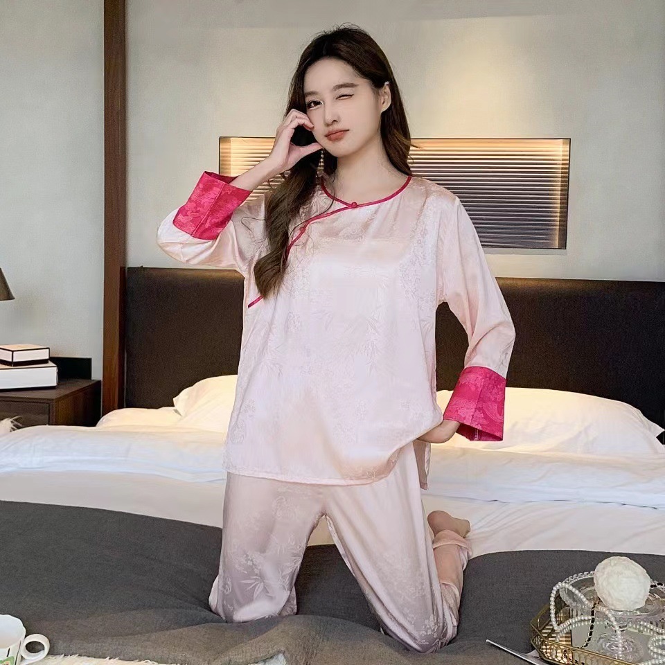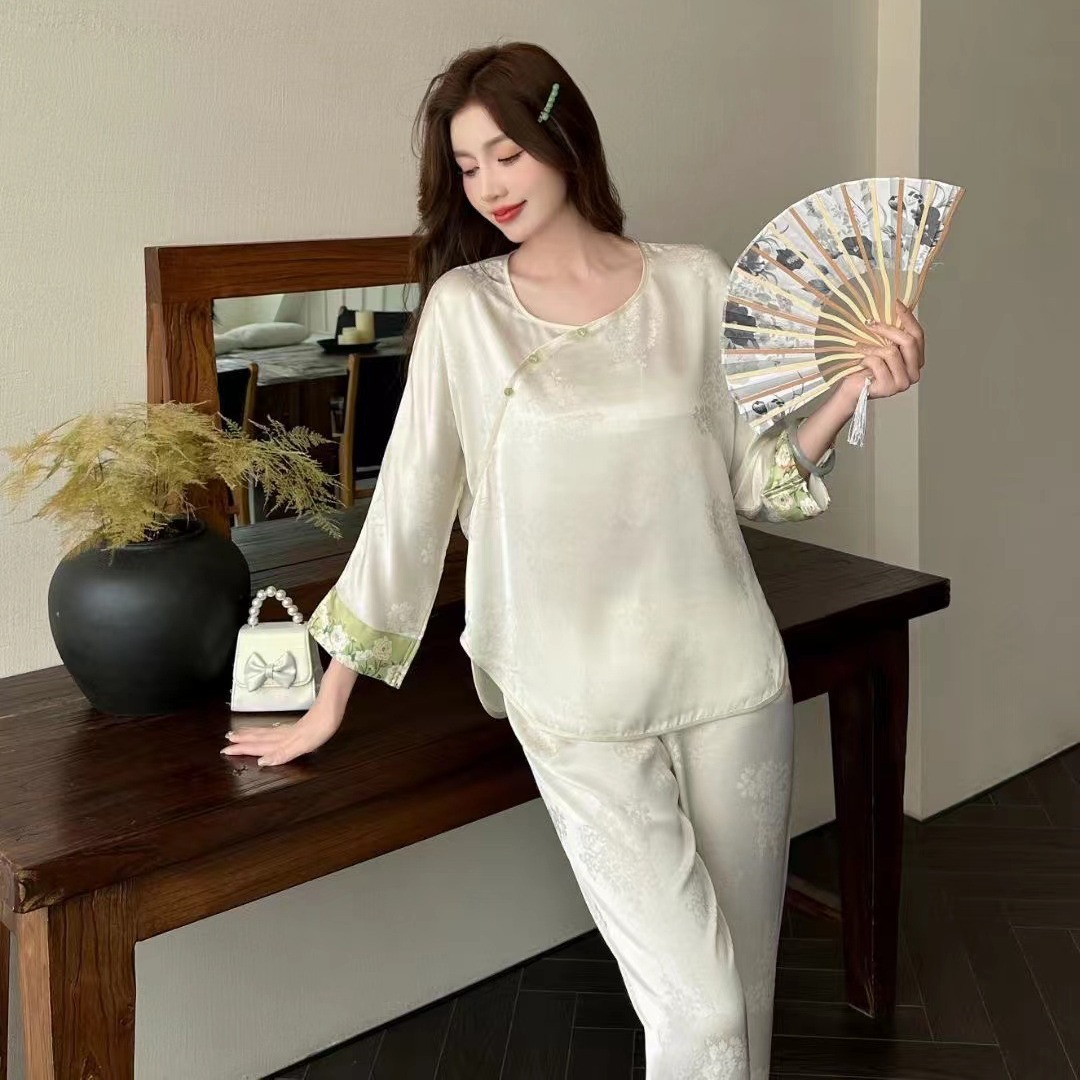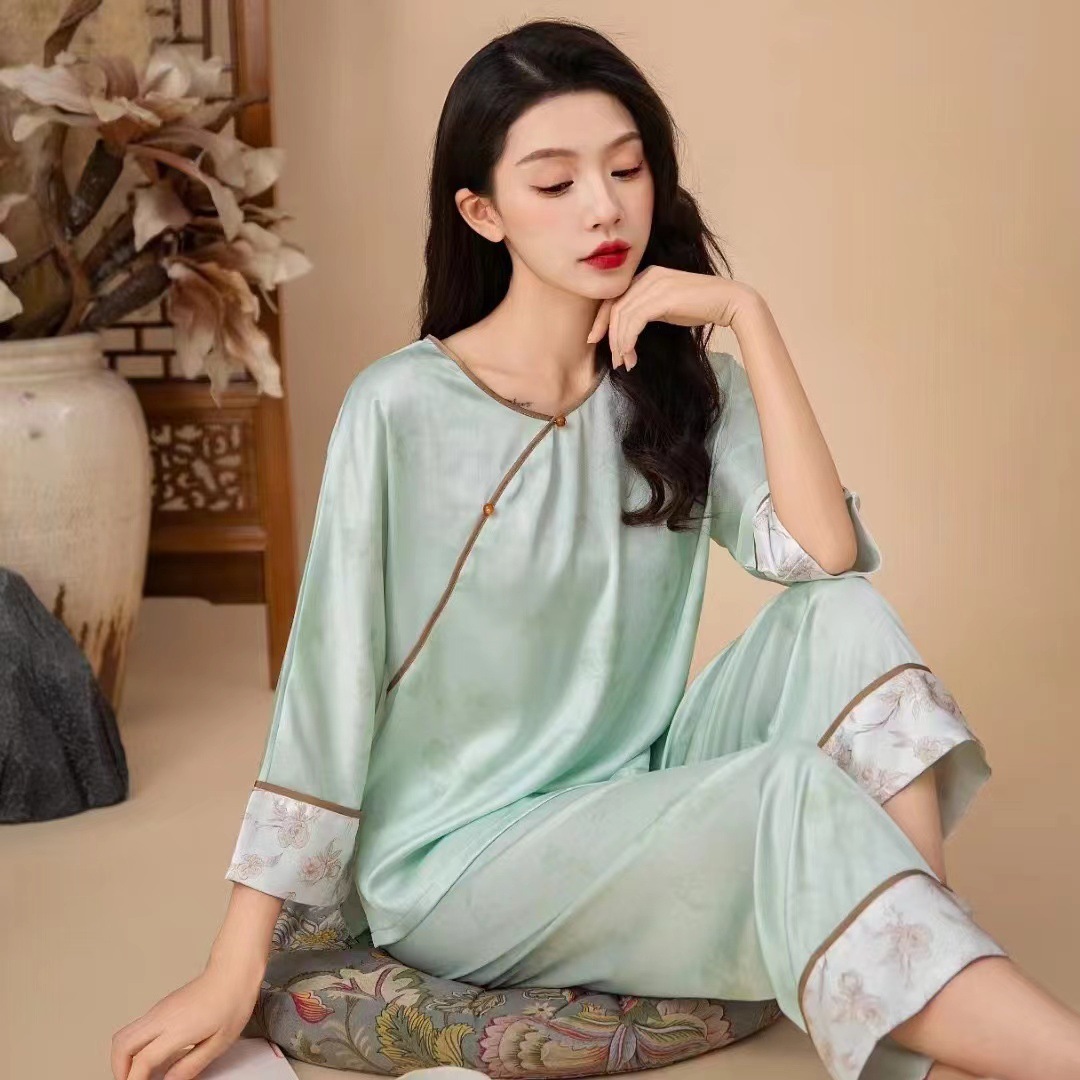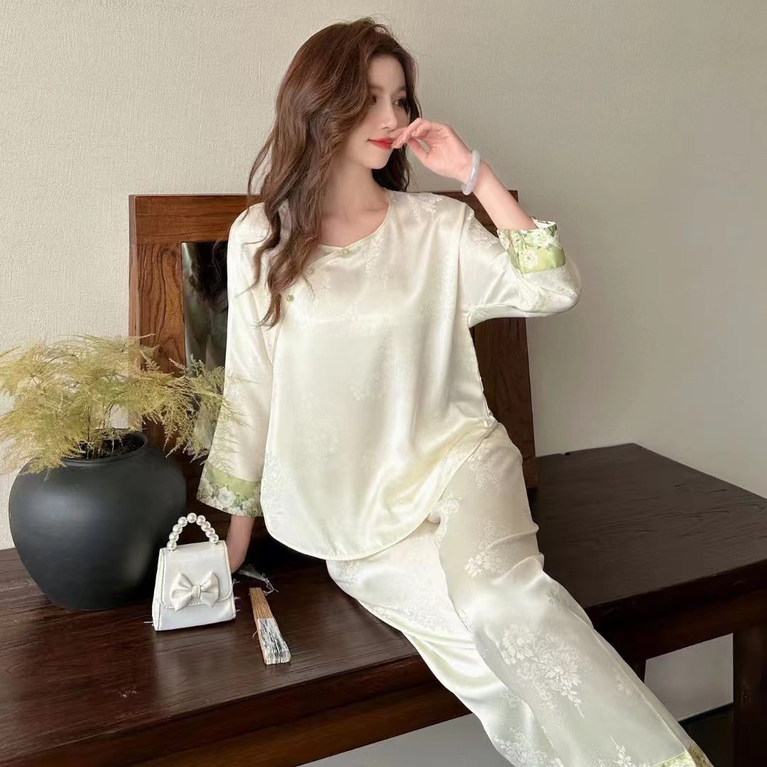 [매화 대나무] 새로운 중국 고대 스타일 얼음 실크 파자마 여성의 봄과 여름 실크 홈 착용 자카드 둥근 목 3/4 소매 에어컨
