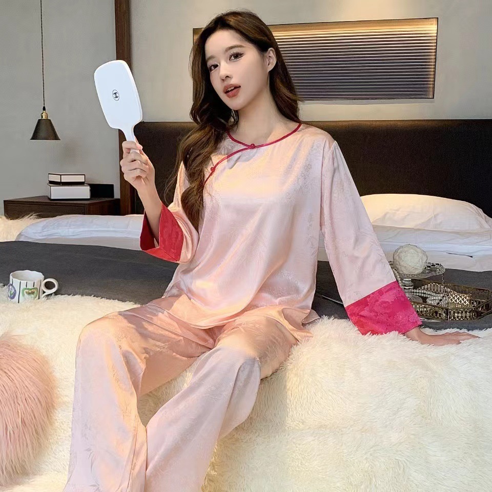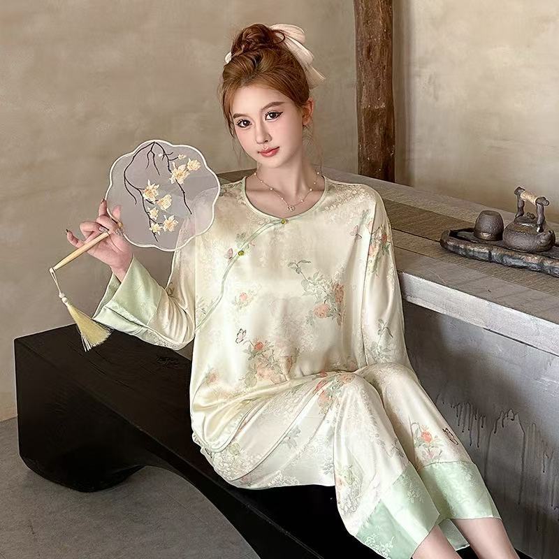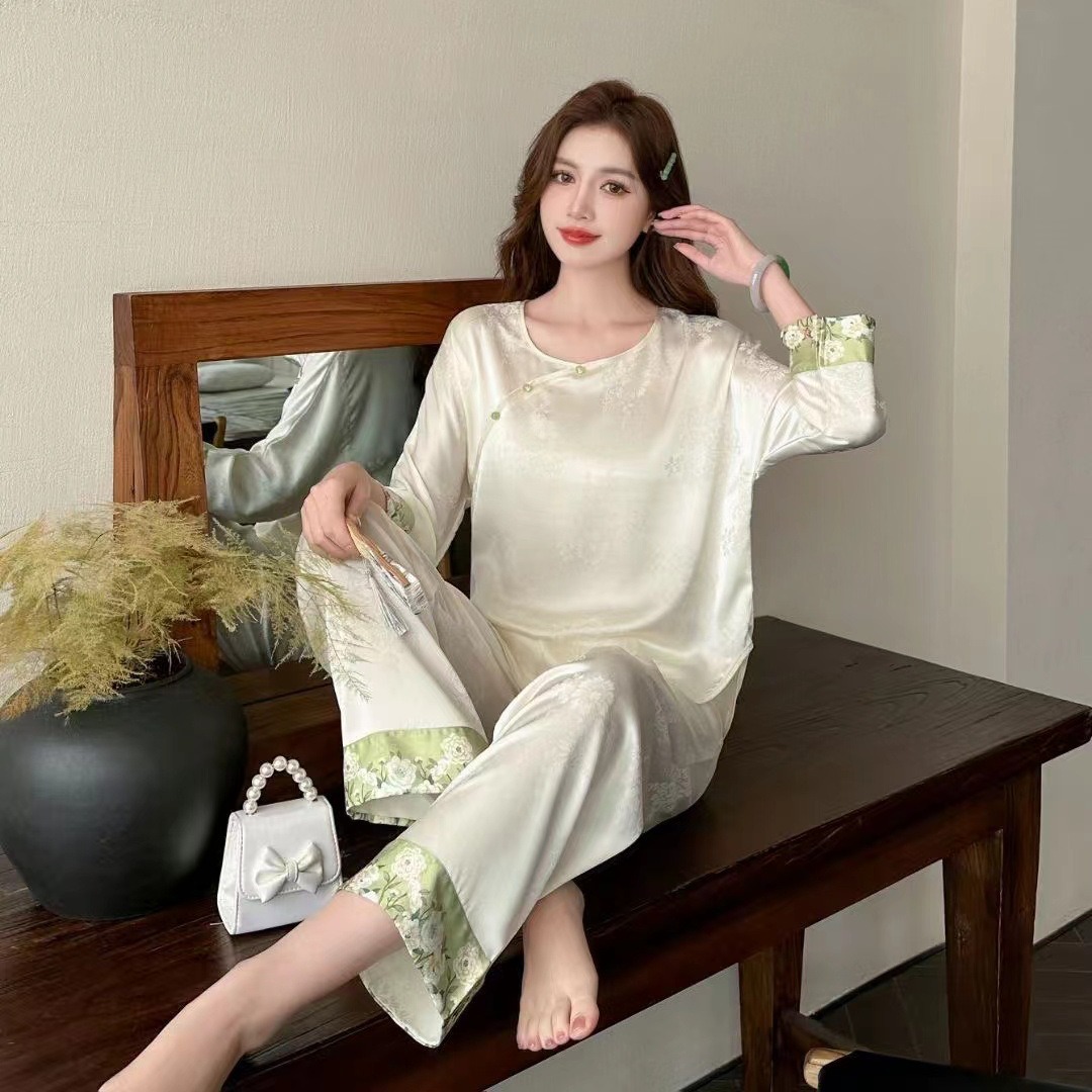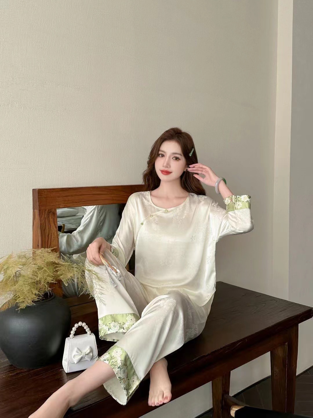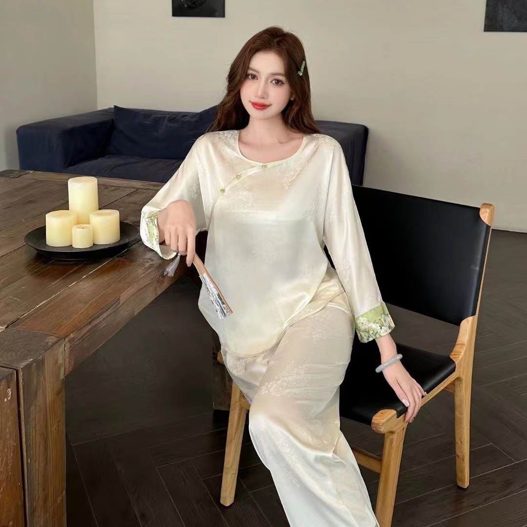 [매화 대나무] 새로운 중국 고대 스타일 얼음 실크 파자마 여성의 봄과 여름 실크 홈 착용 자카드 둥근 목 3/4 소매 에어컨