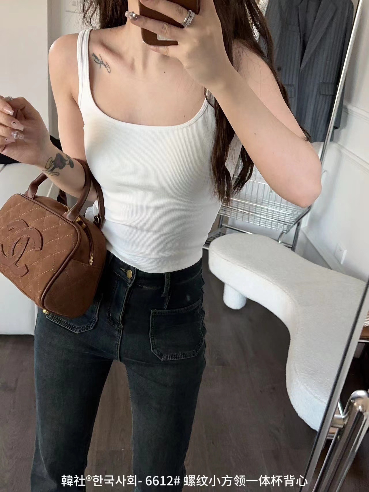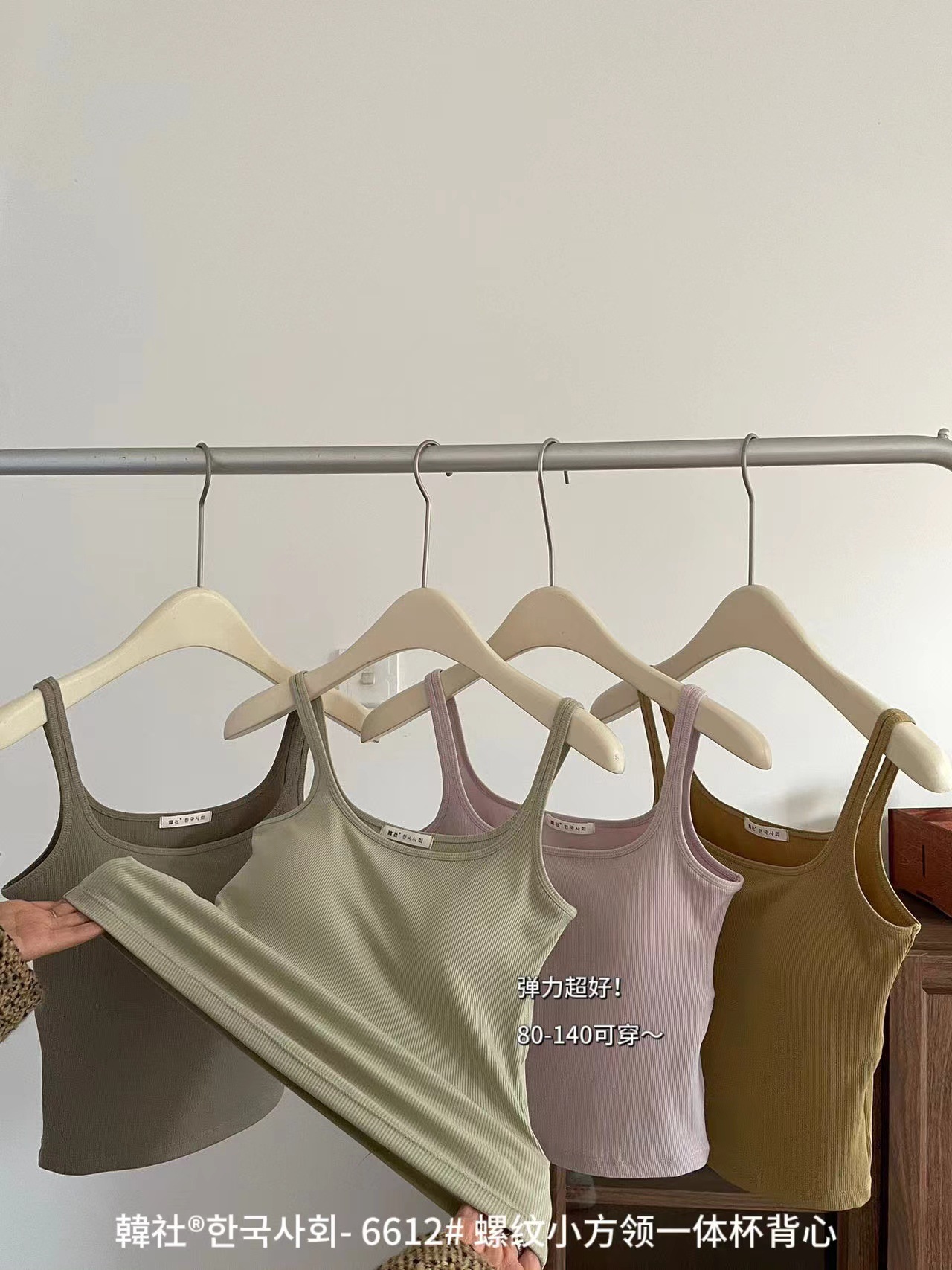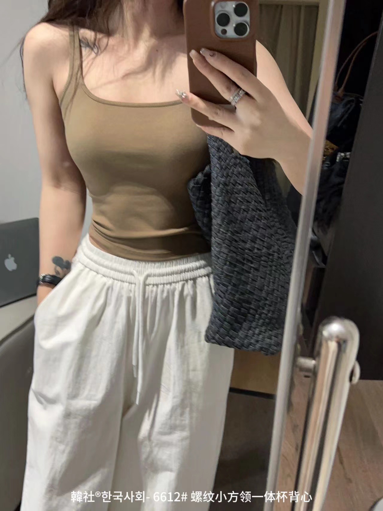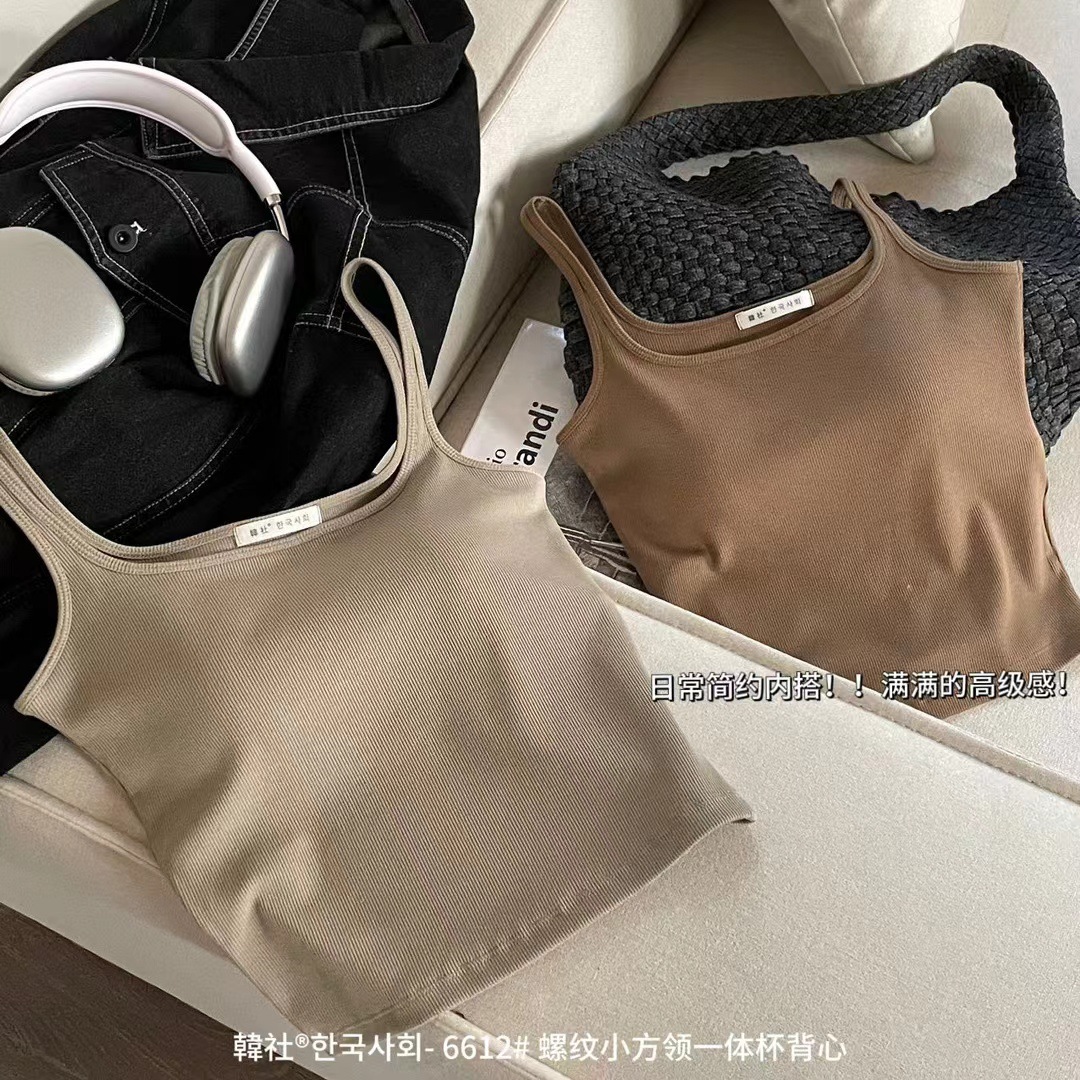 한국식 실 작은 사각 칼라 원피스 컵 조끼 여성 봄과 여름 편안한 발효 콩 두부 커버 슬림 핏 단색 내복 뷰티 백 탑스토어 가기