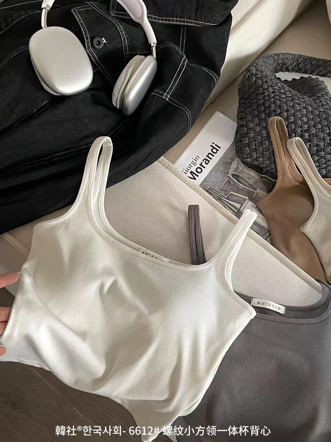 한국식 실 작은 사각 칼라 원피스 컵 조끼 여성 봄과 여름 편안한 발효 콩 두부 커버 슬림 핏 단색 내복 뷰티 백 탑
