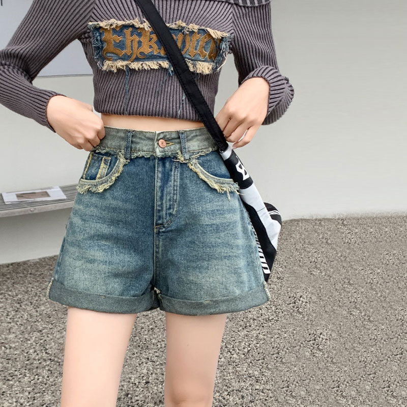 데님 반바지 여성용 블랙 그레이 인 스타일 새로운 콘트라스트 컬러 패션 디자인 닳은 높은 허리 컬링 A 라인 와이드 레그 핫팬츠스토어 가기