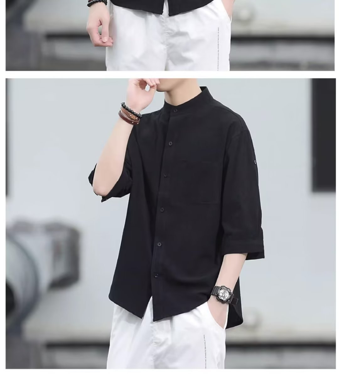 여름 스탠드 칼라 셔츠 남성면 및 린넨 3/4 소매 셔츠 일본 복고풍 남성용 반소매 한국식 트렌디 한 캐주얼스토어 가기