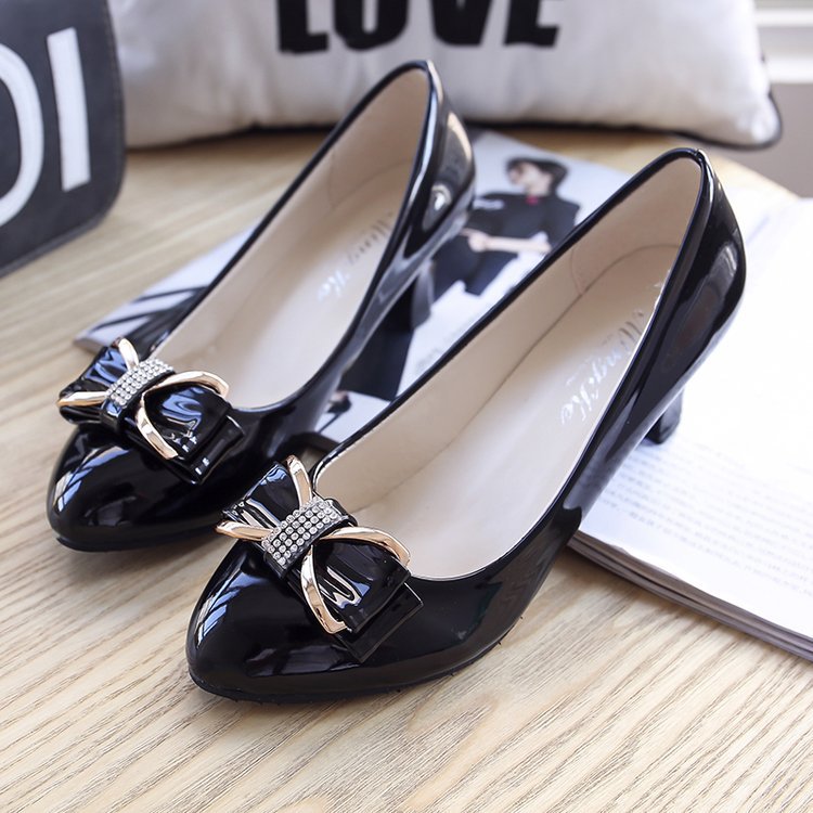 2024 봄과 가을 로우 컷 특허 가죽 싱글 레이어 신발 여성용 달콤한 활 라운드 토 블랙 하이힐 미드 힐 청키 힐 가죽 신발