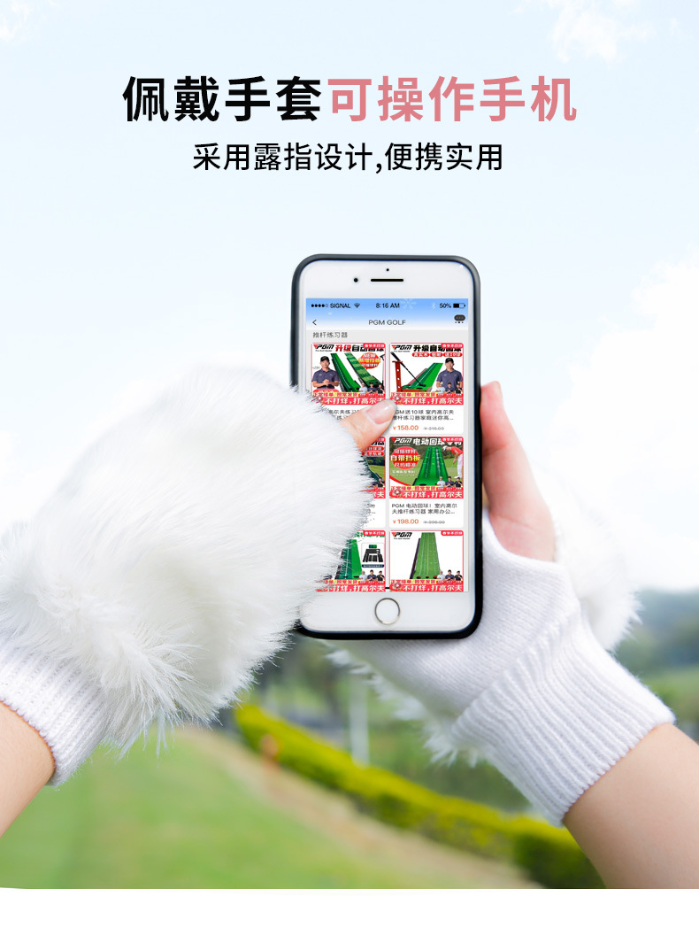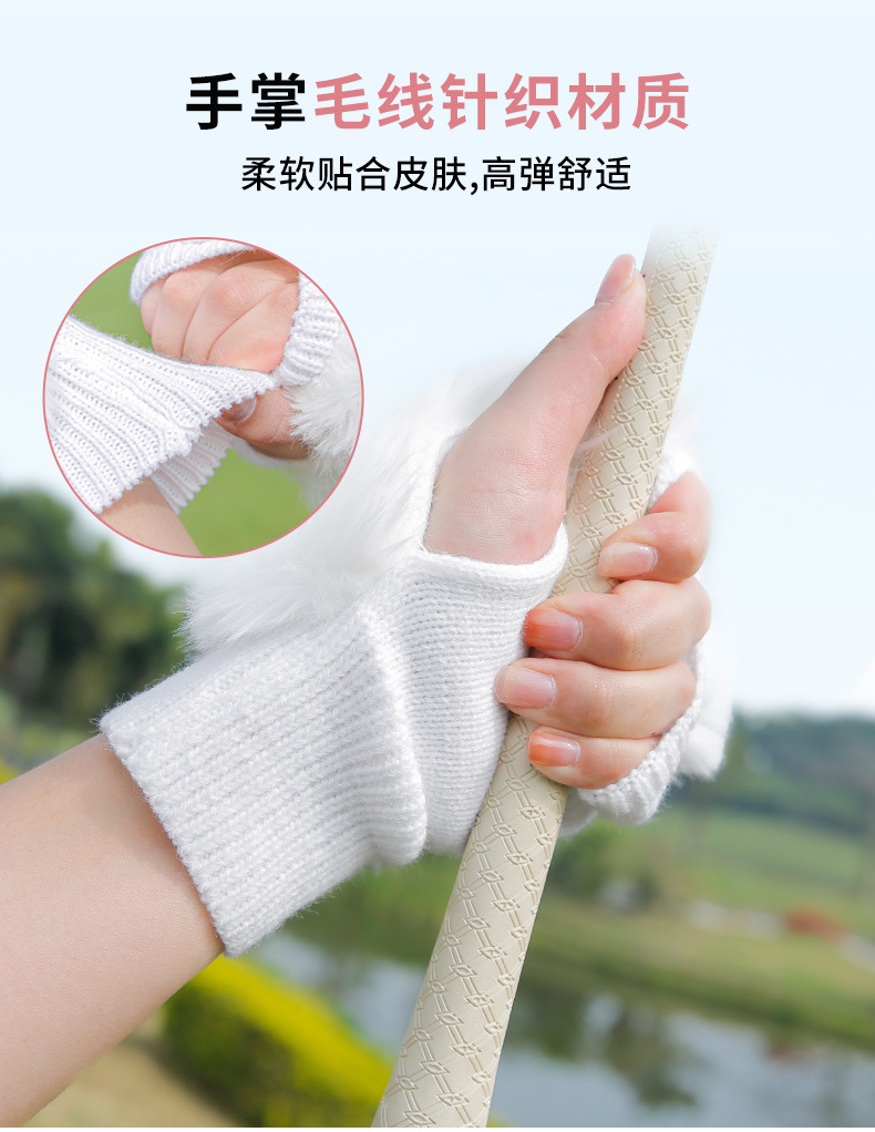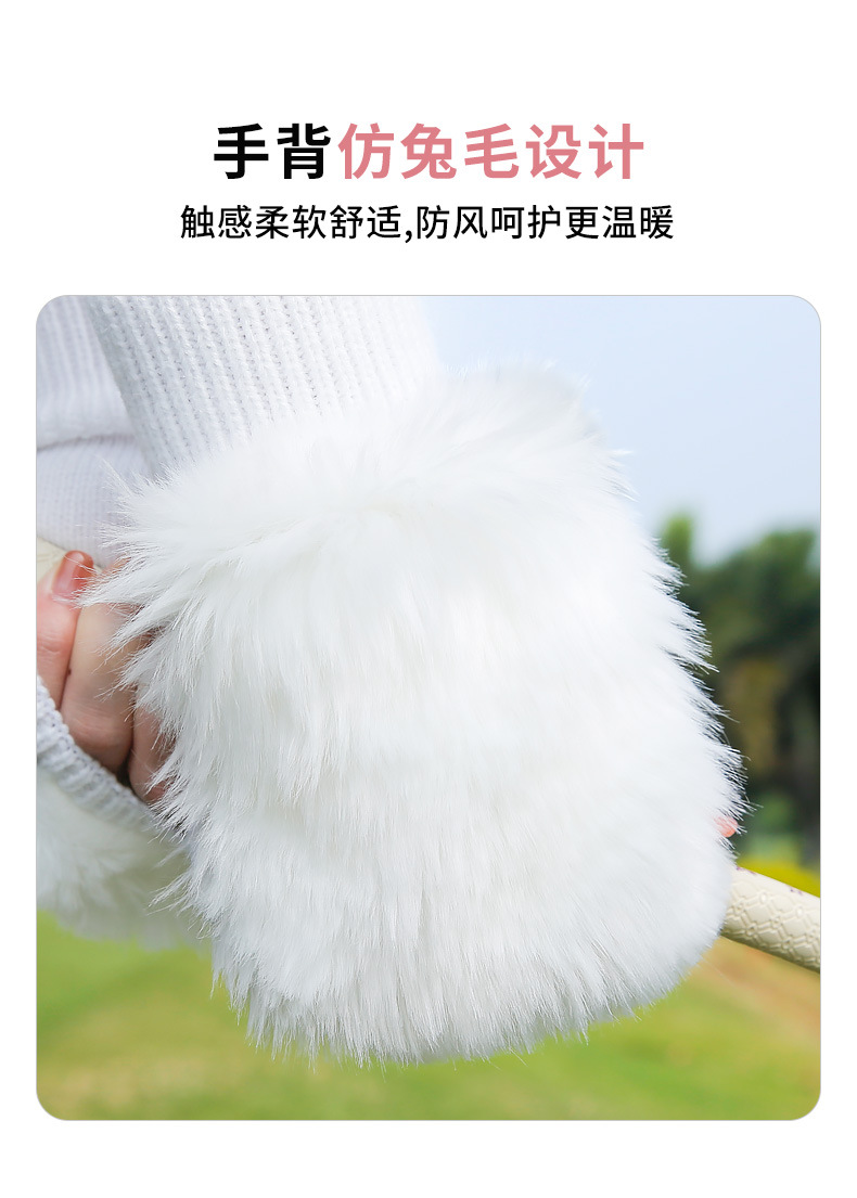 产品特点 | 1.仿兔毛加绒,触感柔软舒适,防风呵护更温暖 2.手掌毛线针织材质,柔软贴合皮肤,高弹舒适 3.佩戴手套可操作手机,采用露指设计,便携实用 | |||