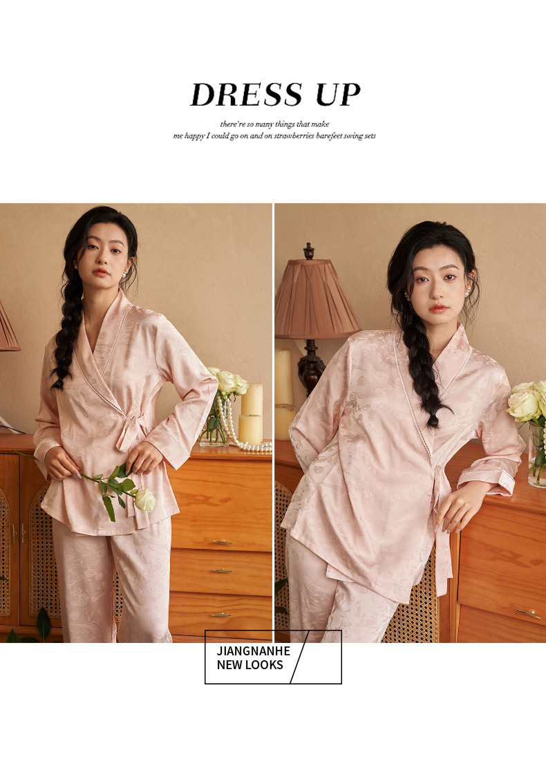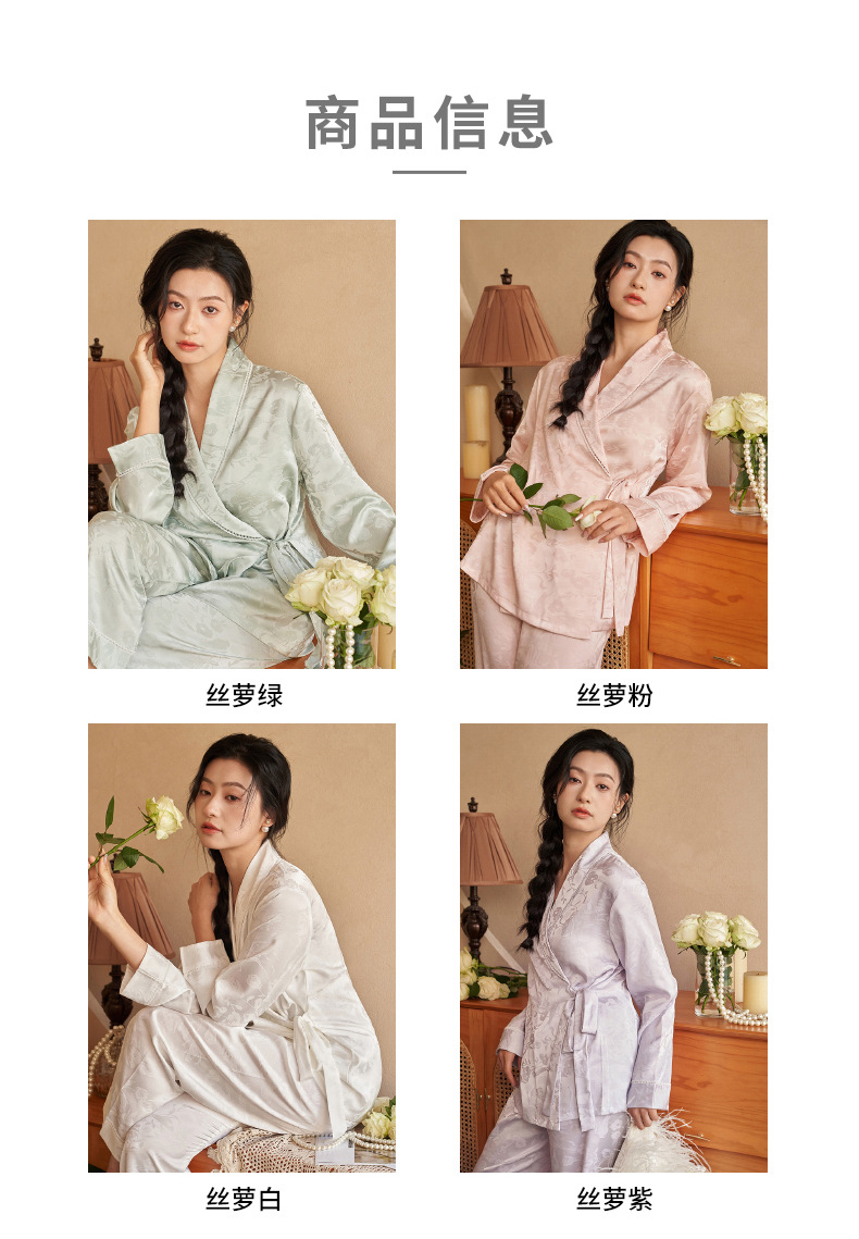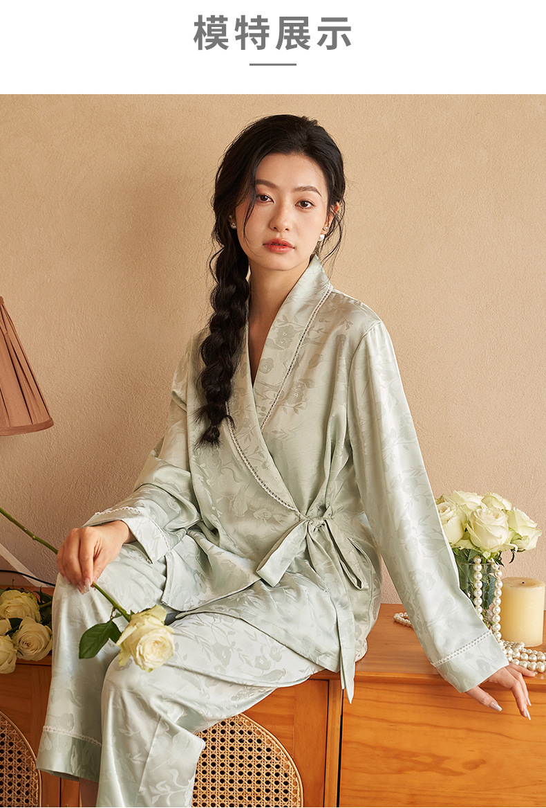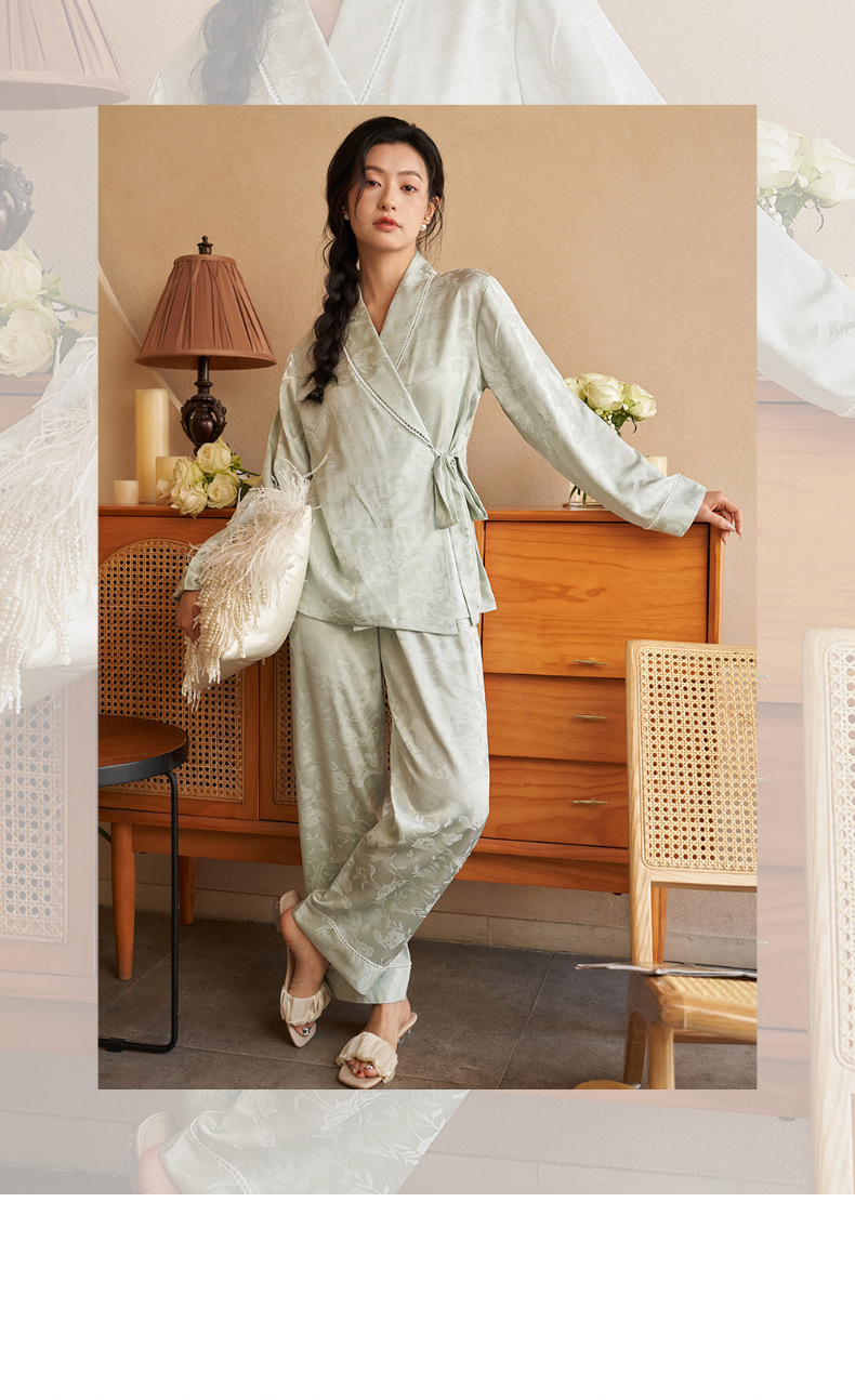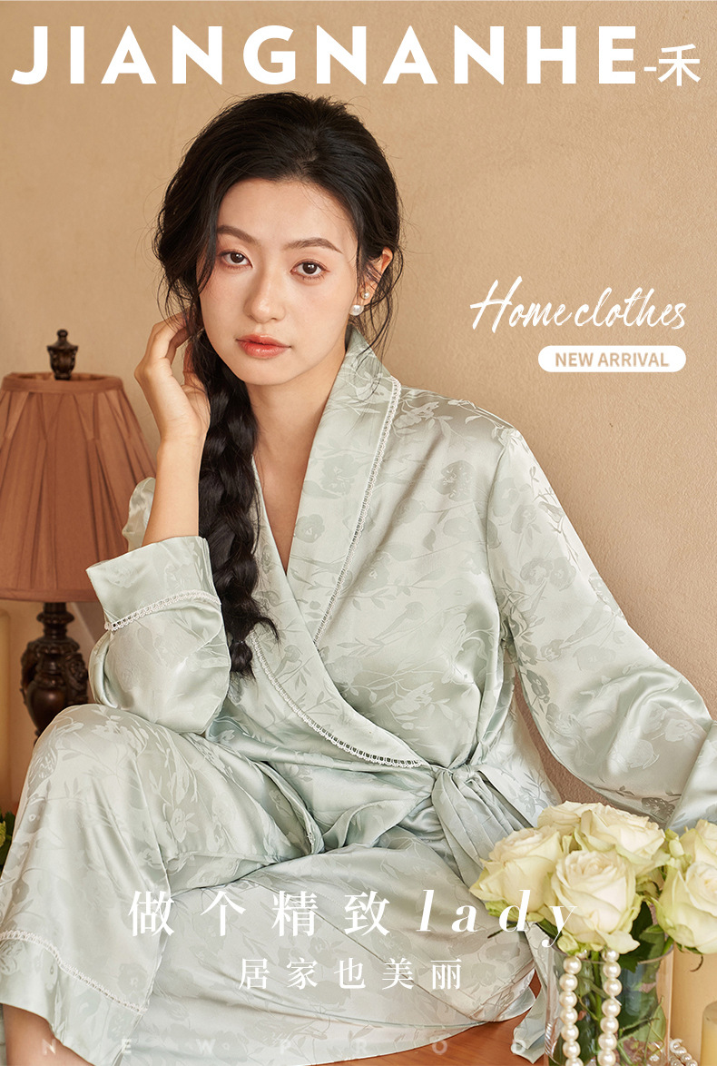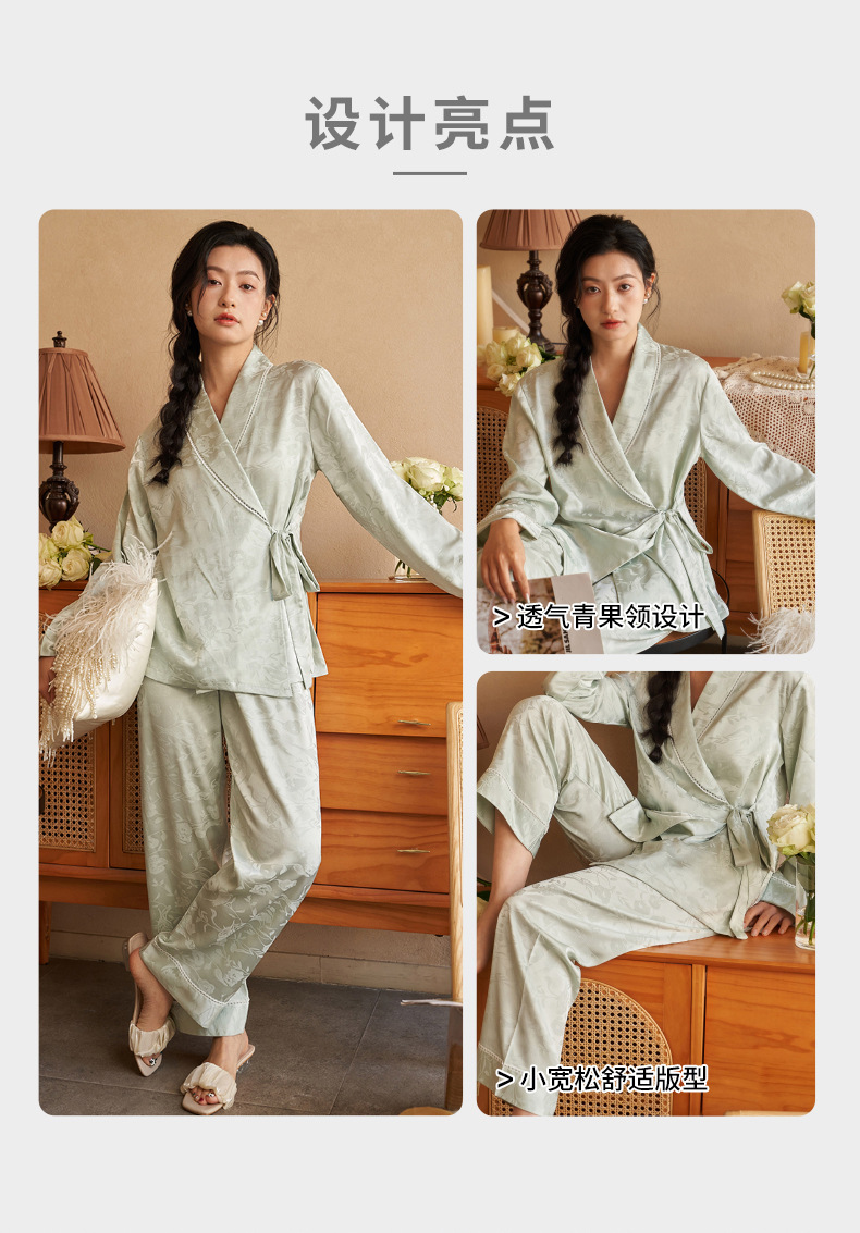 강남허 2025년 아이스 실크 잠옷 여성용 봄 가을 그린 과일 칼라 자카드 긴팔 긴바지 홈웨어 세트스토어 가기