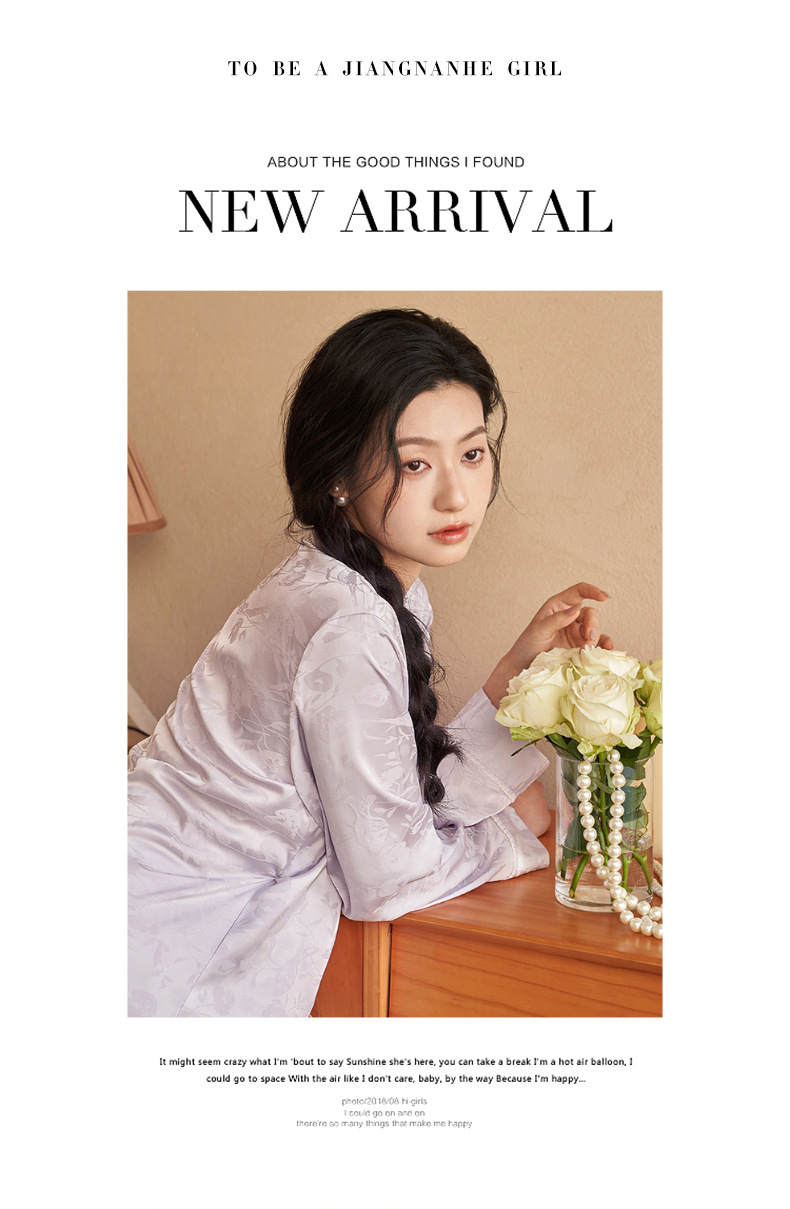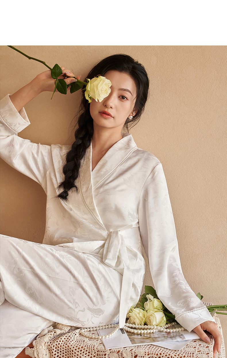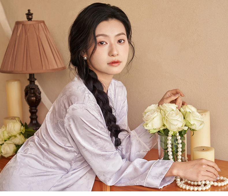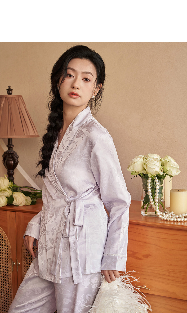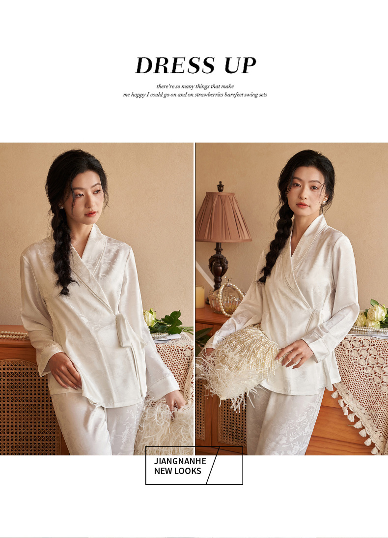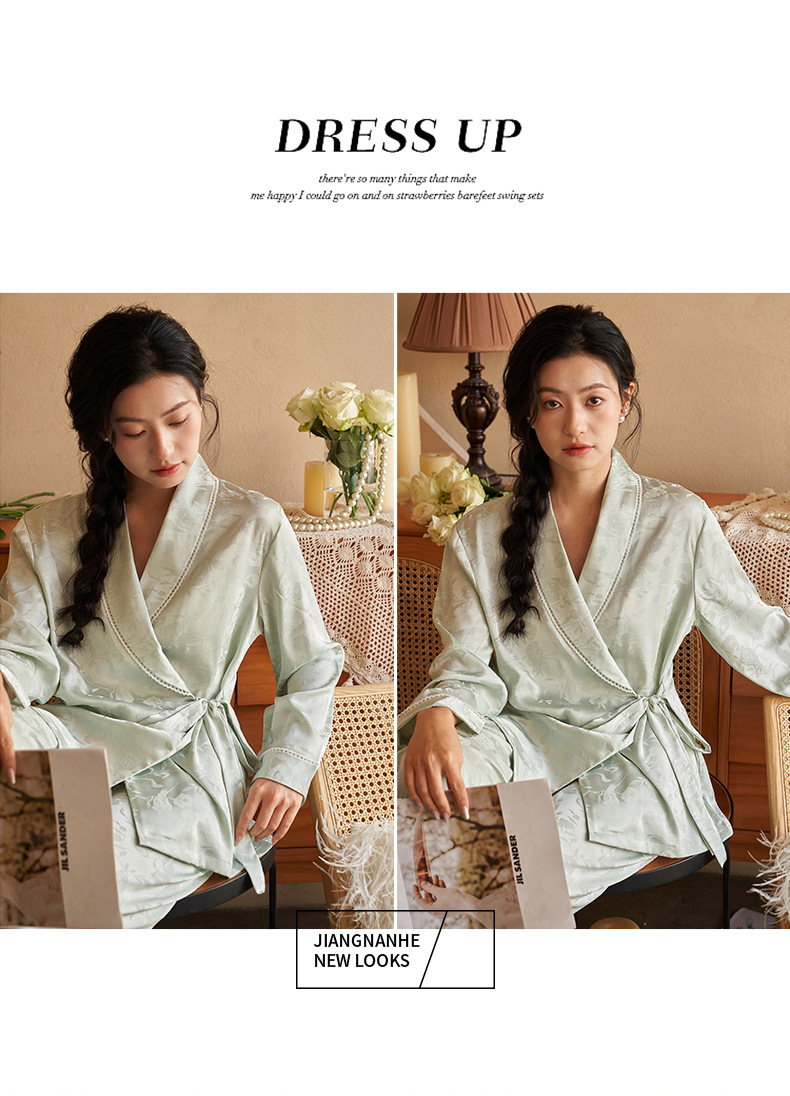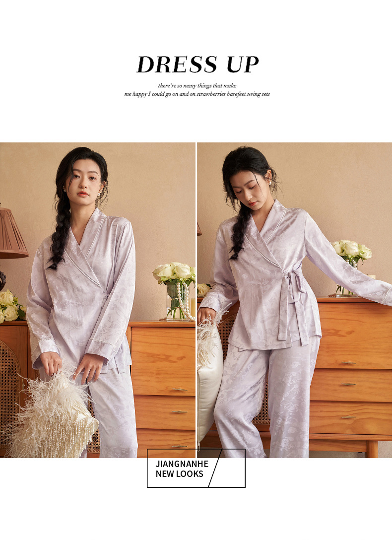 강남허 2025년 아이스 실크 잠옷 여성용 봄 가을 그린 과일 칼라 자카드 긴팔 긴바지 홈웨어 세트스토어 가기