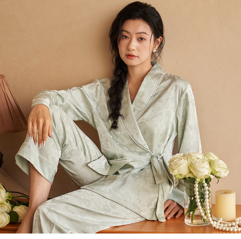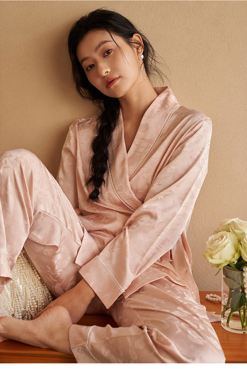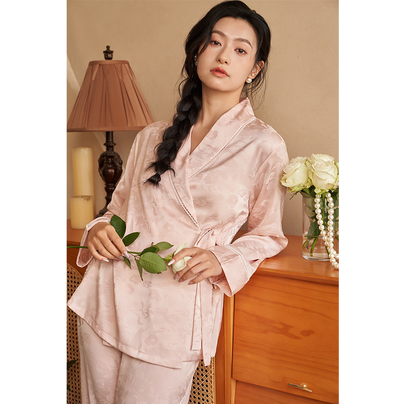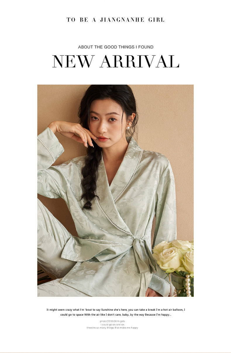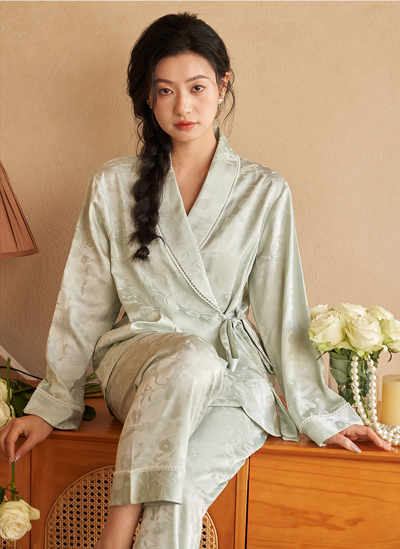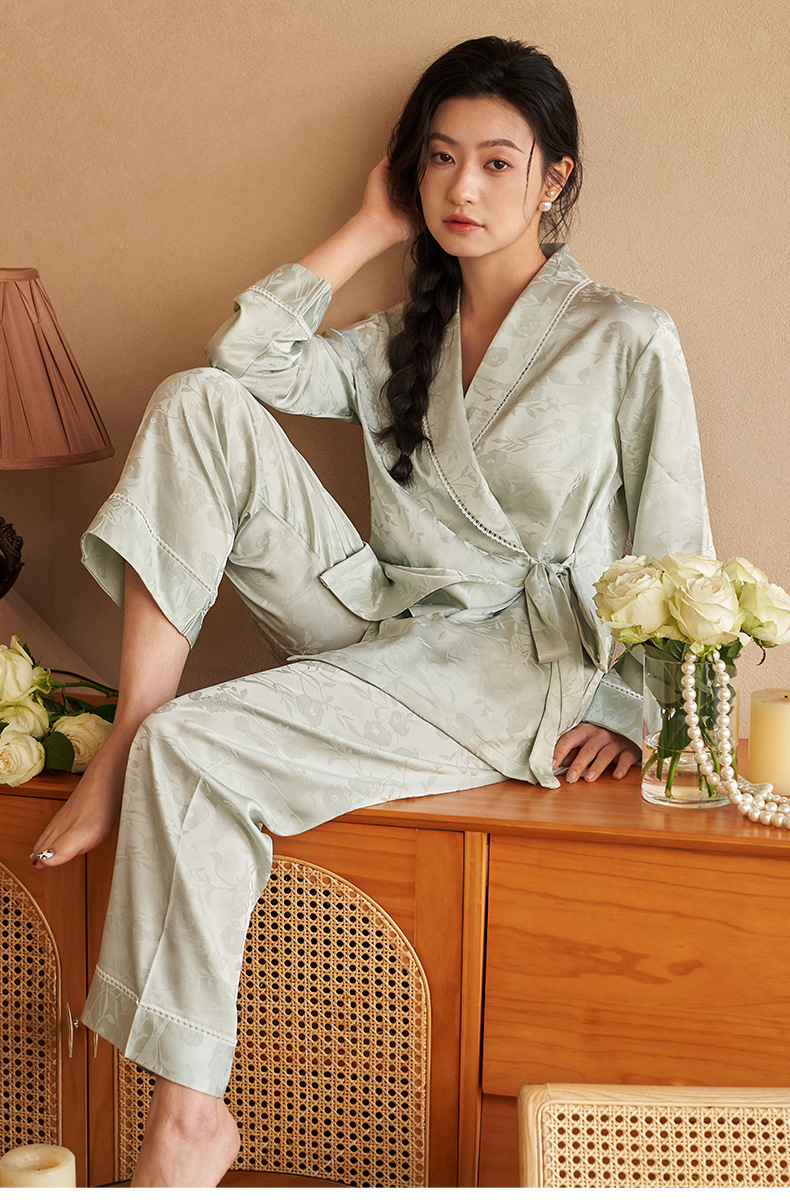 강남허 2025년 아이스 실크 잠옷 여성용 봄 가을 그린 과일 칼라 자카드 긴팔 긴바지 홈웨어 세트
