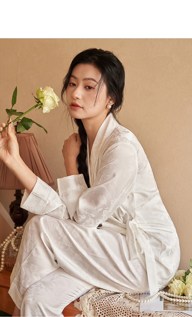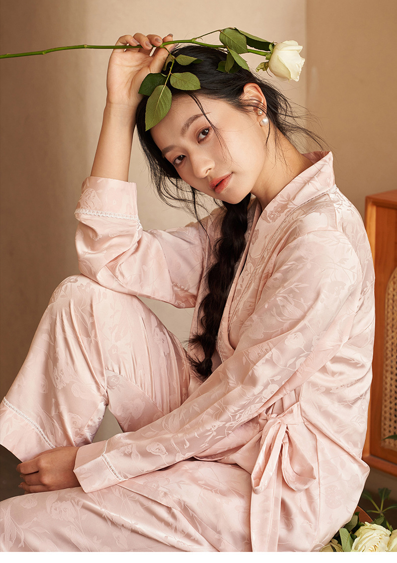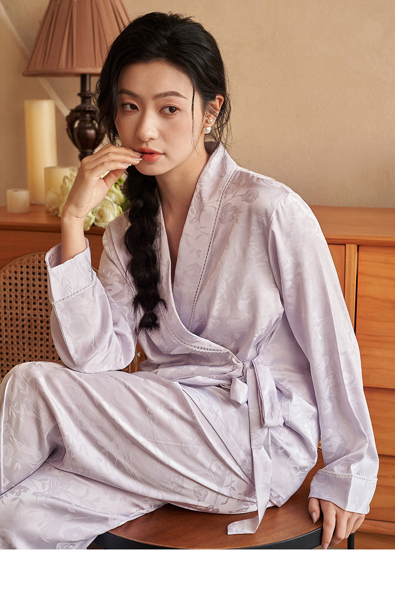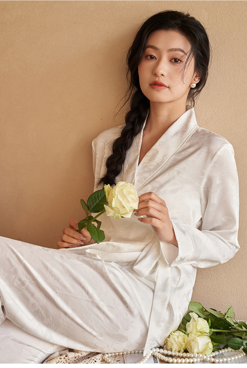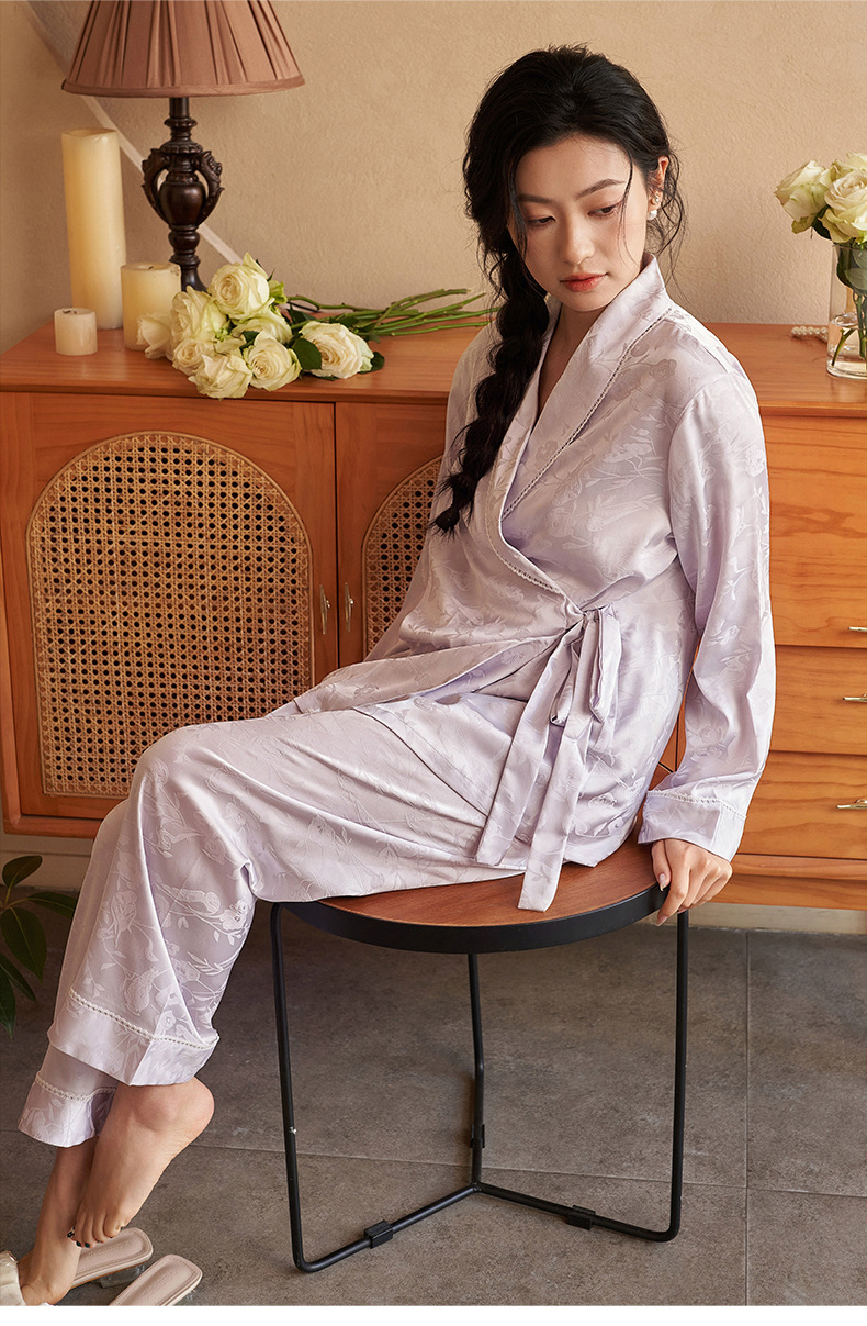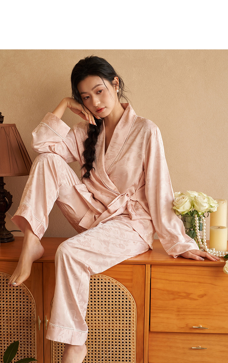 강남허 2025년 아이스 실크 잠옷 여성용 봄 가을 그린 과일 칼라 자카드 긴팔 긴바지 홈웨어 세트
