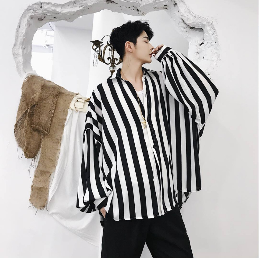 봄과 가을 남성용 얇은 긴팔 스트라이프 셔츠 남성 청소년 트렌디 한 올 매치 느슨한 bf 스타일 배트 윙 셔츠 캐주얼 셔츠스토어 가기