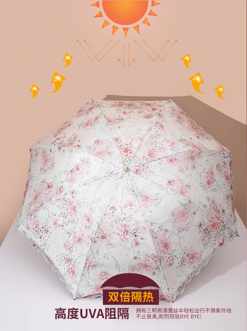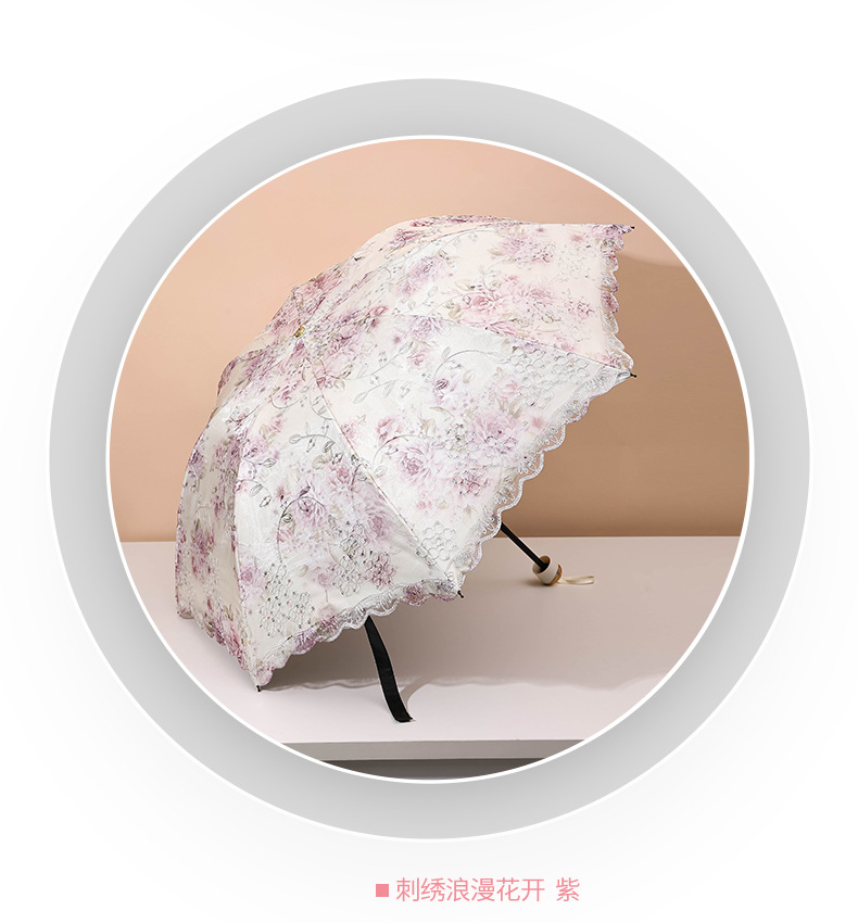 더블 레이어 자수 스팽글 레이스 비닐 태양 우산 여신 비 이중 사용 접이식 태양 보호 UV 보호 UPF50 +