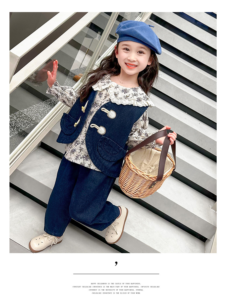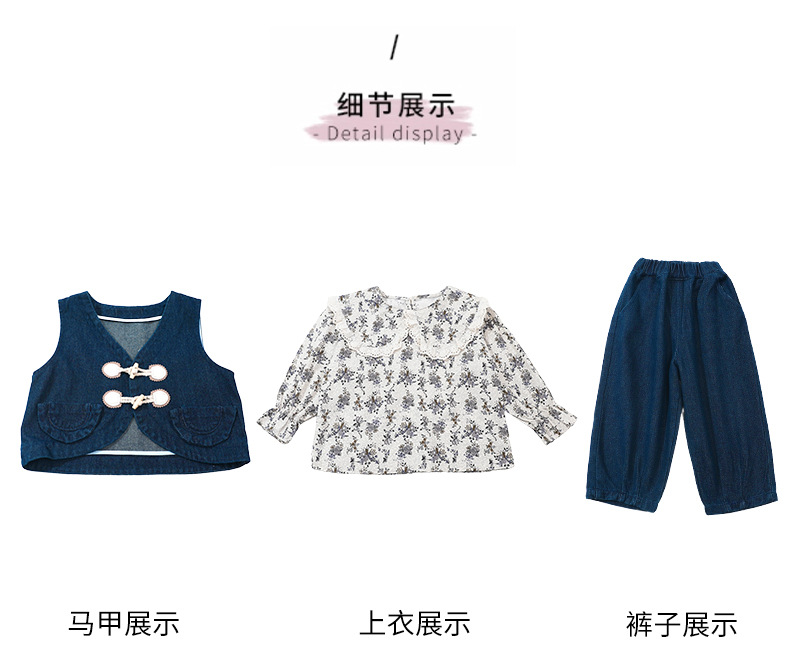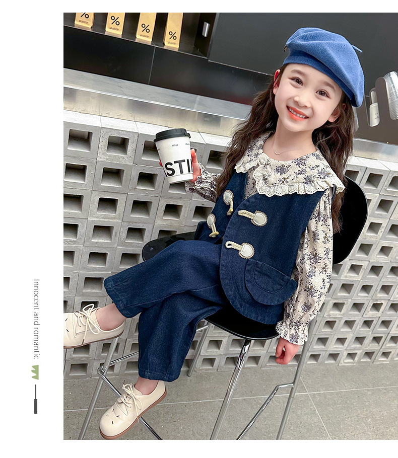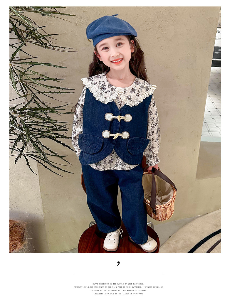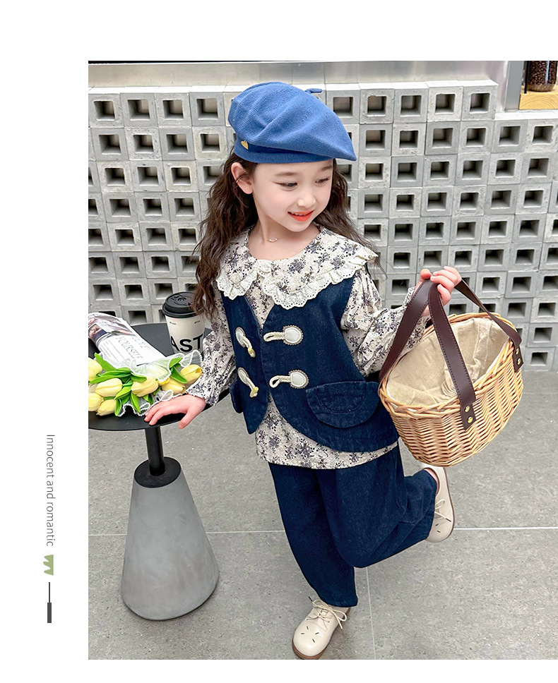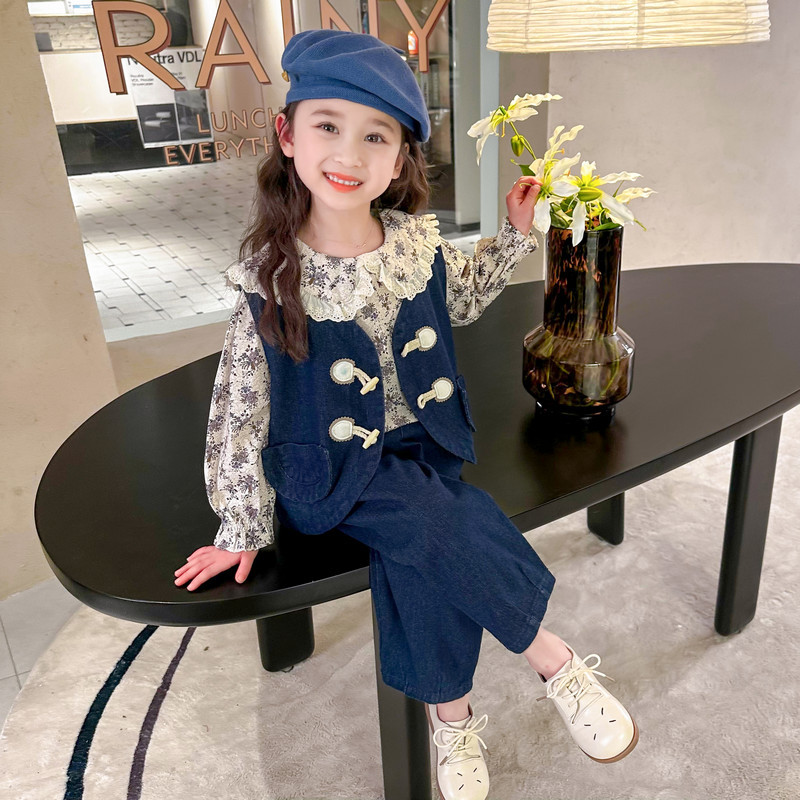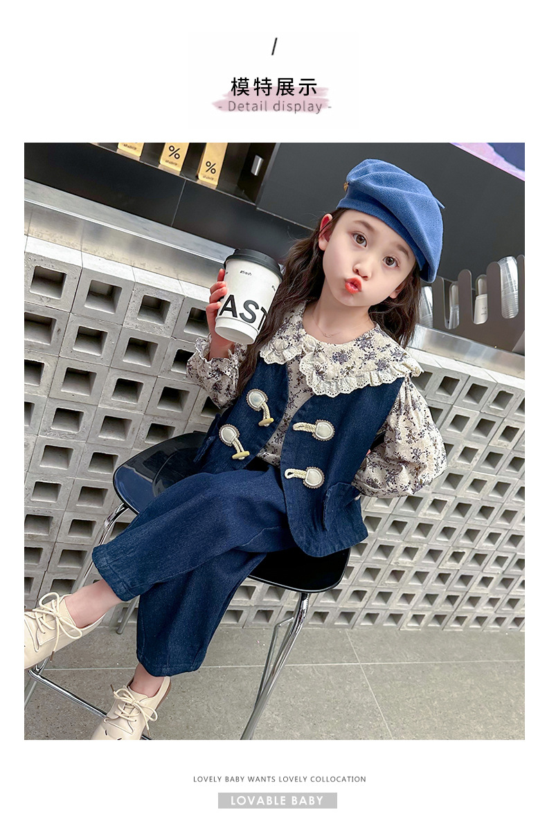 아기 소녀 봄 옷 새로운 중국 스타일의 데님 조끼 3 피스 세트 중소 규모. 어린이 달콤한 스타일 바닥 셔츠 느슨한 넓은 다리 바지스토어 가기