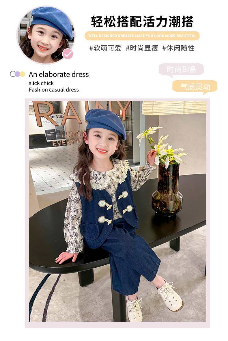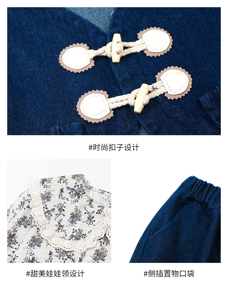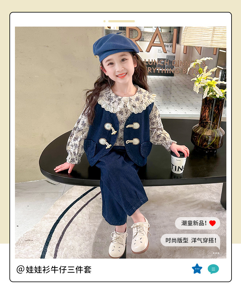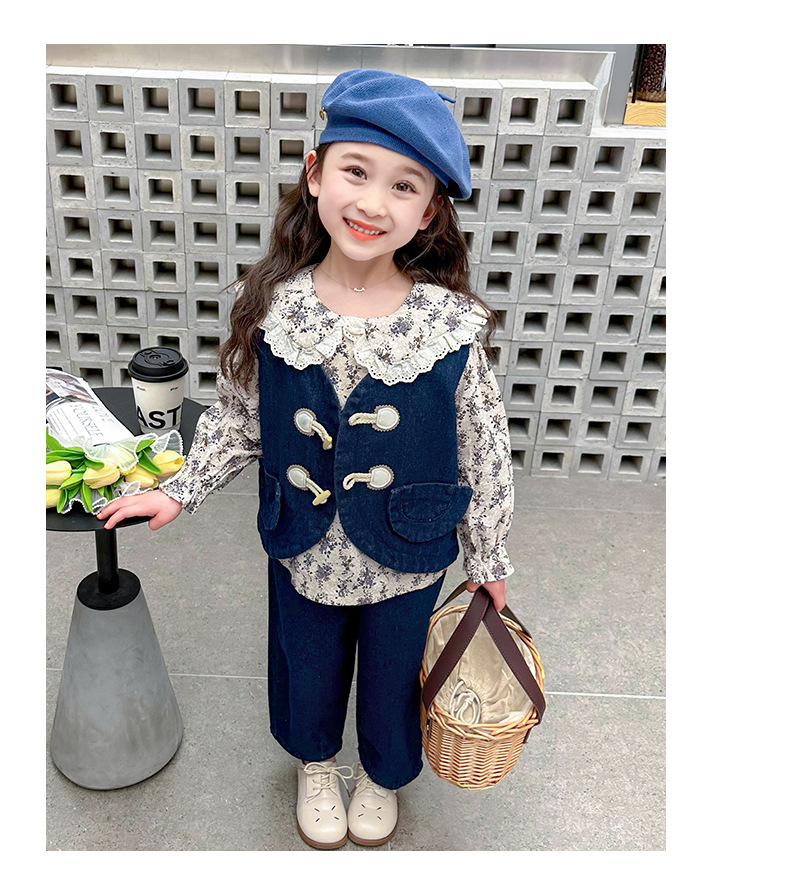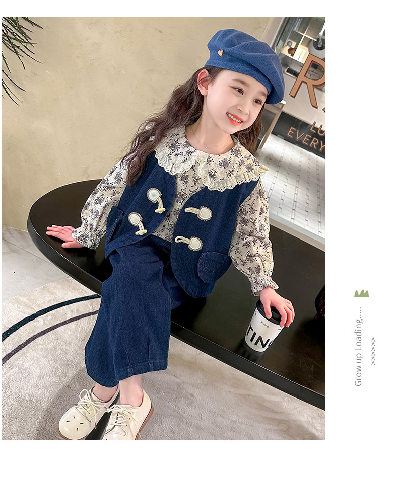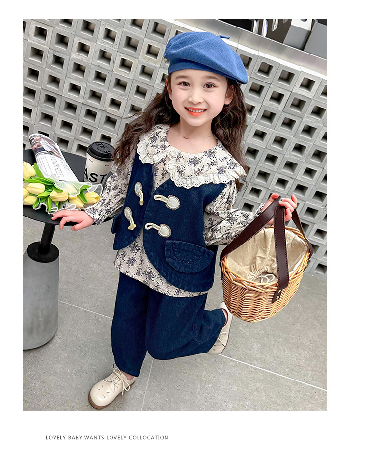 아기 소녀 봄 옷 새로운 중국 스타일의 데님 조끼 3 피스 세트 중소 규모. 어린이 달콤한 스타일 바닥 셔츠 느슨한 넓은 다리 바지스토어 가기