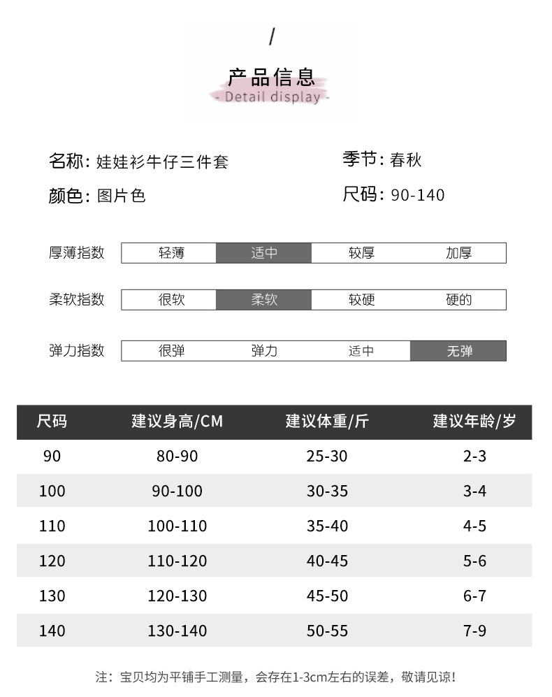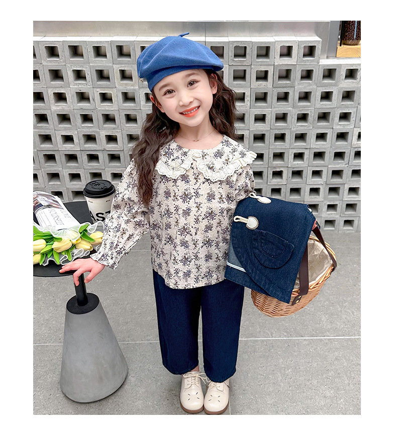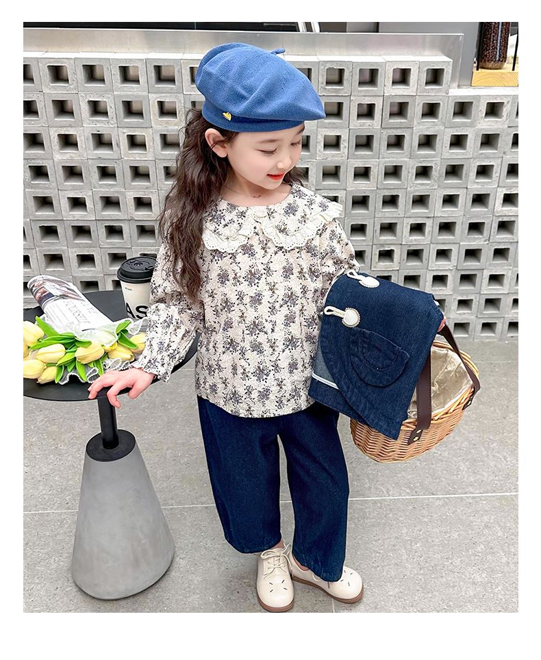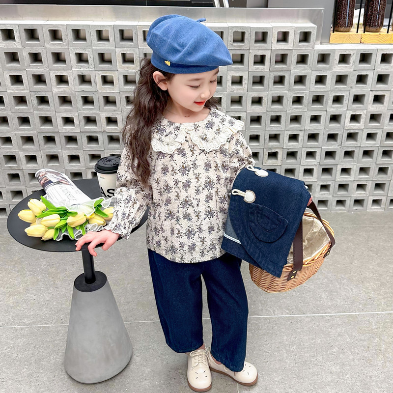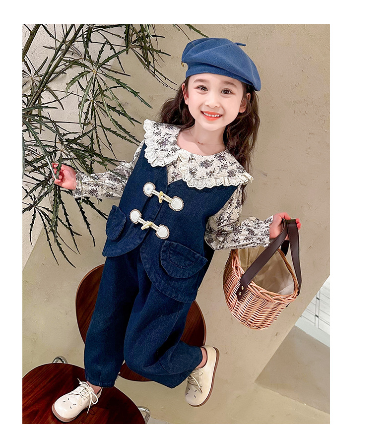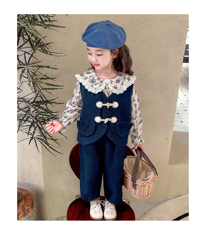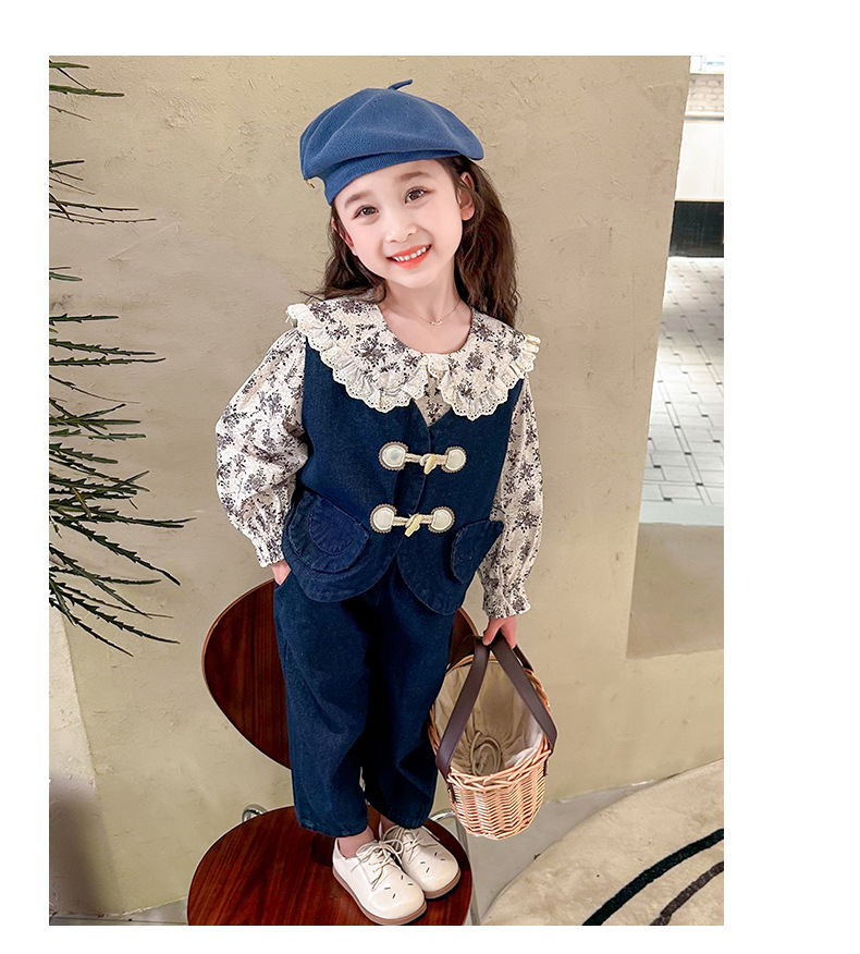 아기 소녀 봄 옷 새로운 중국 스타일의 데님 조끼 3 피스 세트 중소 규모. 어린이 달콤한 스타일 바닥 셔츠 느슨한 넓은 다리 바지스토어 가기