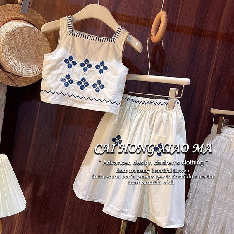 핑크 하우스 한국 아동복 2024 봄과 여름 새 여아 우아한 모리 세트 자수 조끼 탑 스커트스토어 가기