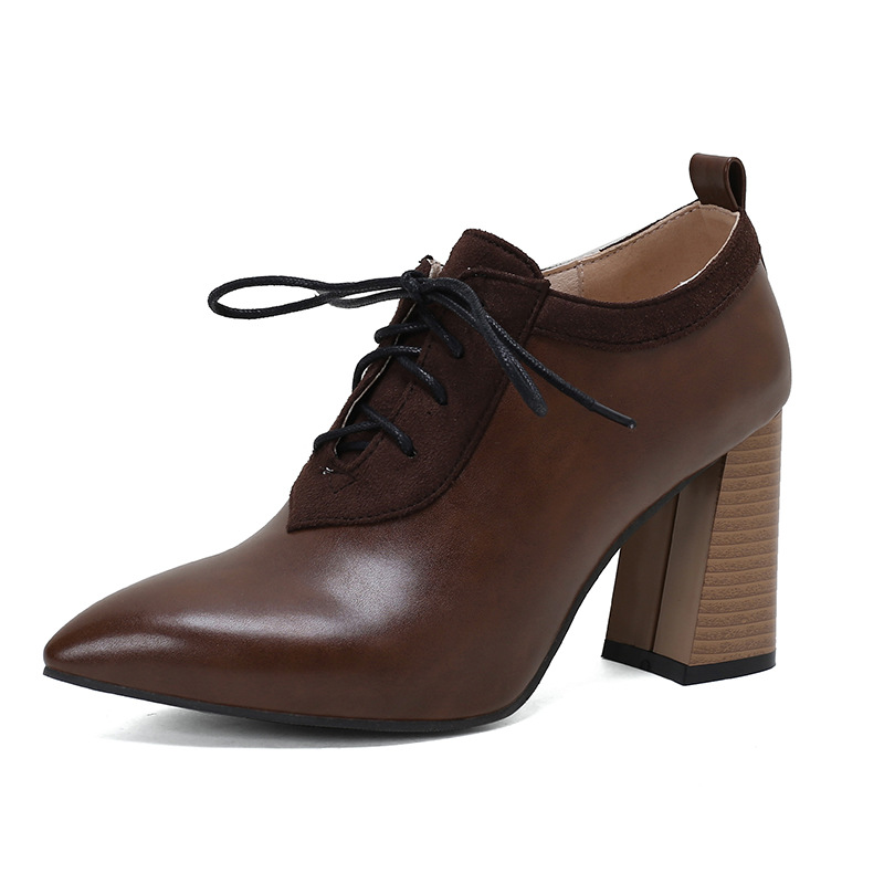 32-50 유럽 및 미국 대외 무역 국경 간 플러스 사이즈 여성 단층 신발 깊은 입 레이스 업 두꺼운 하이힐 뾰족한 로우 탑 신발 H379