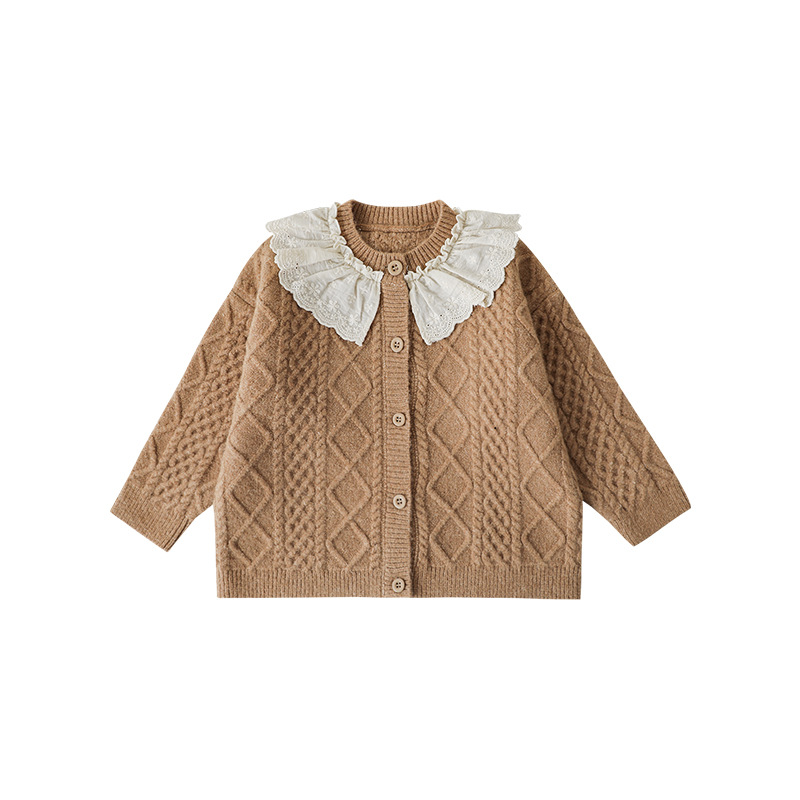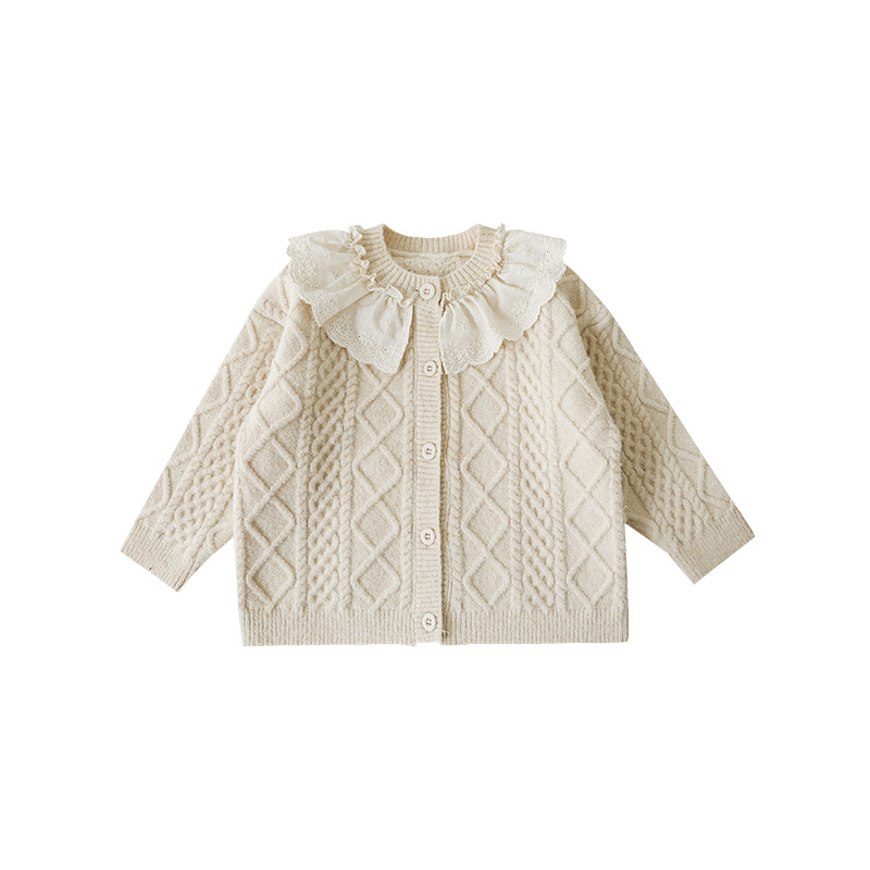 Qiudo 귀여운 소녀 패션 스웨터 카디건 2024 봄과 가을 새로운 어린이 한국 스타일 레이스 칼라 스웨터 코트