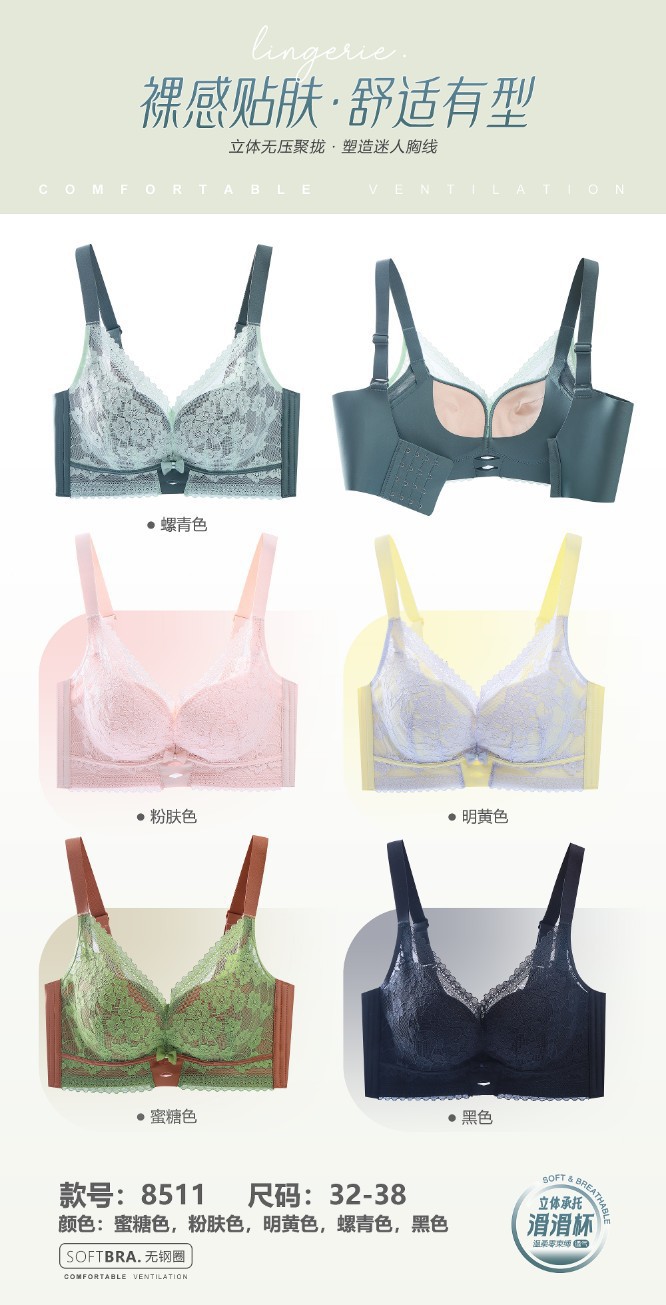曼琪莹8511上薄下厚滑滑杯无钢圈舒适文胸小胸聚拢收副乳蕾丝内衣
