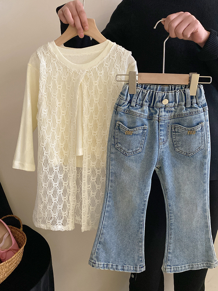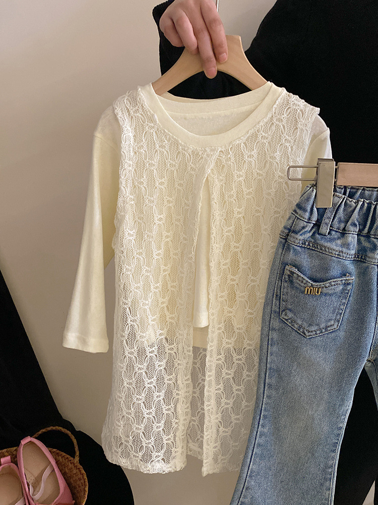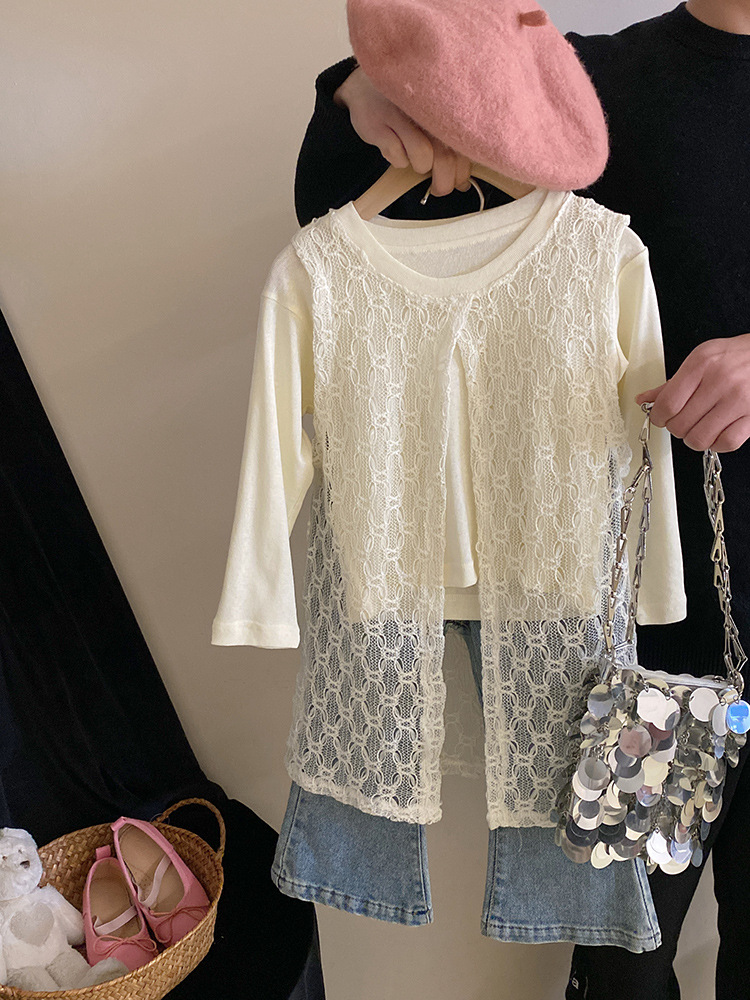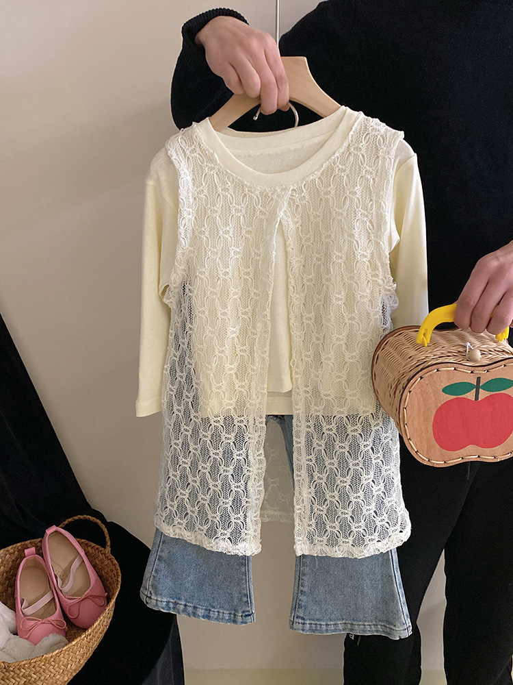 어린이 한국식 아동복 2024 봄 새 소녀 속이 빈 블라우스 탑 조끼 긴 소매 바닥 셔츠 투피스 세트스토어 가기