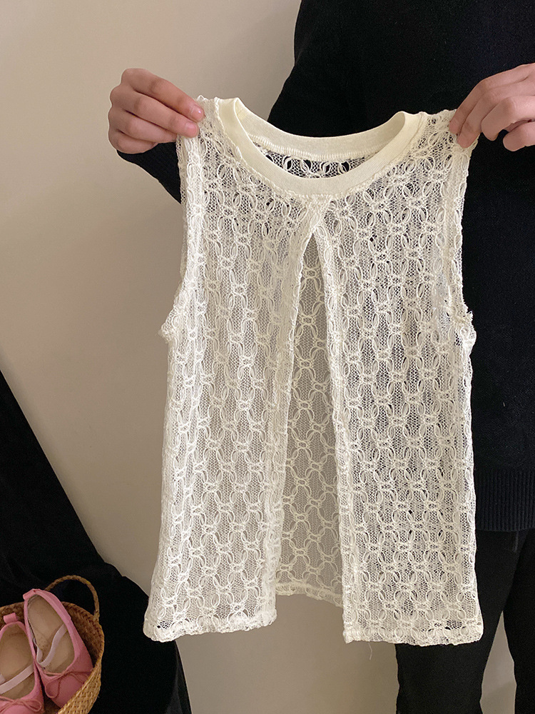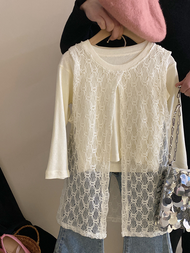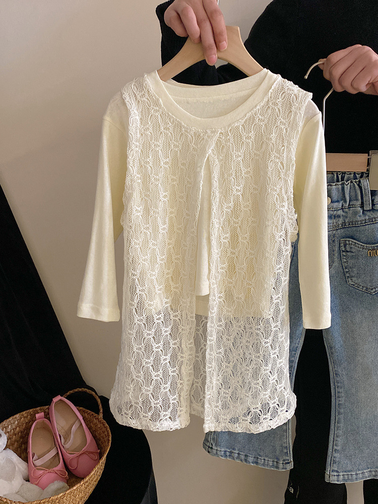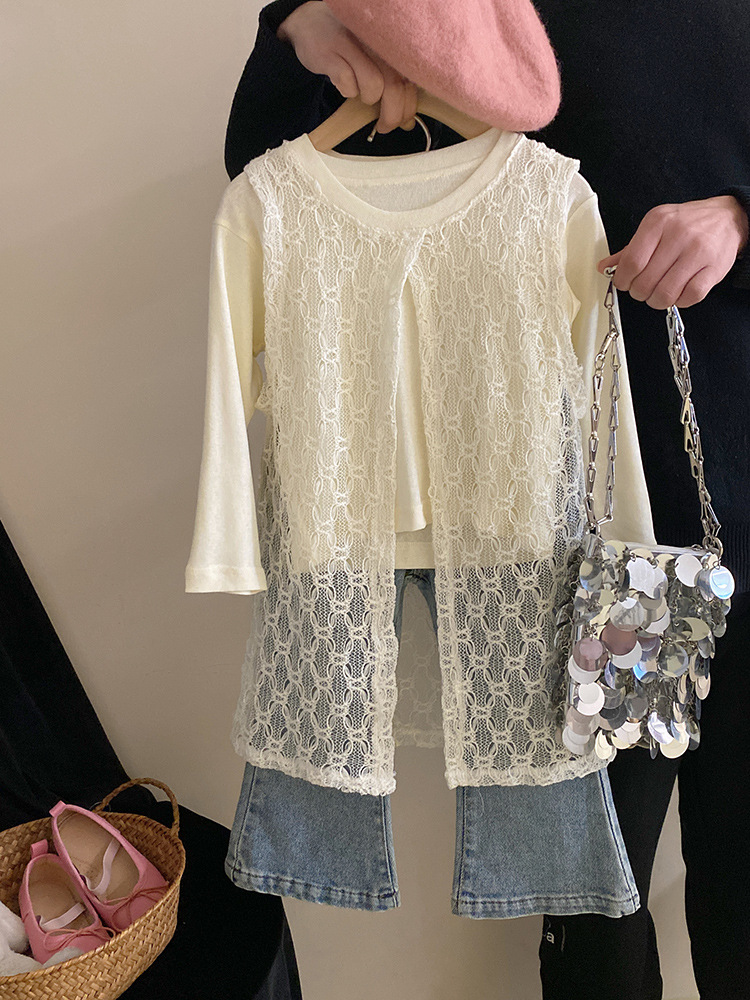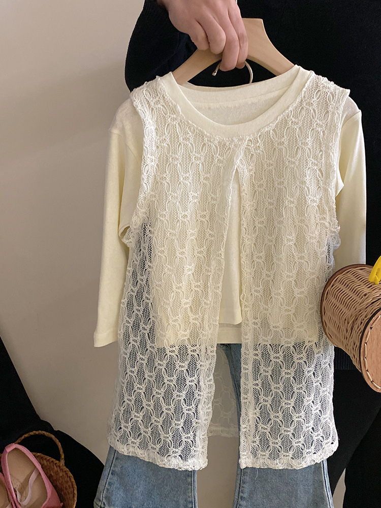 어린이 한국식 아동복 2024 봄 새 소녀 속이 빈 블라우스 탑 조끼 긴 소매 바닥 셔츠 투피스 세트