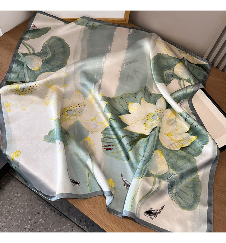 100% 뽕나무 실크 빈티지 녹색 연꽃 일반 실크 스카프 항주 크레이프 새틴 스퀘어 스카프 다용도 장식 스카프스토어 가기