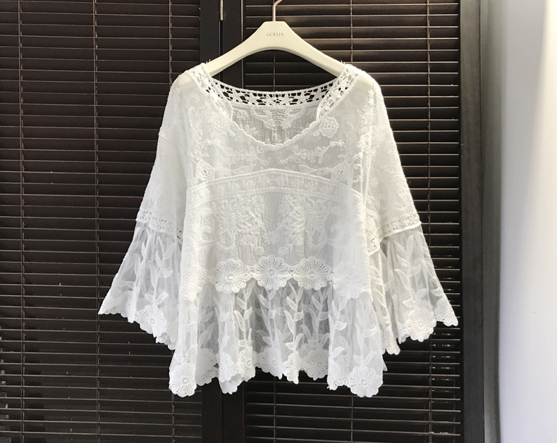 벨 슬리브 탑 인형 셔츠 풀오버 태양 보호 외부 블라우스 여성의 봄과 여름 화이트 메쉬 레이스 짧은 쉬폰 셔츠스토어 가기
