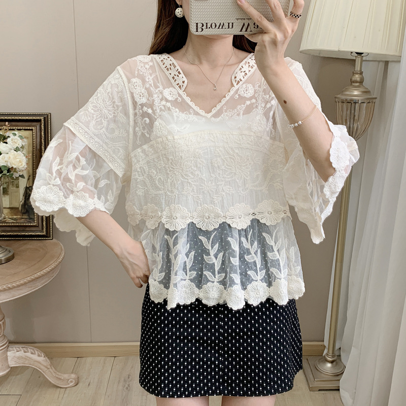 벨 슬리브 탑 인형 셔츠 풀오버 태양 보호 외부 블라우스 여성의 봄과 여름 화이트 메쉬 레이스 짧은 쉬폰 셔츠