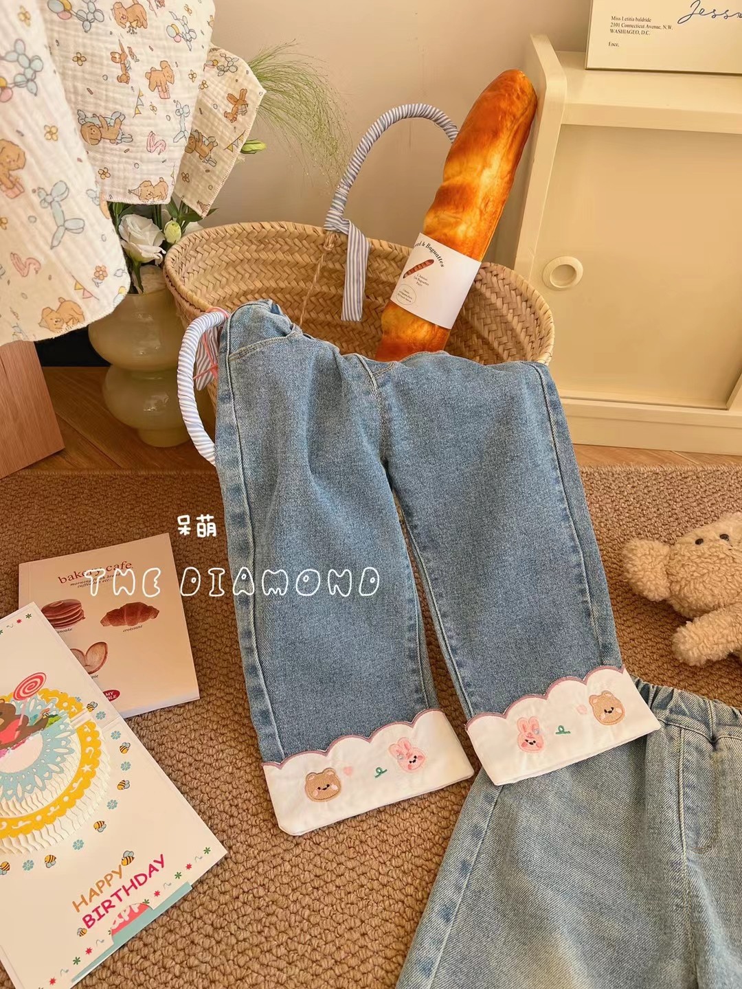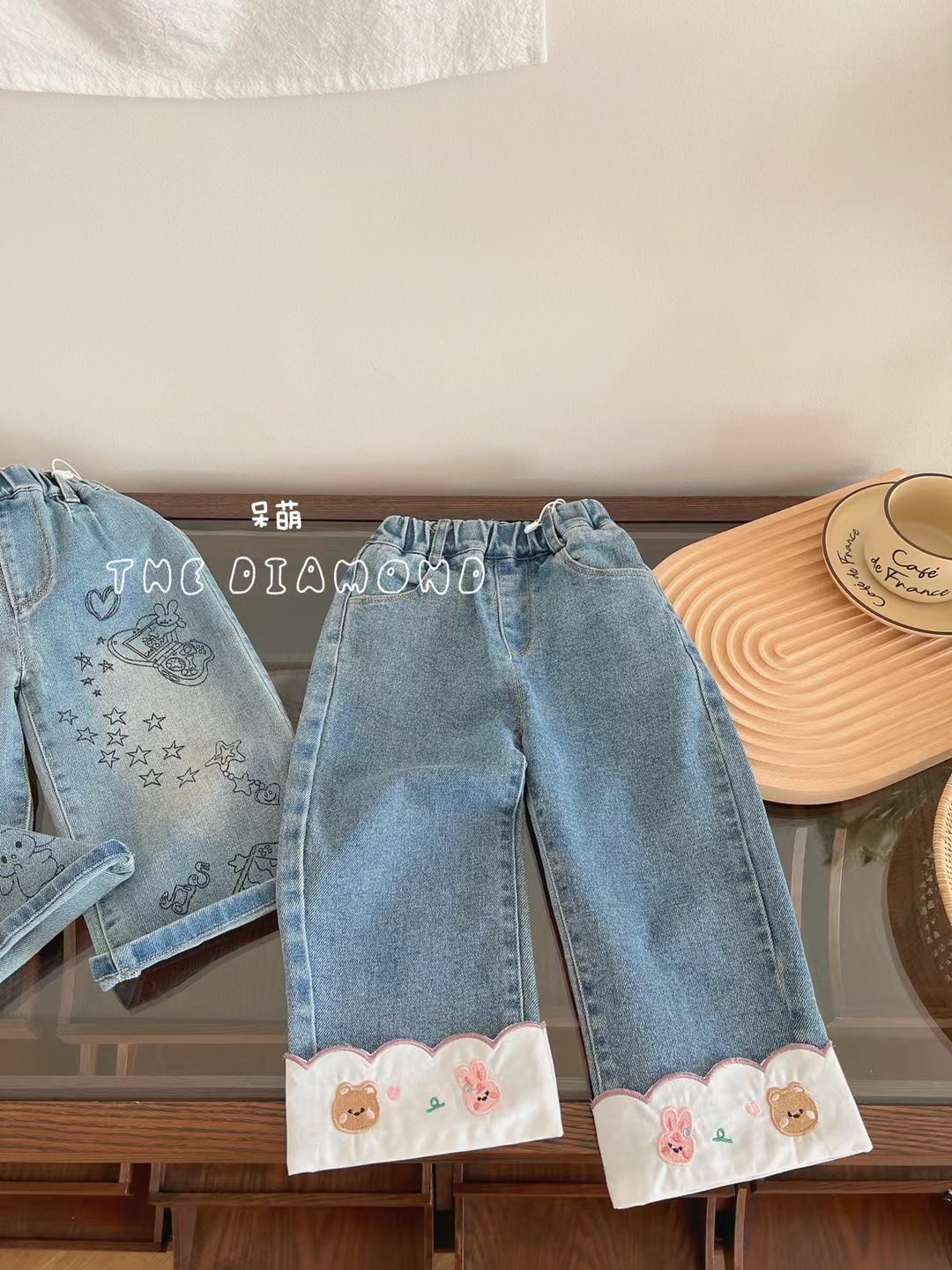 통 싱위안 걸스 슈퍼 귀여운 수놓은 주름 청바지 여자 한국식 스트레이트 바지 올매치 부드럽고 편안한스토어 가기