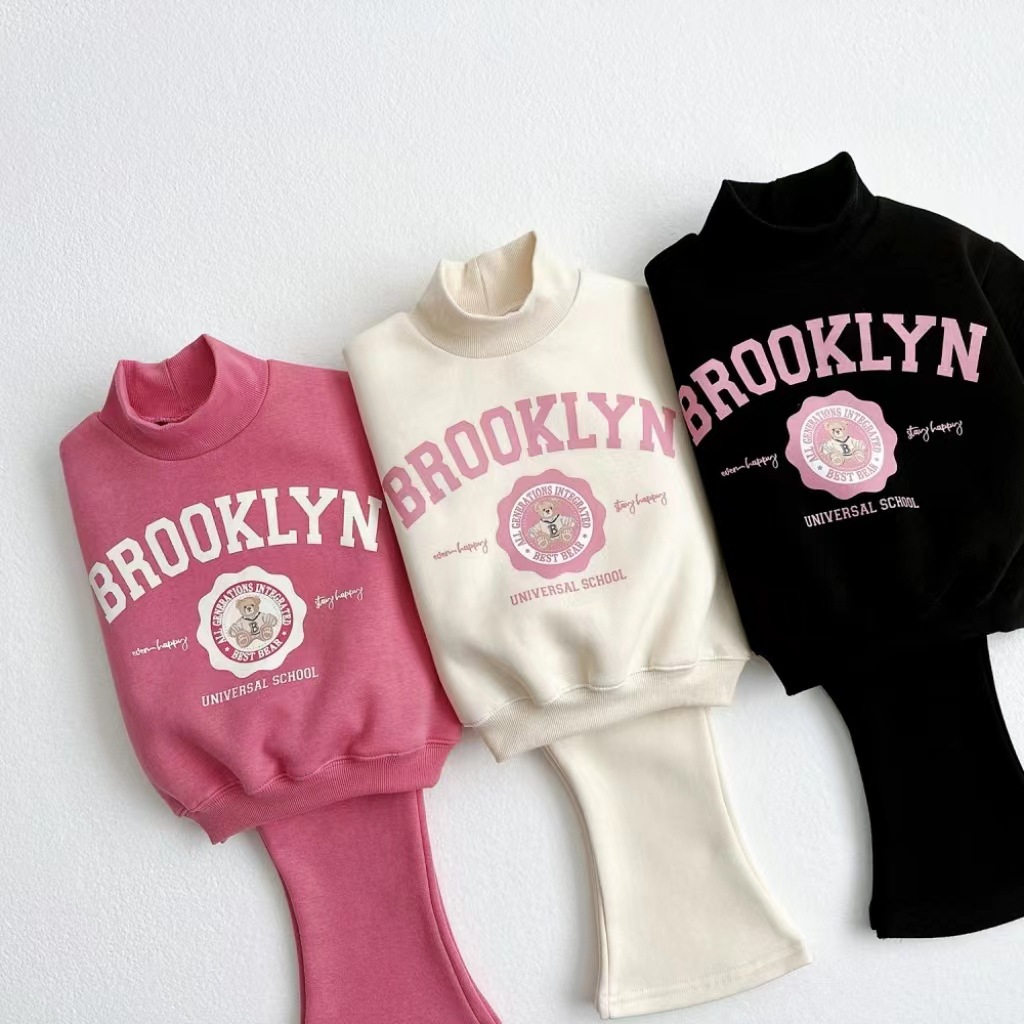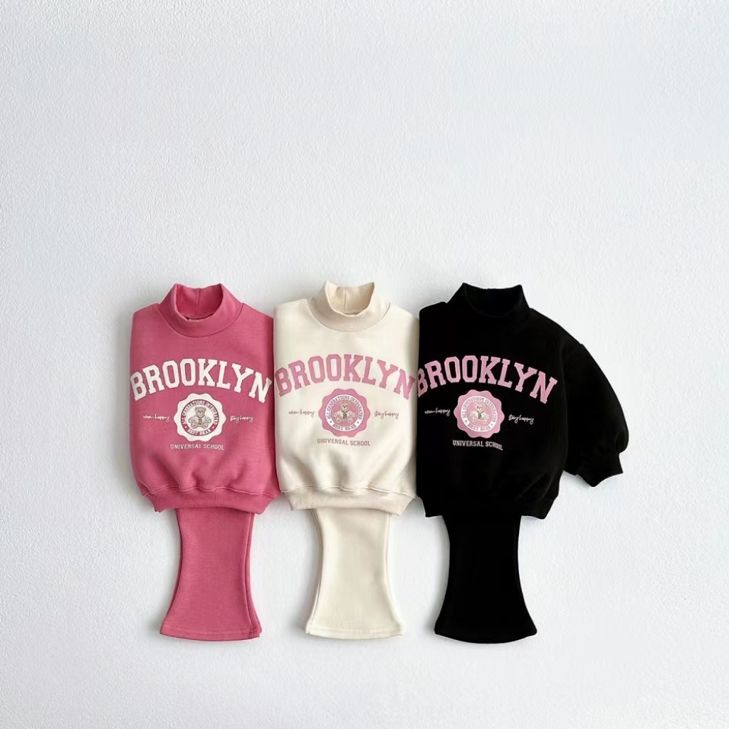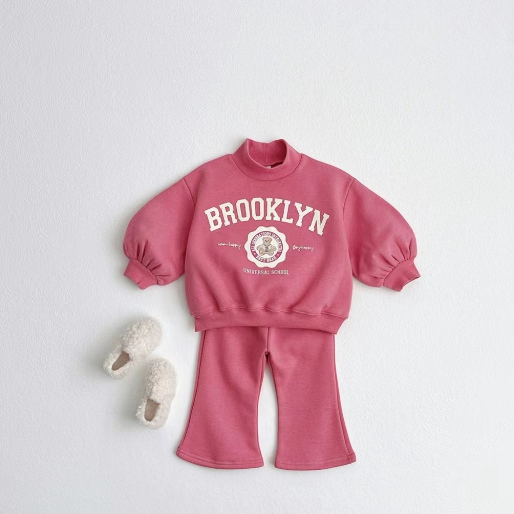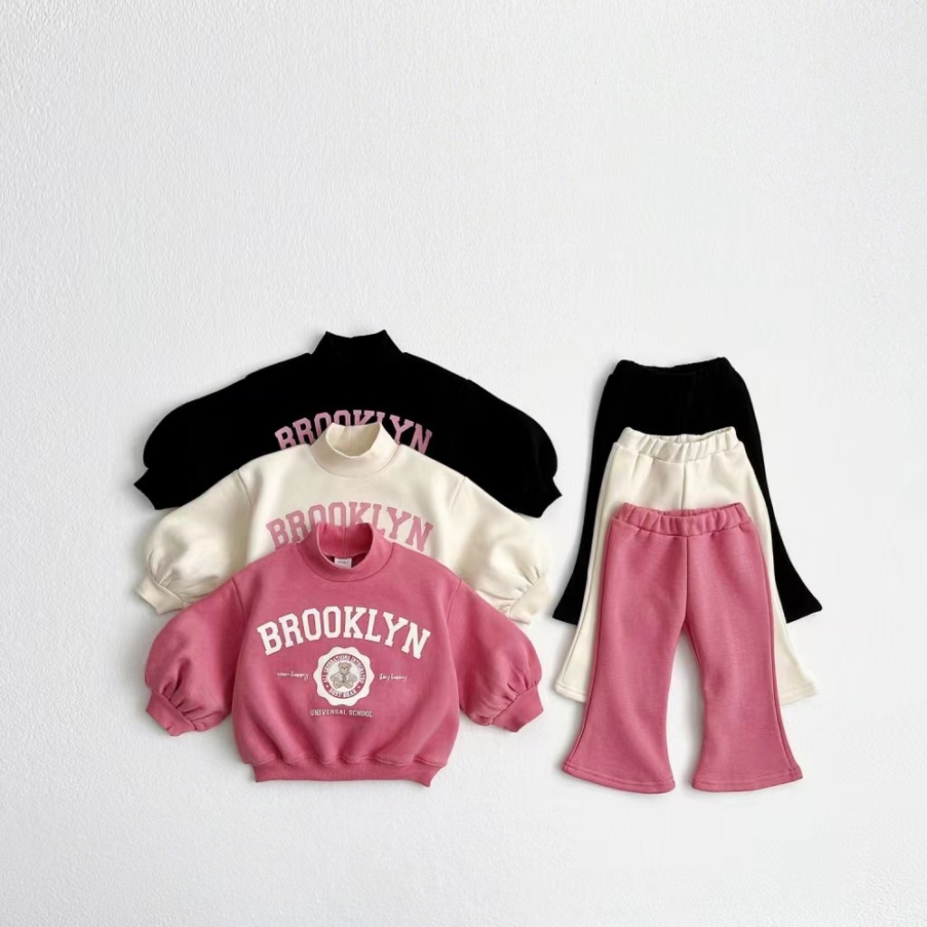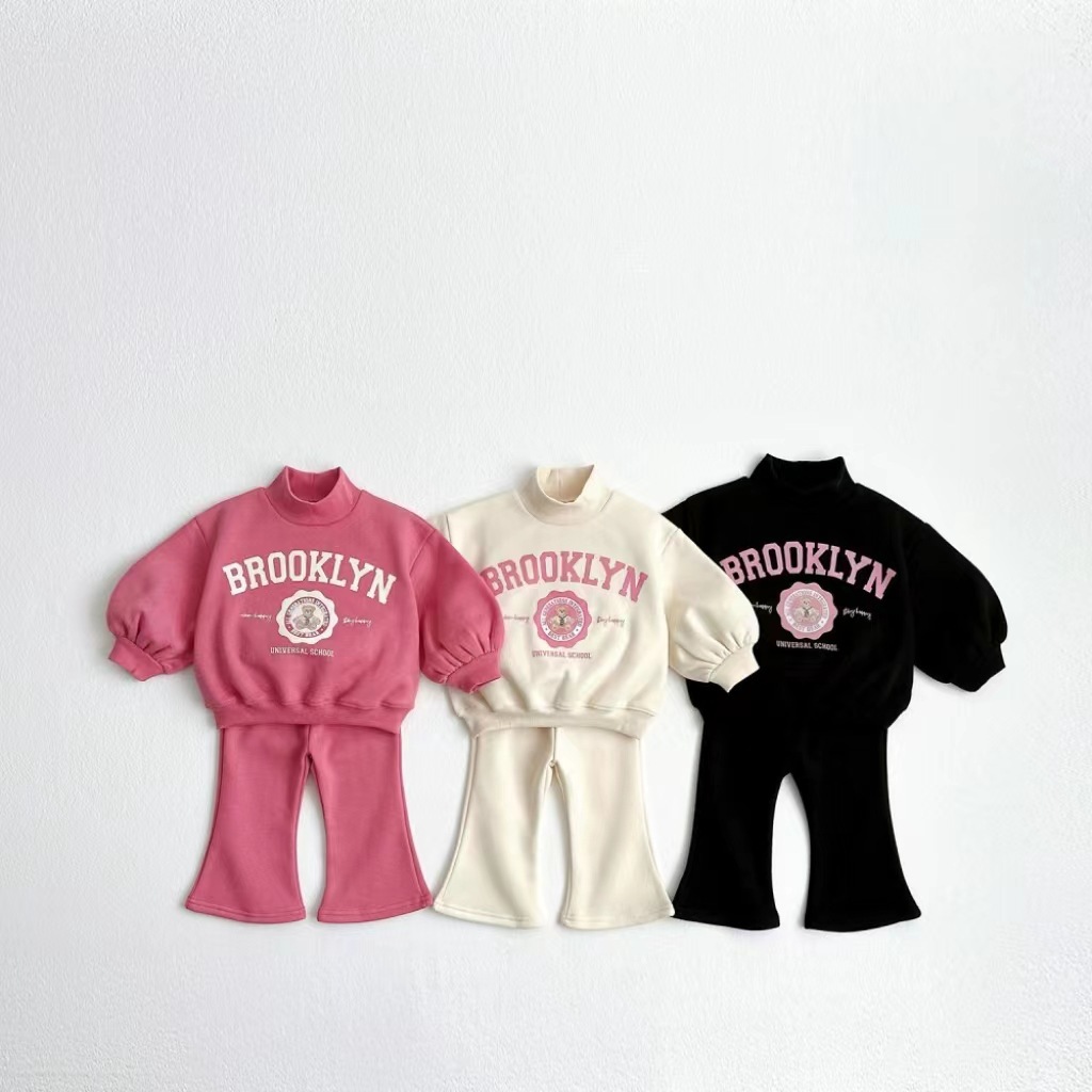 한국판 25 아기용 스탠드 칼라 레터링 스웨트셔츠와 나팔바지 캐주얼 가을 겨울 세트