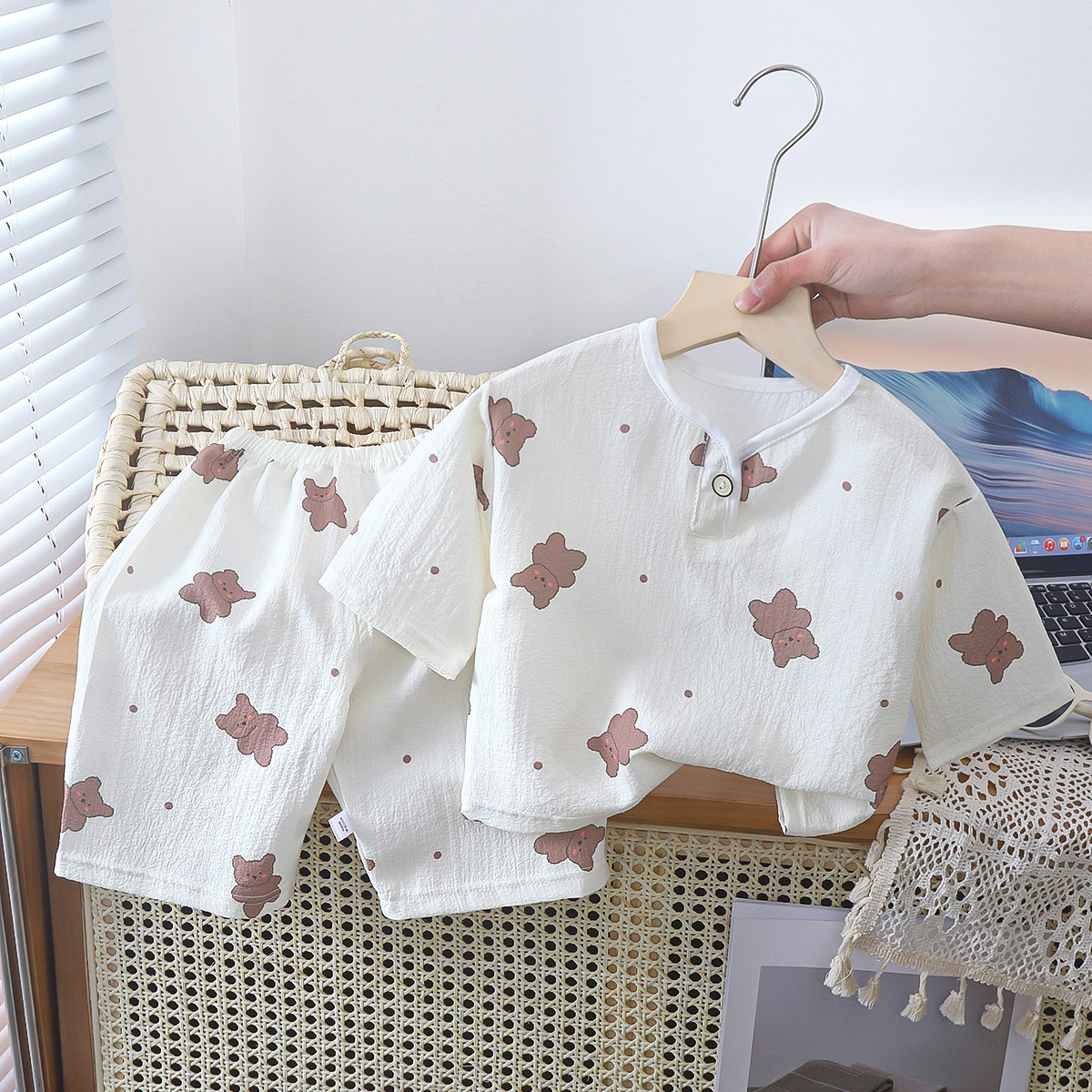 어린이 잠옷 여름 얇은 소년 자른 슬리브 자른 바지 버블 코튼 세트 여자 홈 옷 어린이 여름 옷