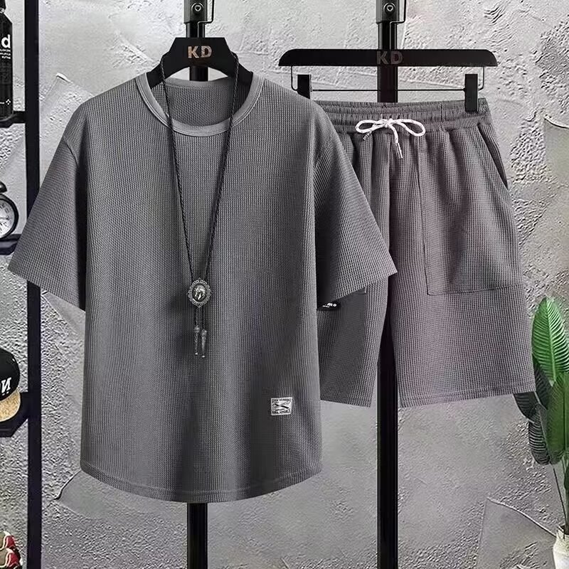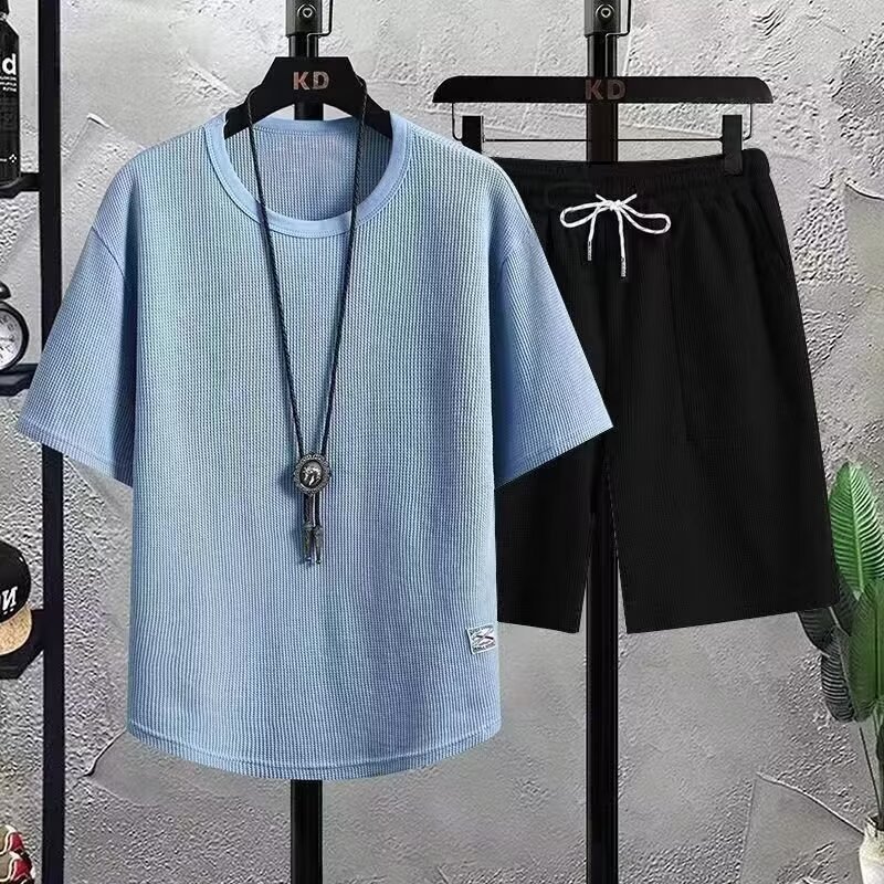 와플 캐주얼 스포츠 세트 남자 여름 반팔 반바지 투피스 느슨한 대형 십대 유행 잘 생긴스토어 가기
