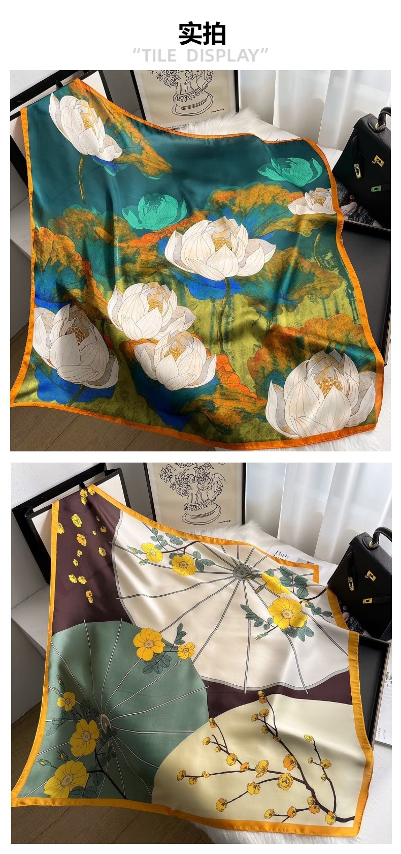 봄과 여름 2024 새로운 패션 올매치 인쇄 실크 스카프 우아한 우아한 실크 터번 90cm 여성용 대형 스퀘어 스카프스토어 가기