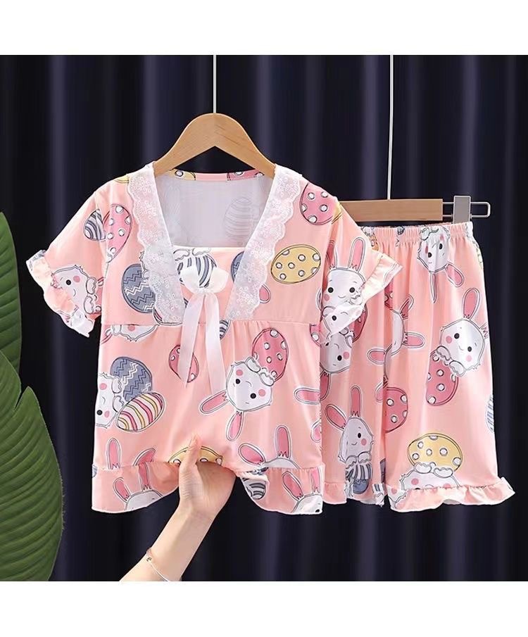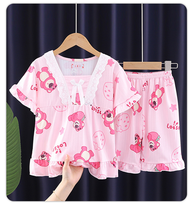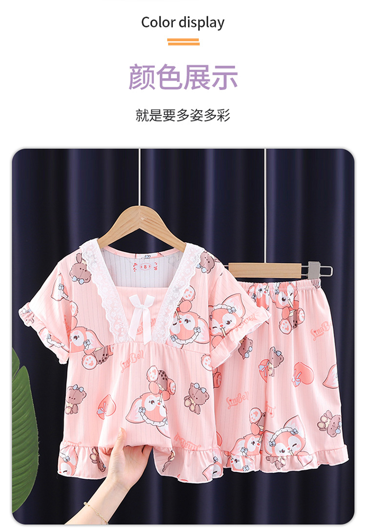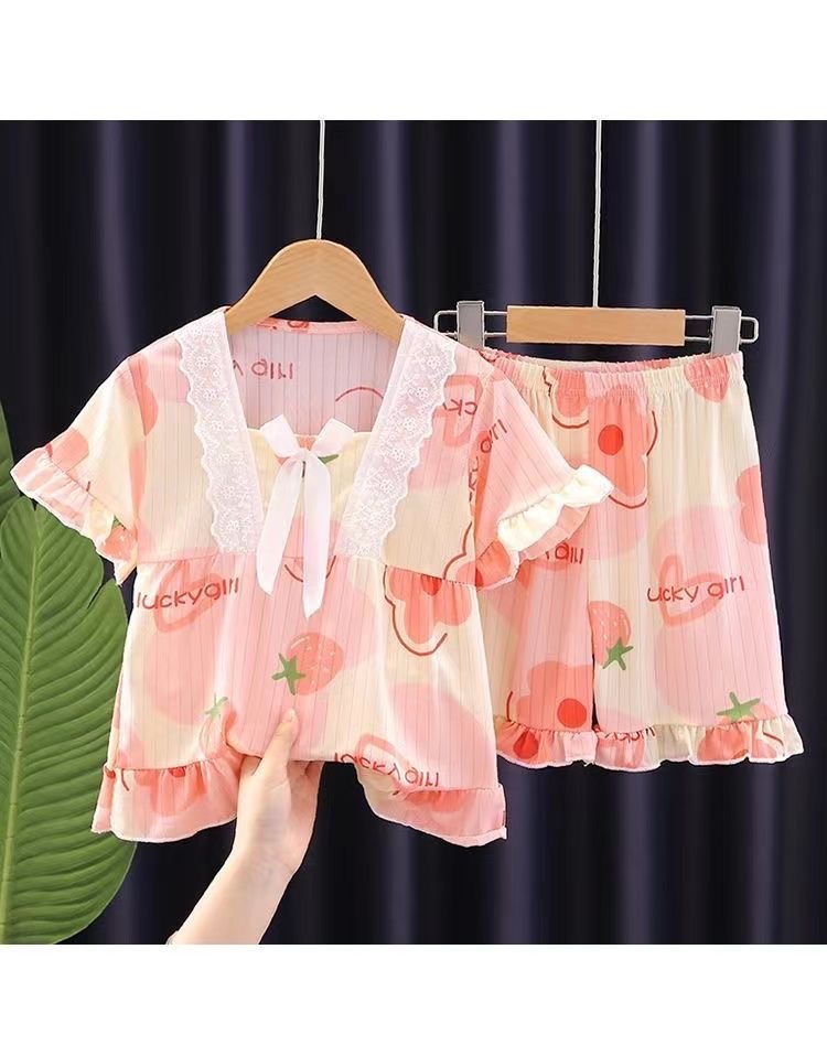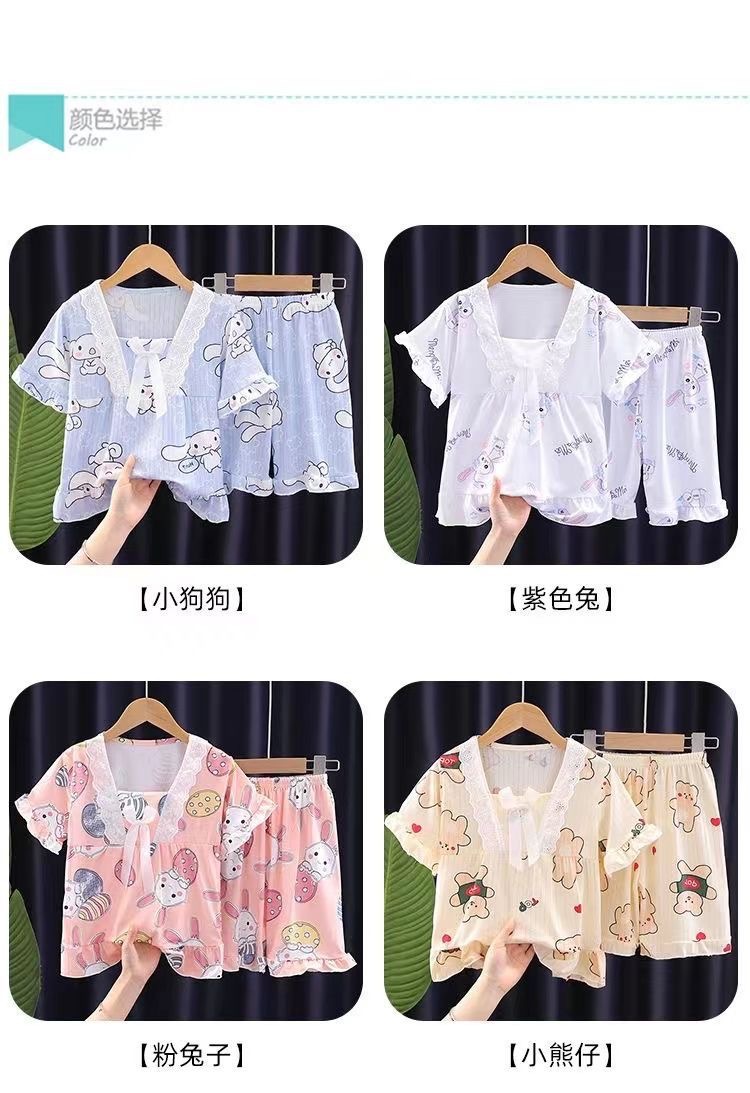 2024 반팔 피트 밀크 실크 여름 어린이 잠옷 레이스 반팔 사각 칼라 소녀의 중대형 아동용 홈웨어스토어 가기