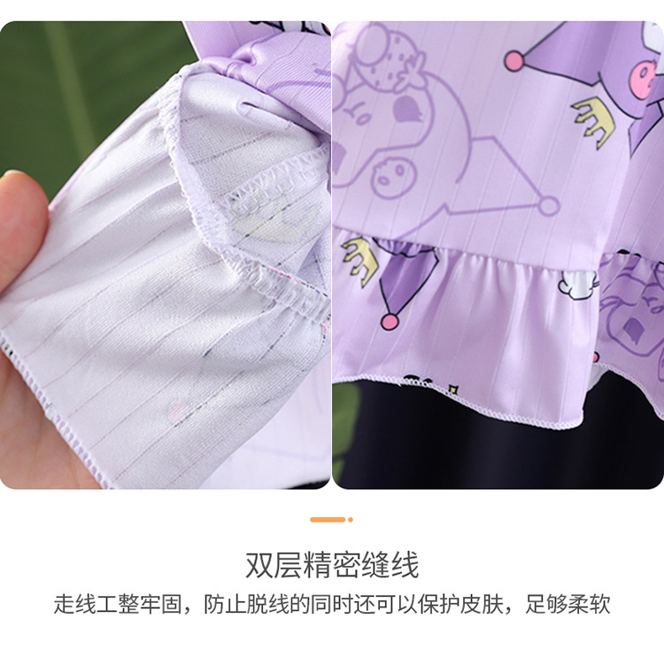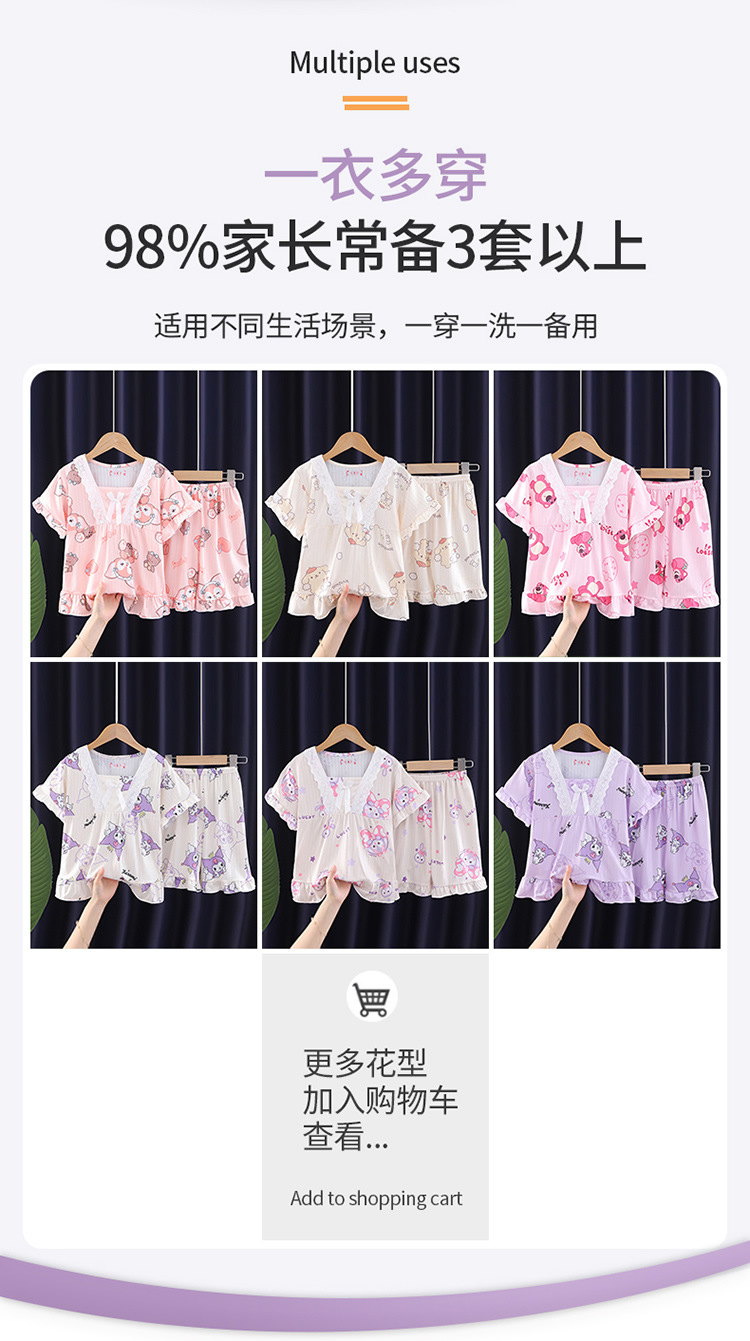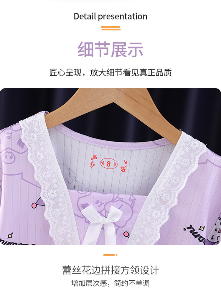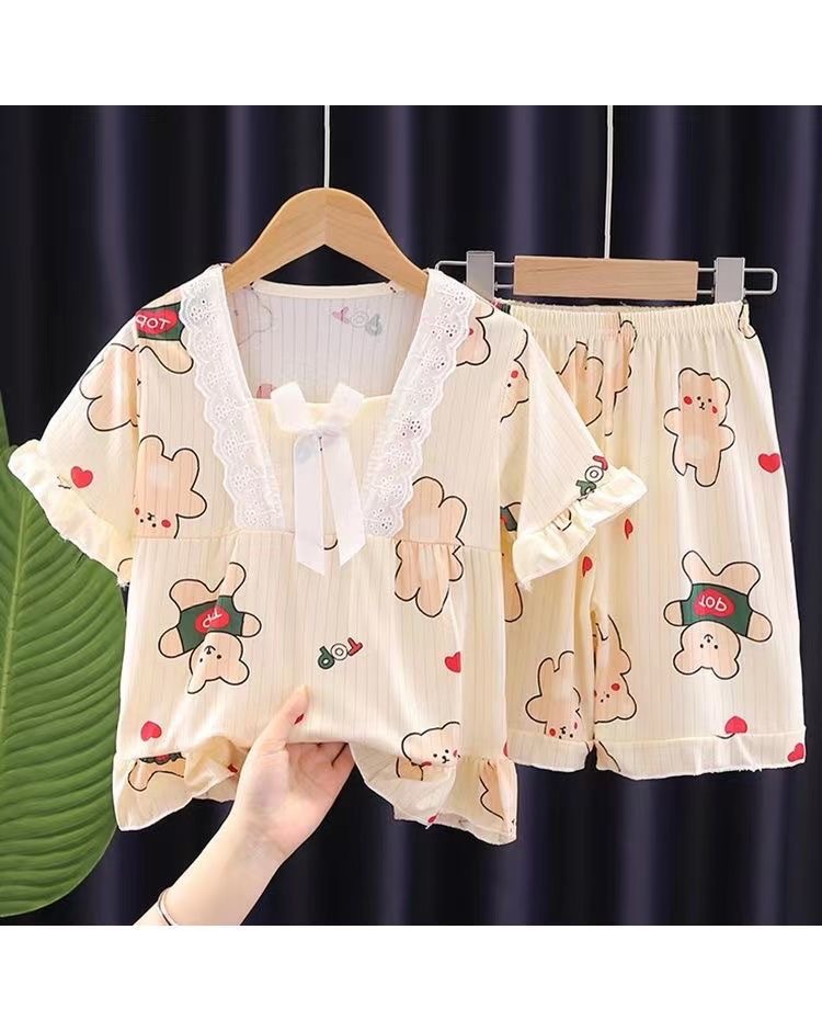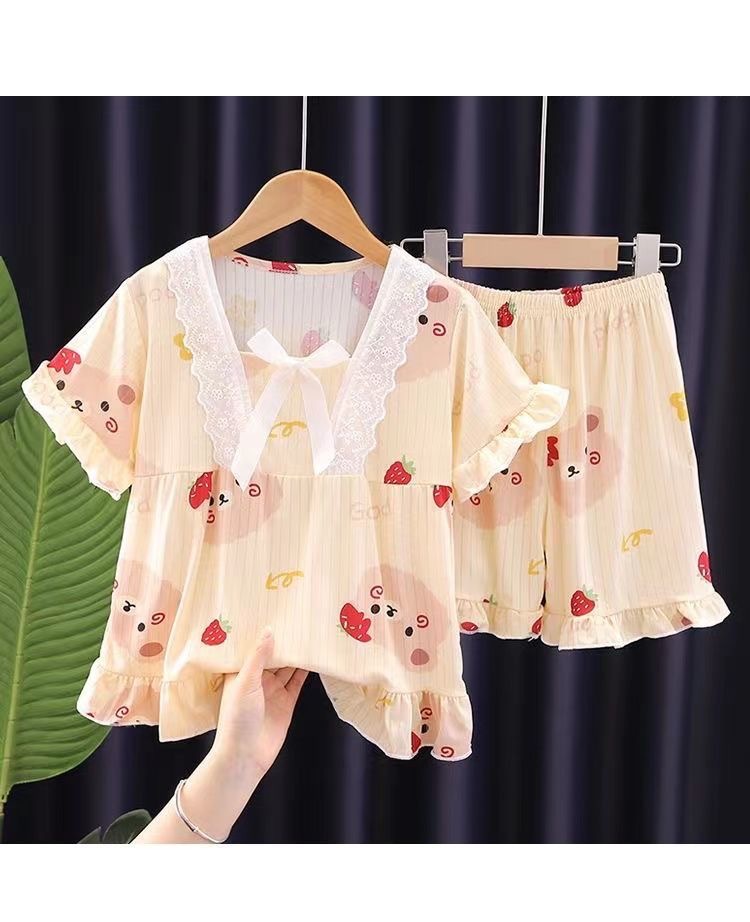 2024 반팔 피트 밀크 실크 여름 어린이 잠옷 레이스 반팔 사각 칼라 소녀의 중대형 아동용 홈웨어스토어 가기