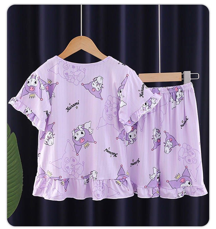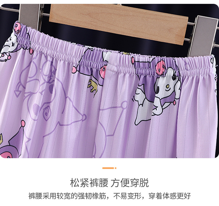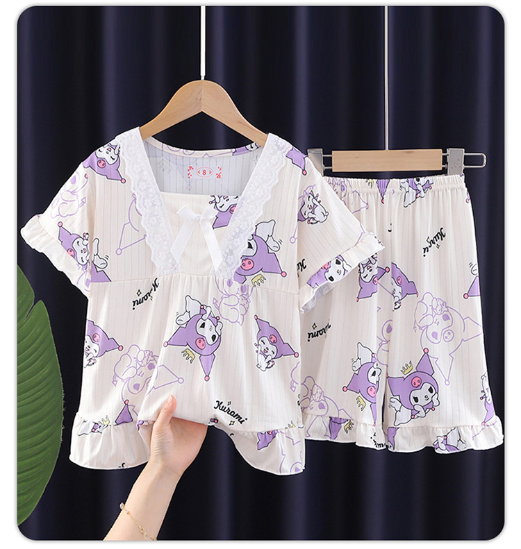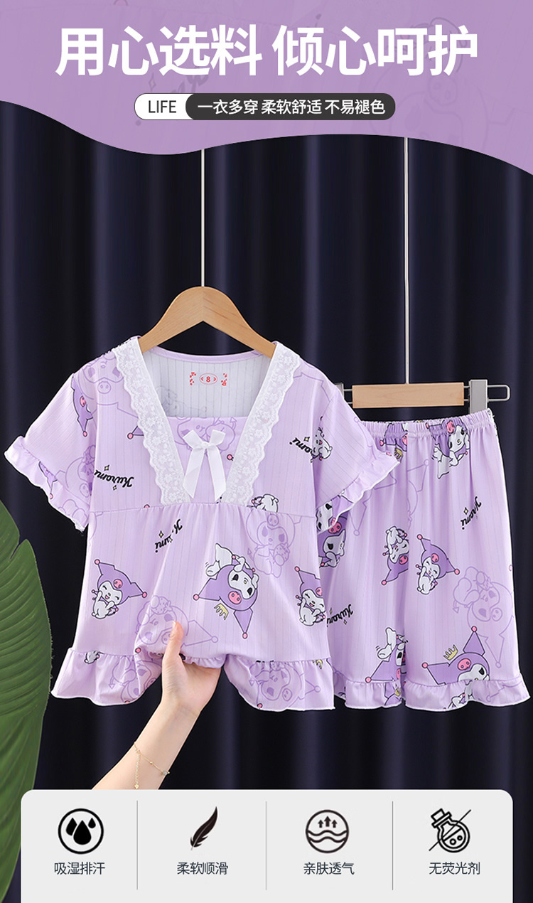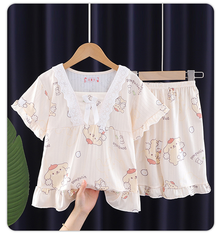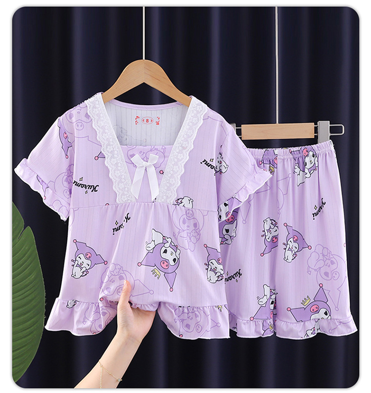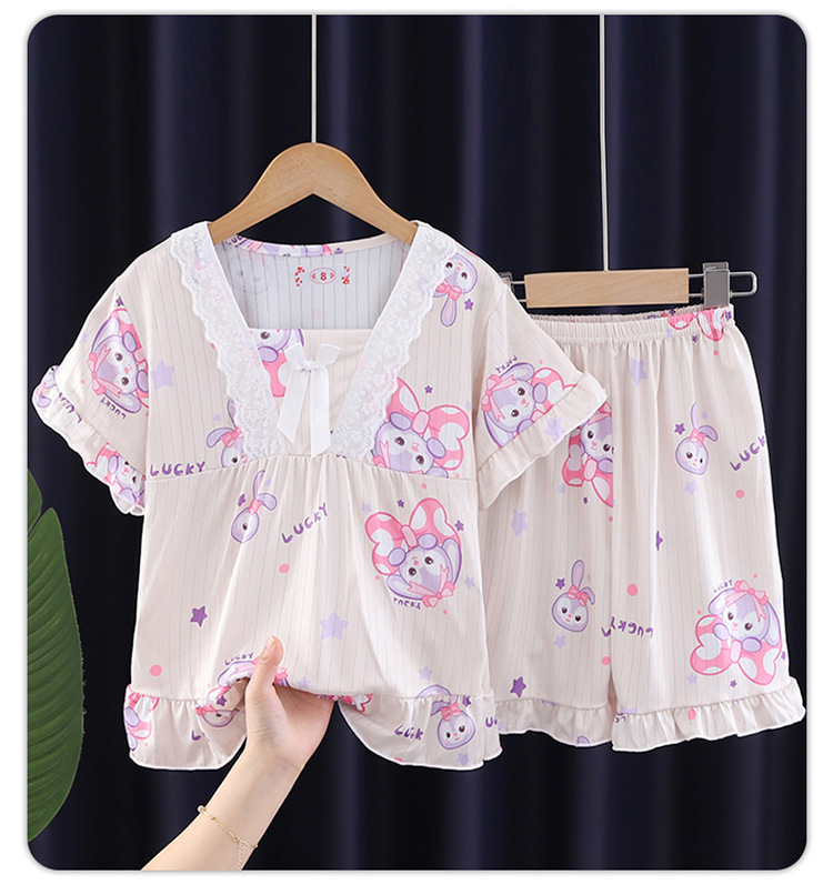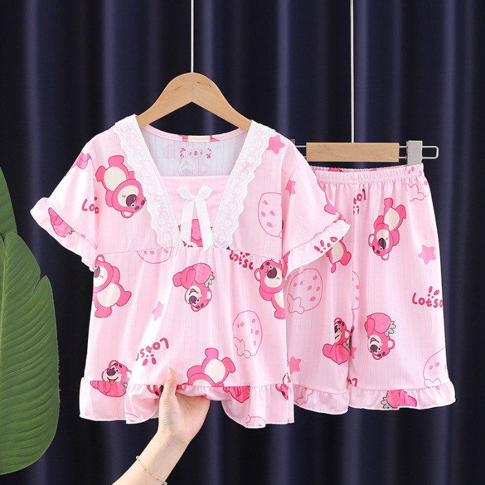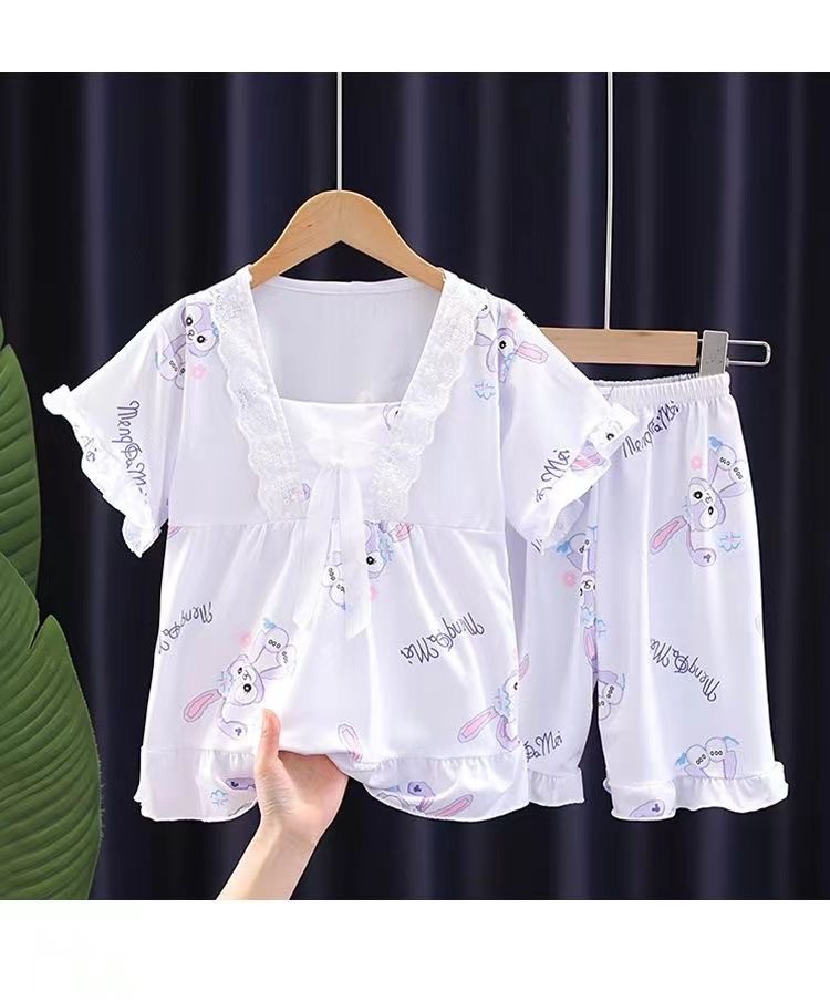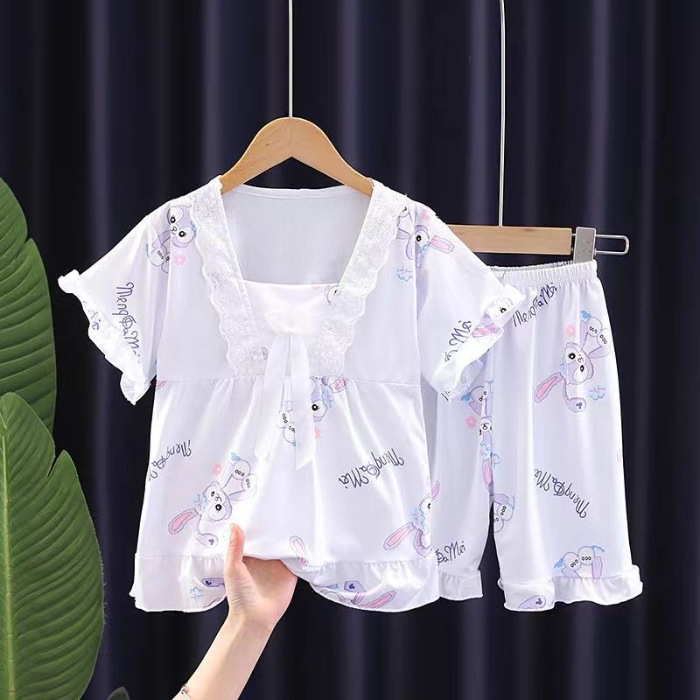 2024 반팔 피트 밀크 실크 여름 어린이 잠옷 레이스 반팔 사각 칼라 소녀의 중대형 아동용 홈웨어