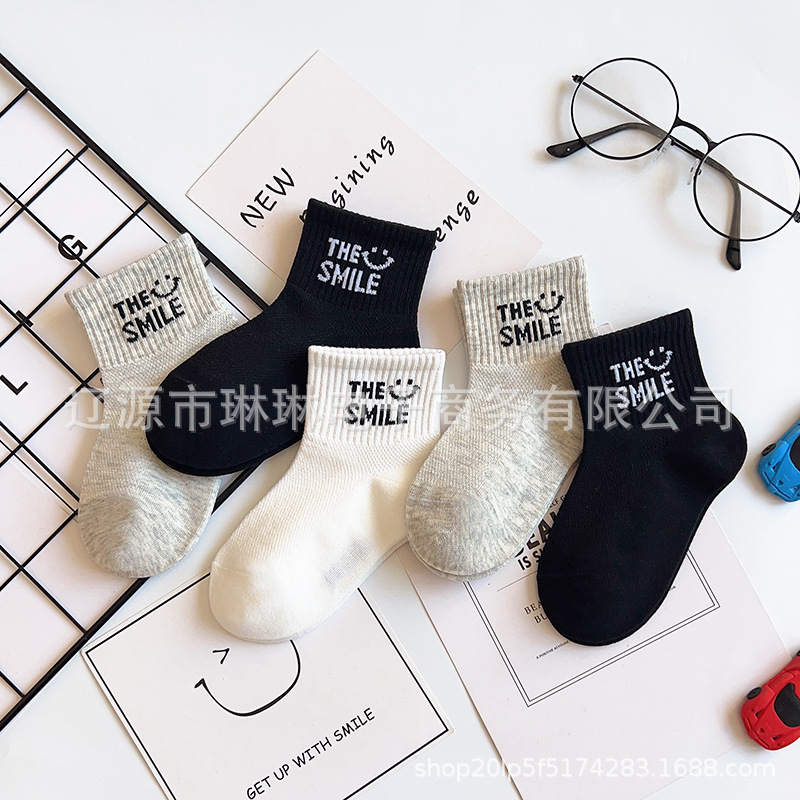 사랑의 진드기 어린이 양말 제조 업체 도매 재고 봄과 여름 얇은 메쉬 통기성 흑백 회색 문자 짧은 튜브 양말