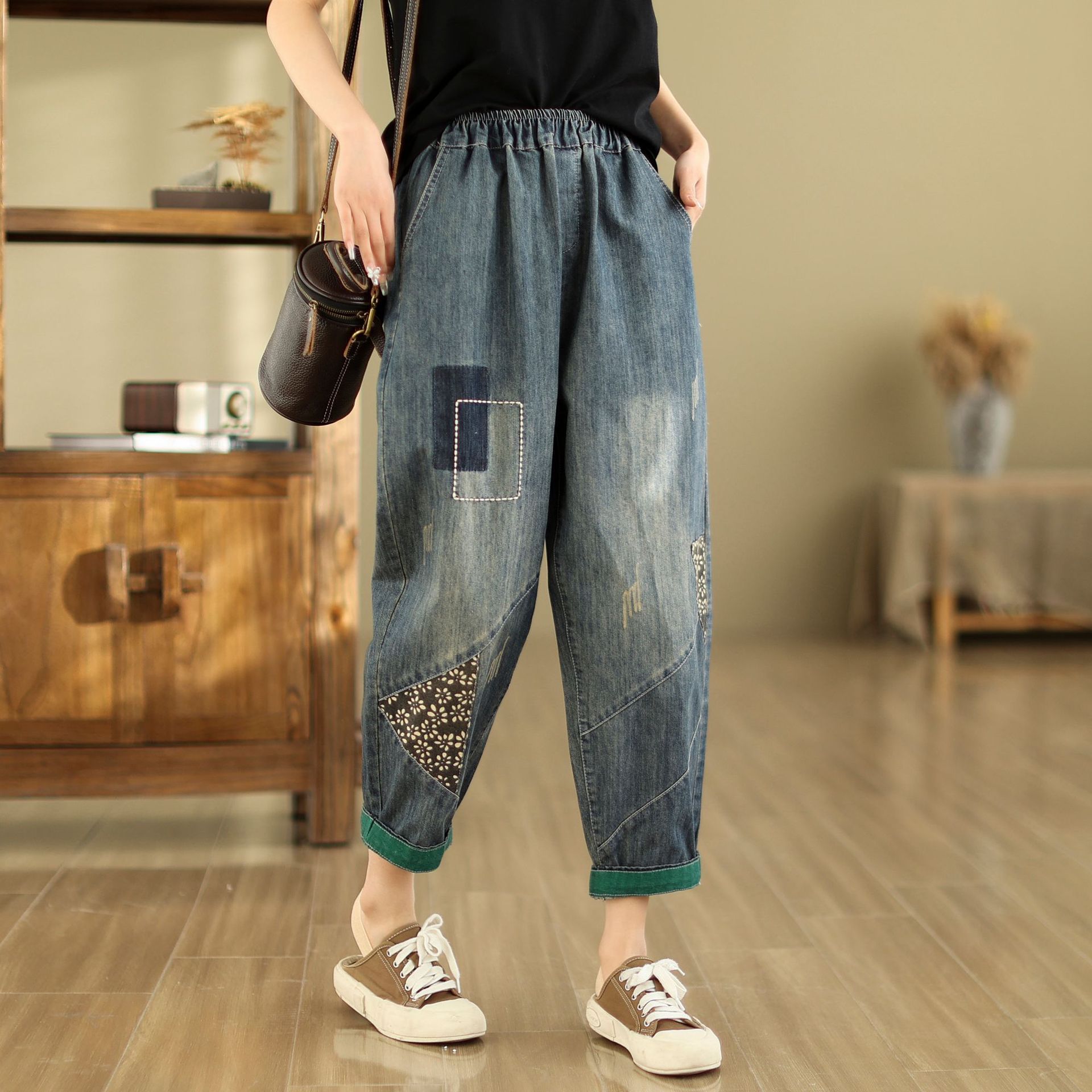 한국 스타일의 새로운 캐주얼 하렘 아빠 바지 여성 자수 예술 여성 자른 바지 느슨한 플러스 사이즈 청바지 여성스토어 가기
