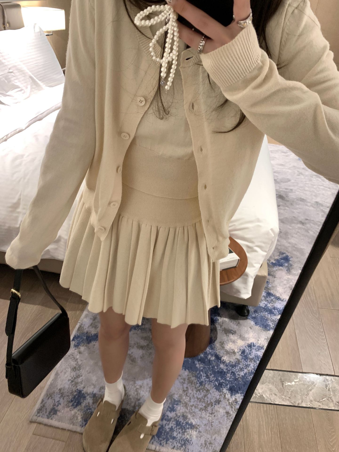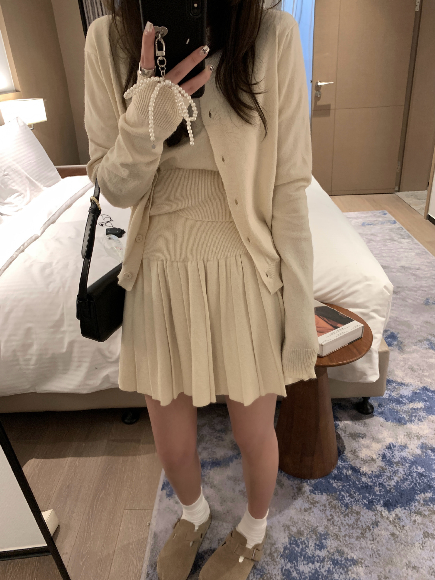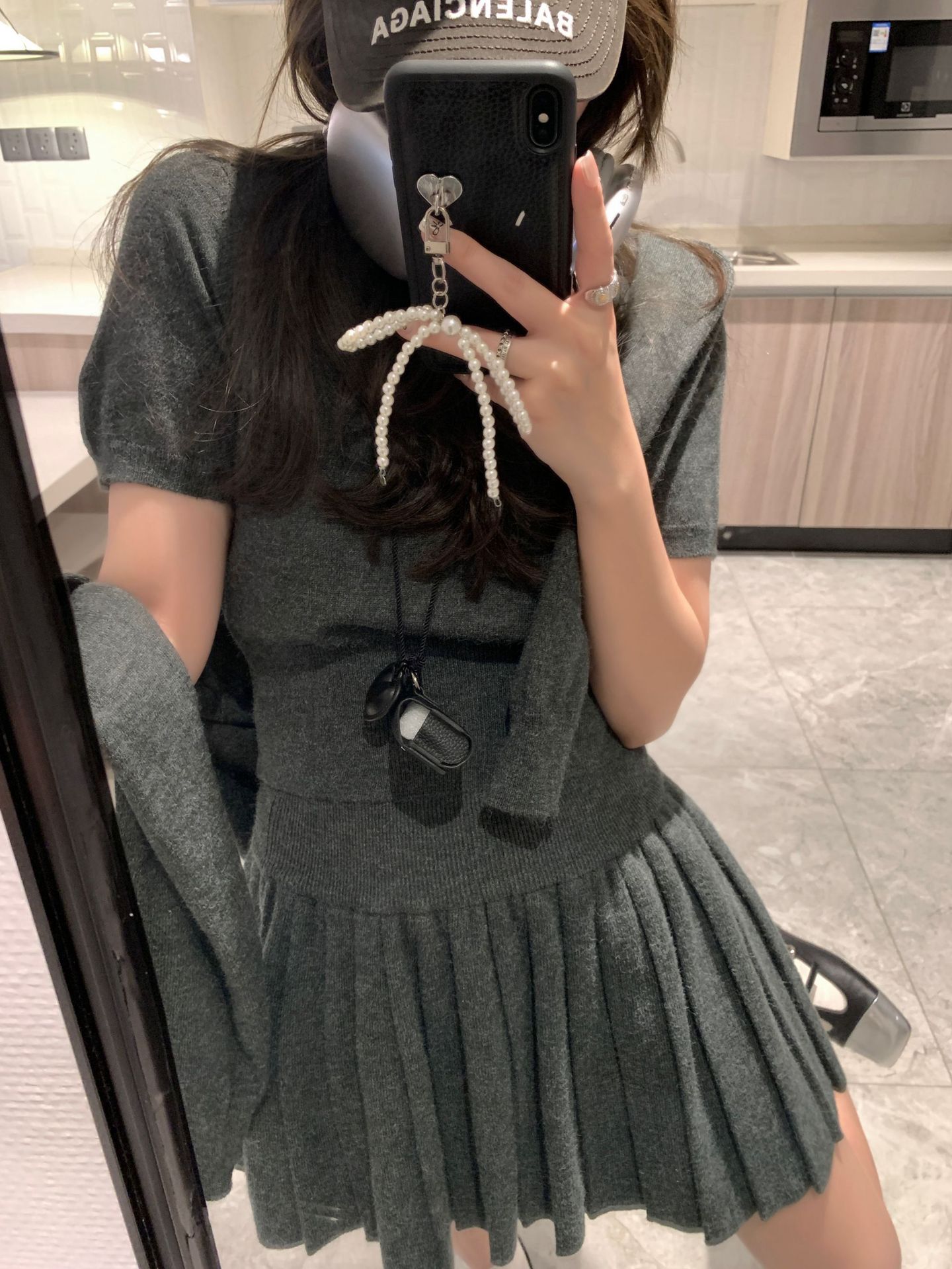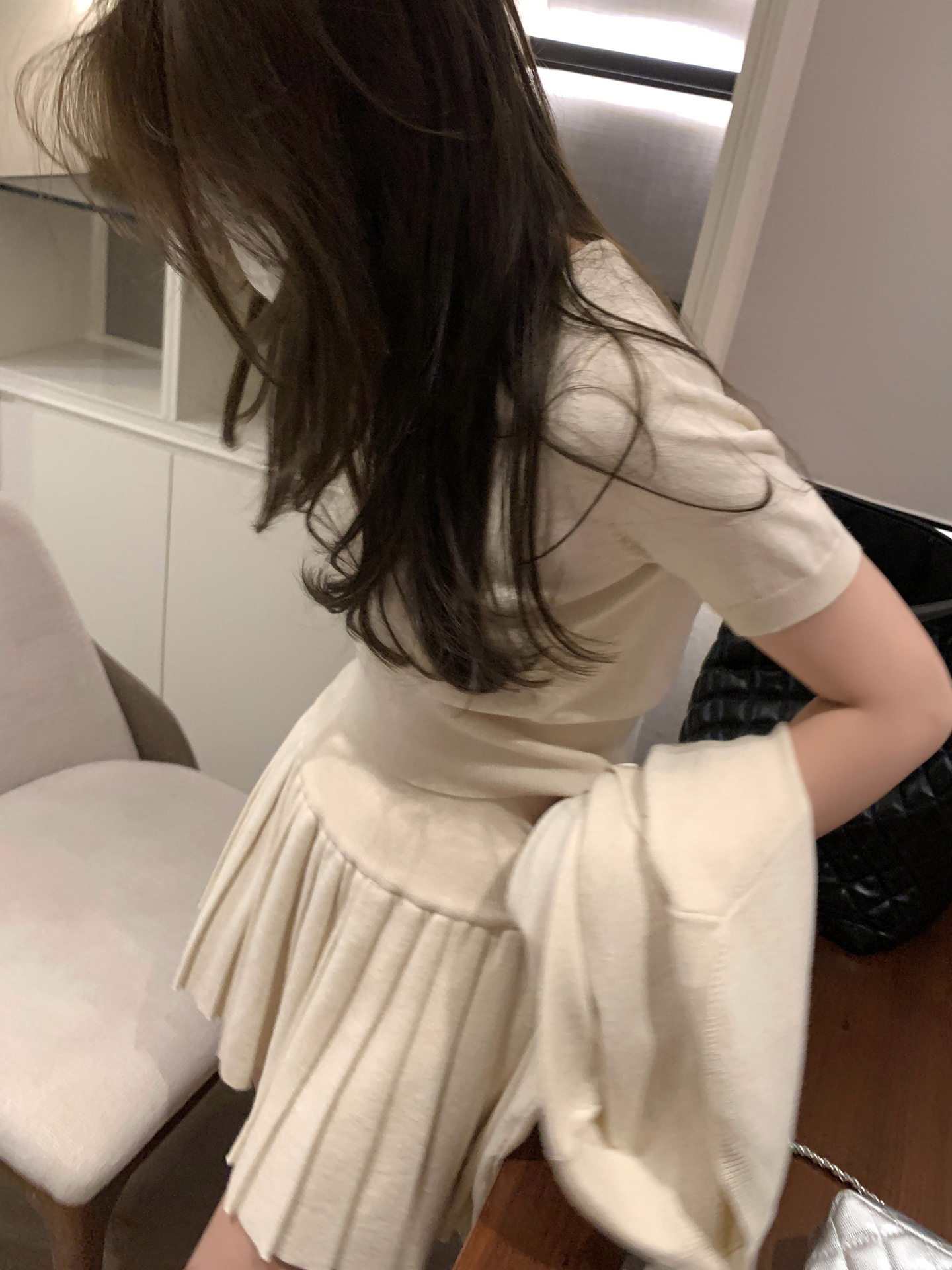 里面短袖针织外面小开衫搭配百褶短裙