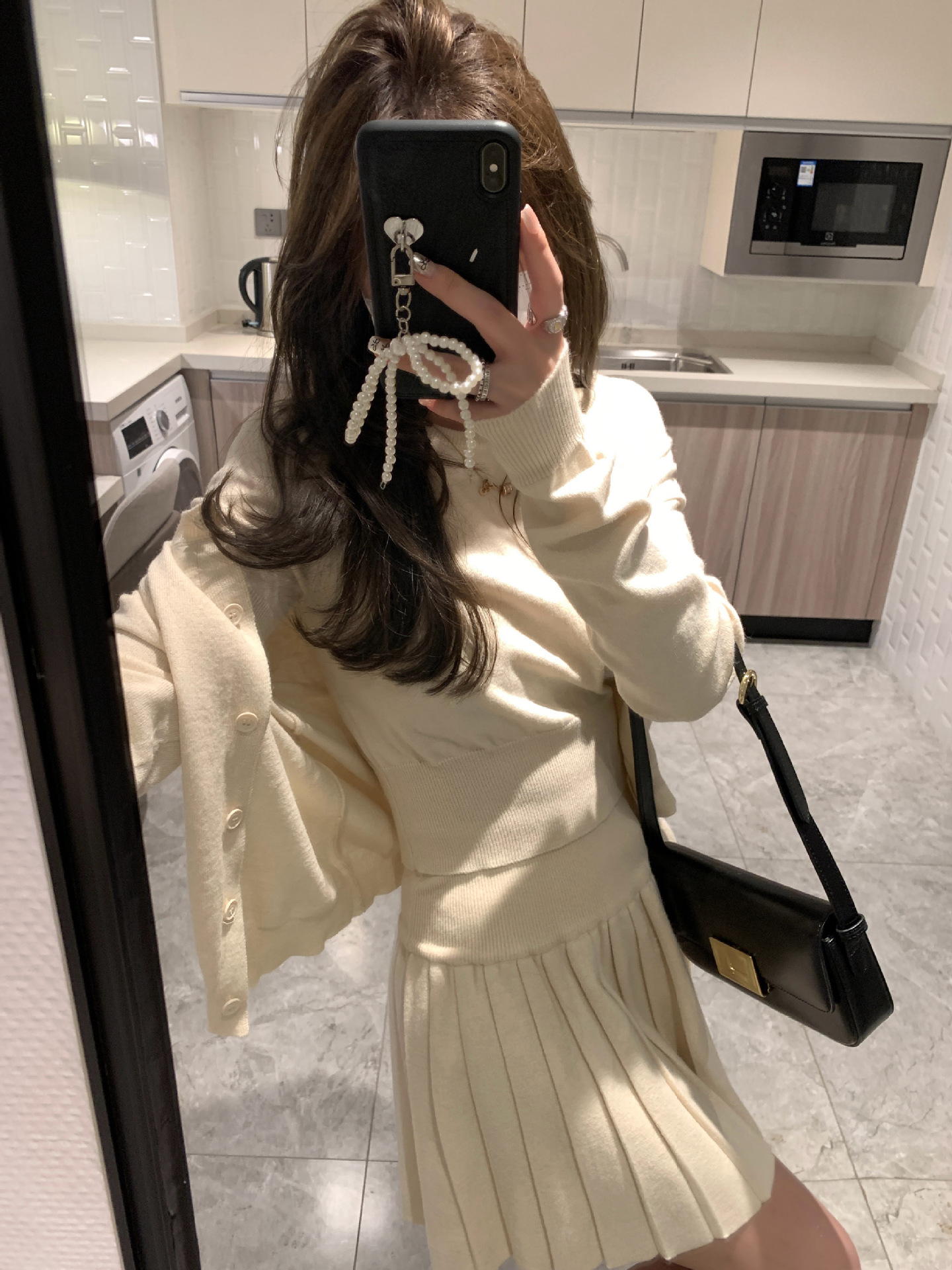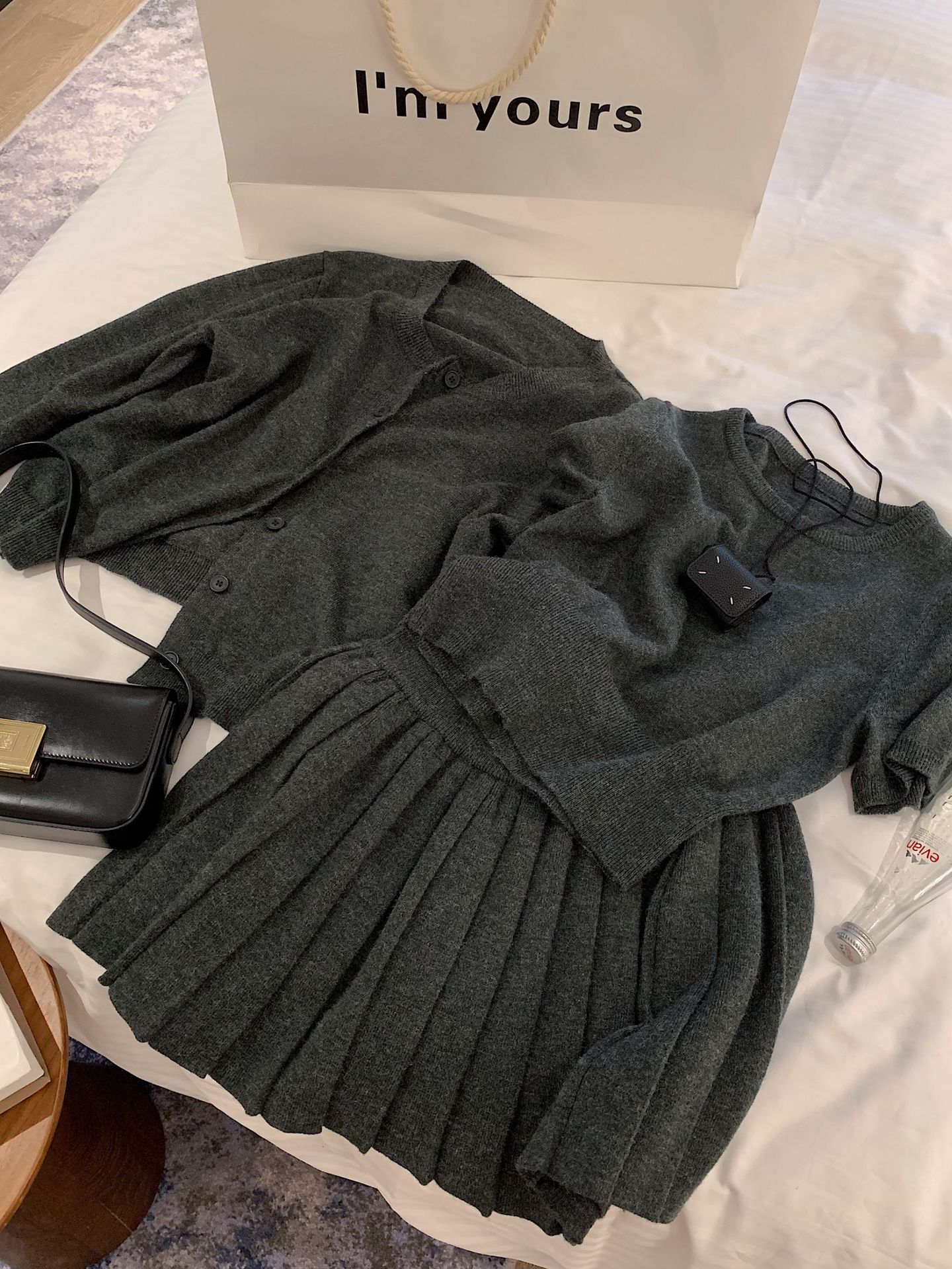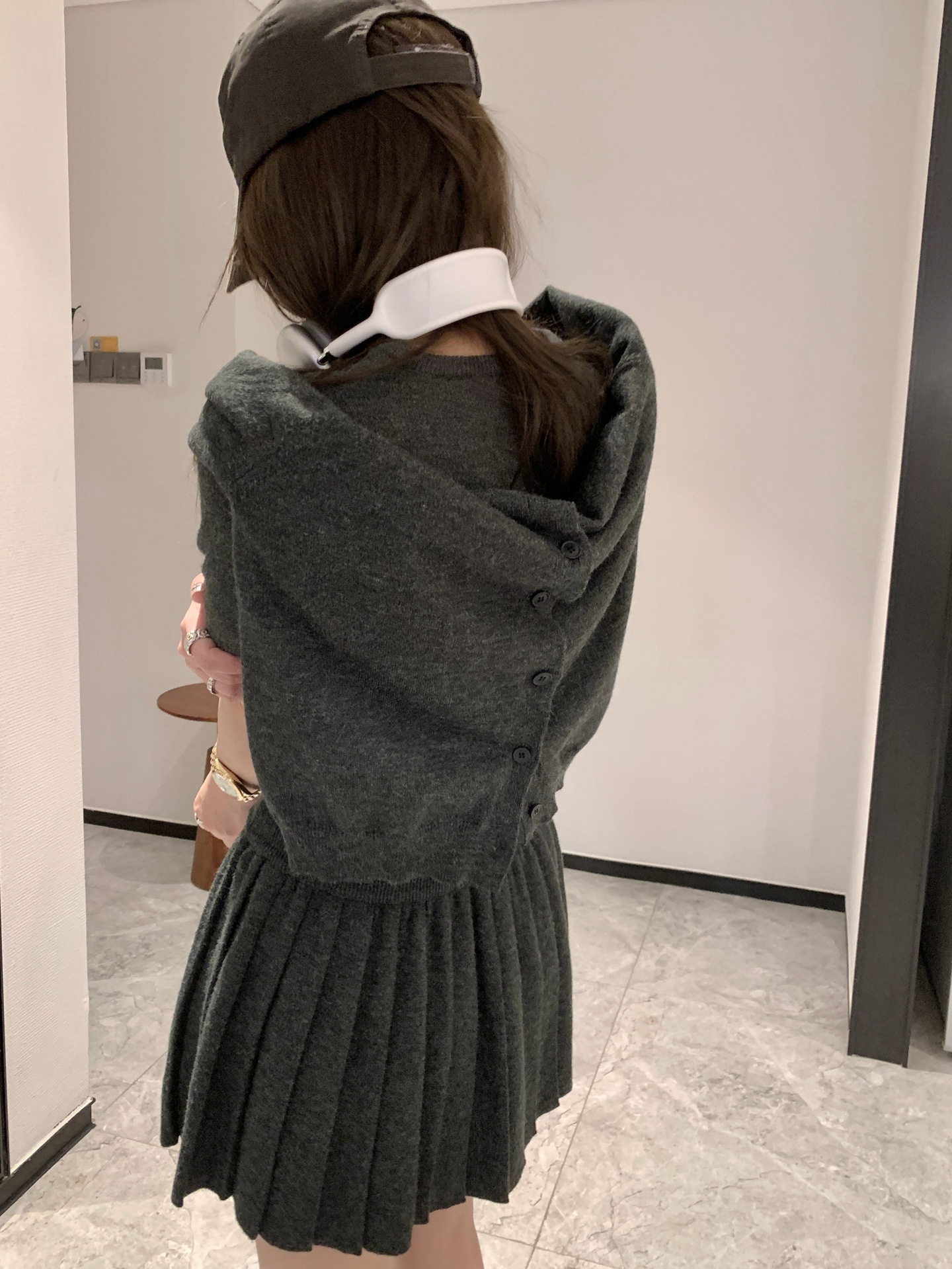 里面短袖针织外面小开衫搭配百褶短裙