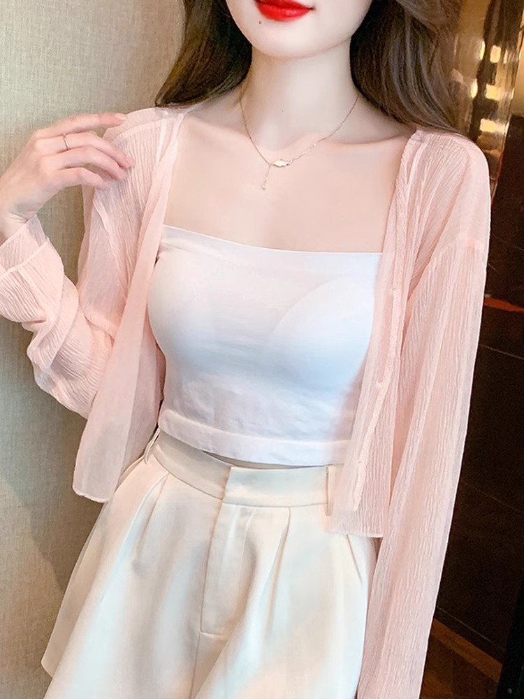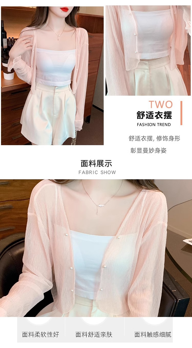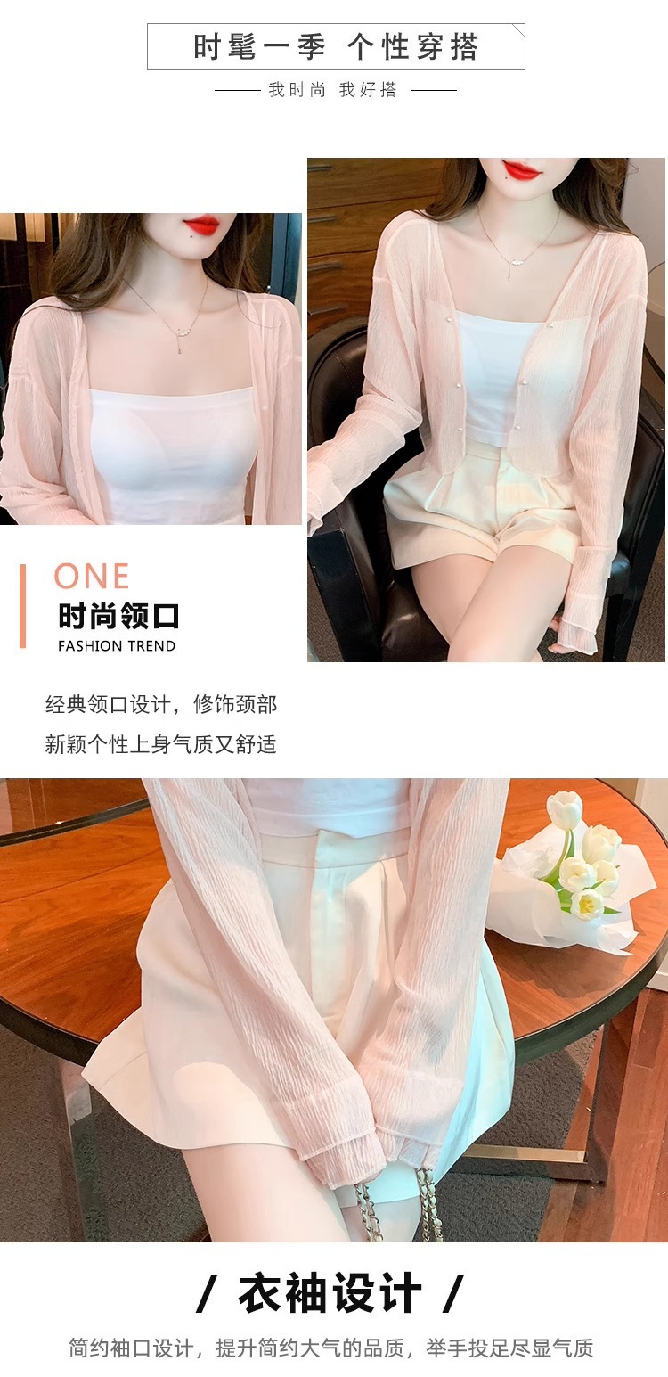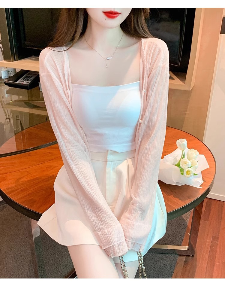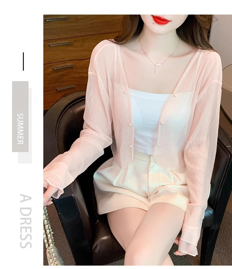 아이스 실크 쉬폰 카디건 태양 보호 의류 여성용 여름 얇은 목도리 코트, 서스펜더 스커트 아우터 블라우스 쇼트 탑