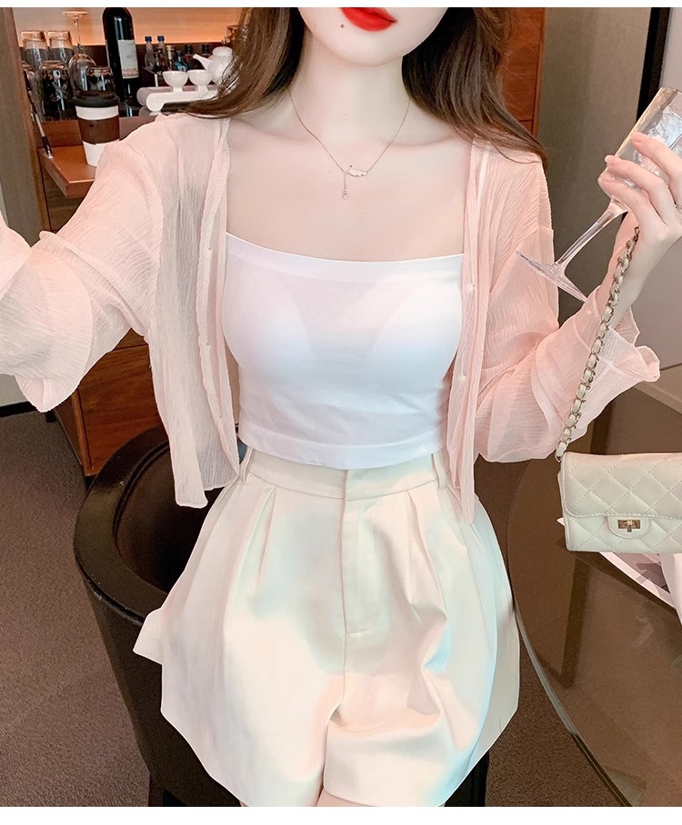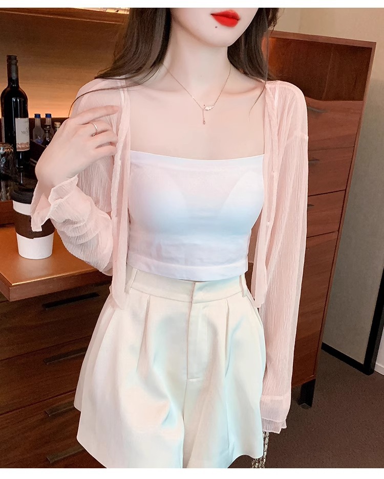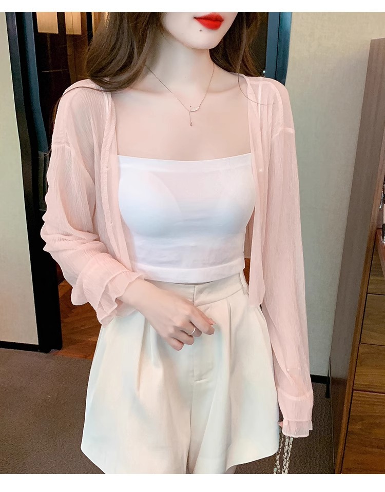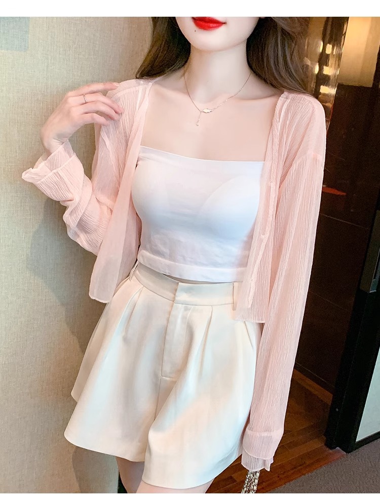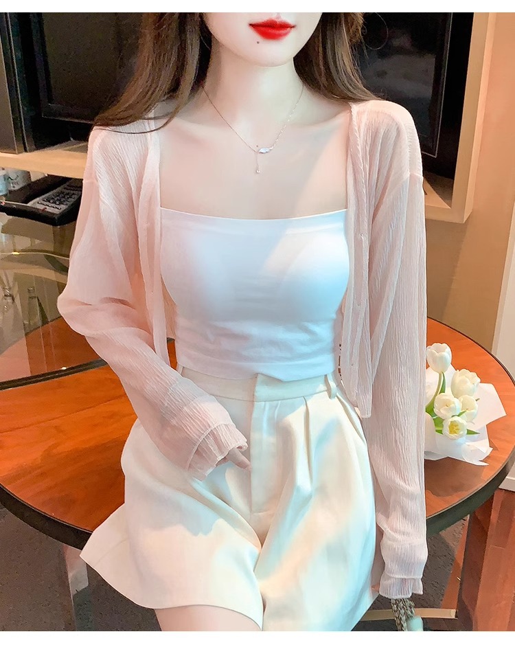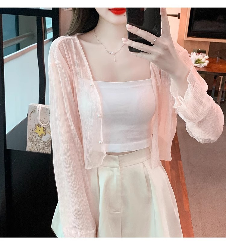 아이스 실크 쉬폰 카디건 태양 보호 의류 여성용 여름 얇은 목도리 코트, 서스펜더 스커트 아우터 블라우스 쇼트 탑