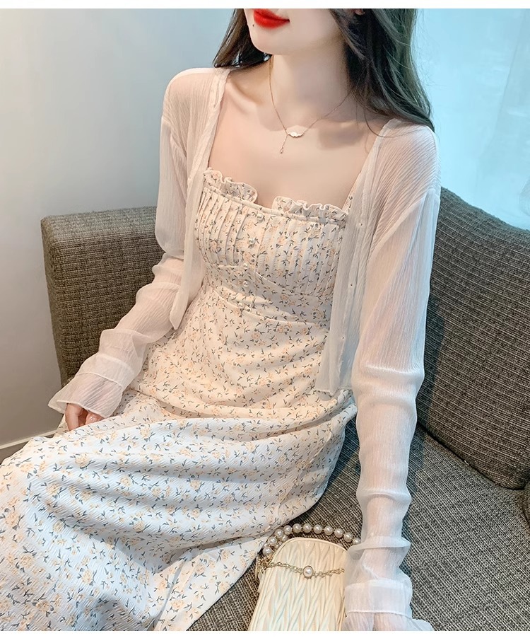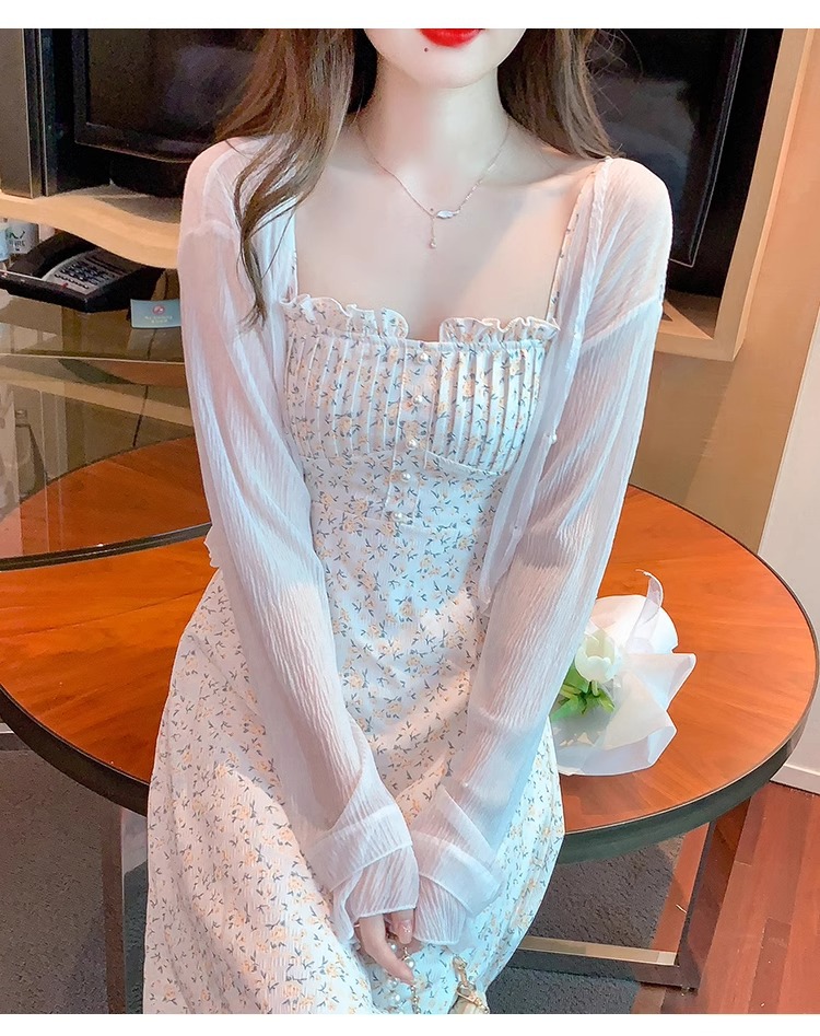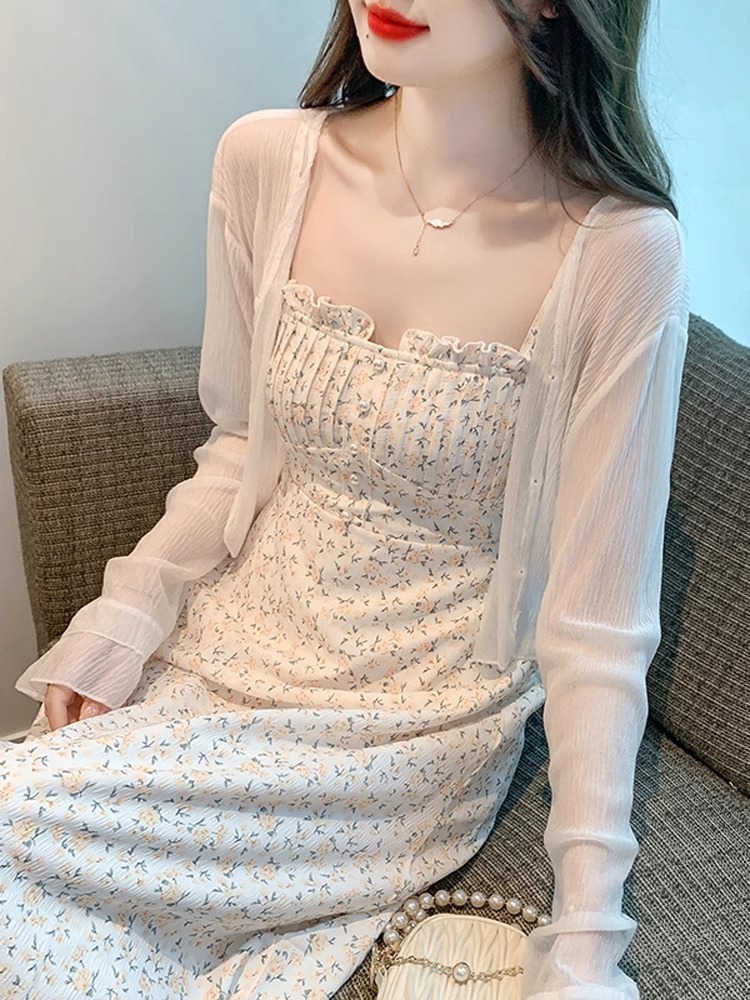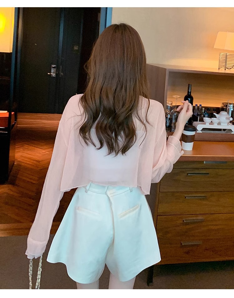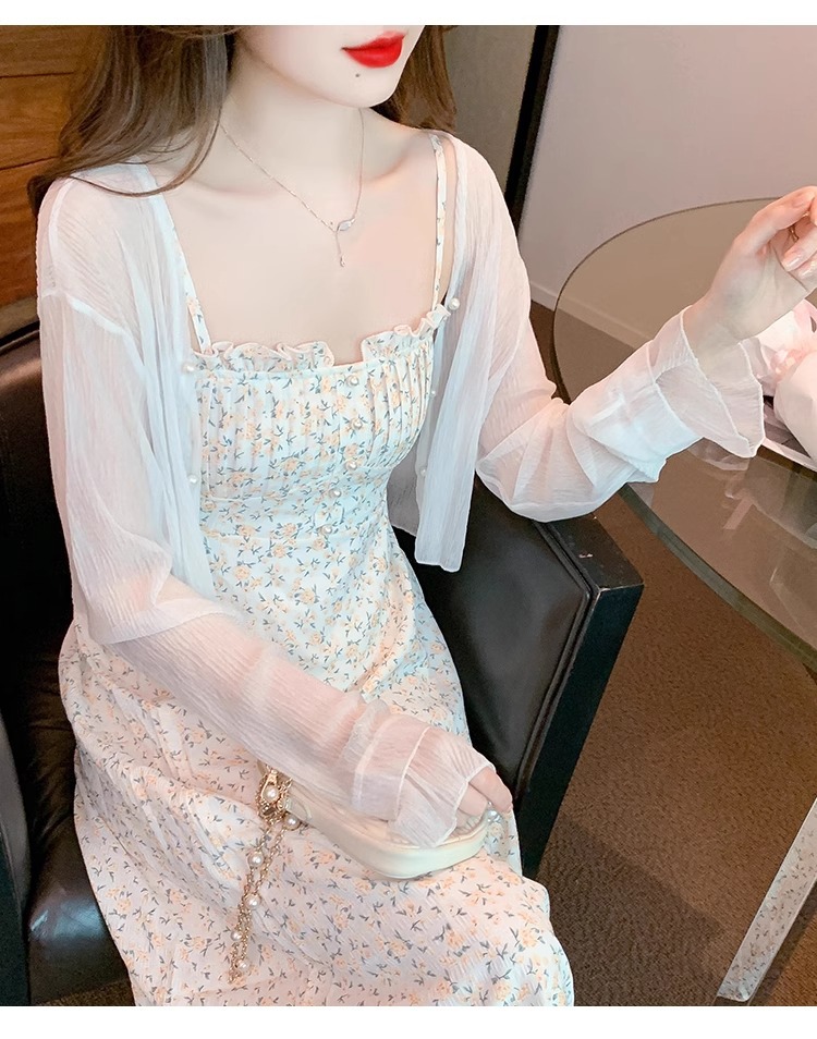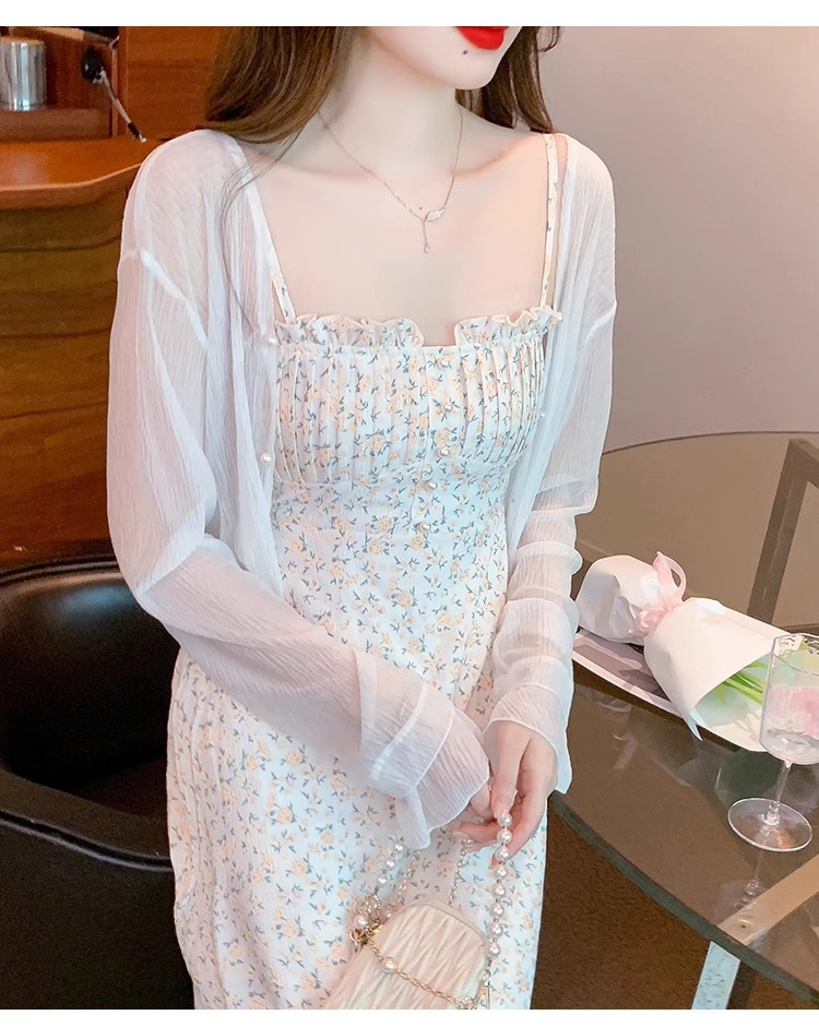 아이스 실크 쉬폰 카디건 태양 보호 의류 여성용 여름 얇은 목도리 코트, 서스펜더 스커트 아우터 블라우스 쇼트 탑