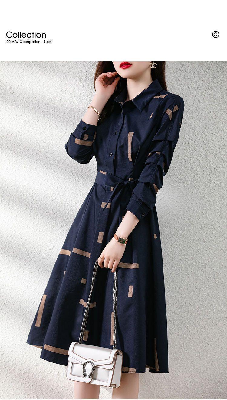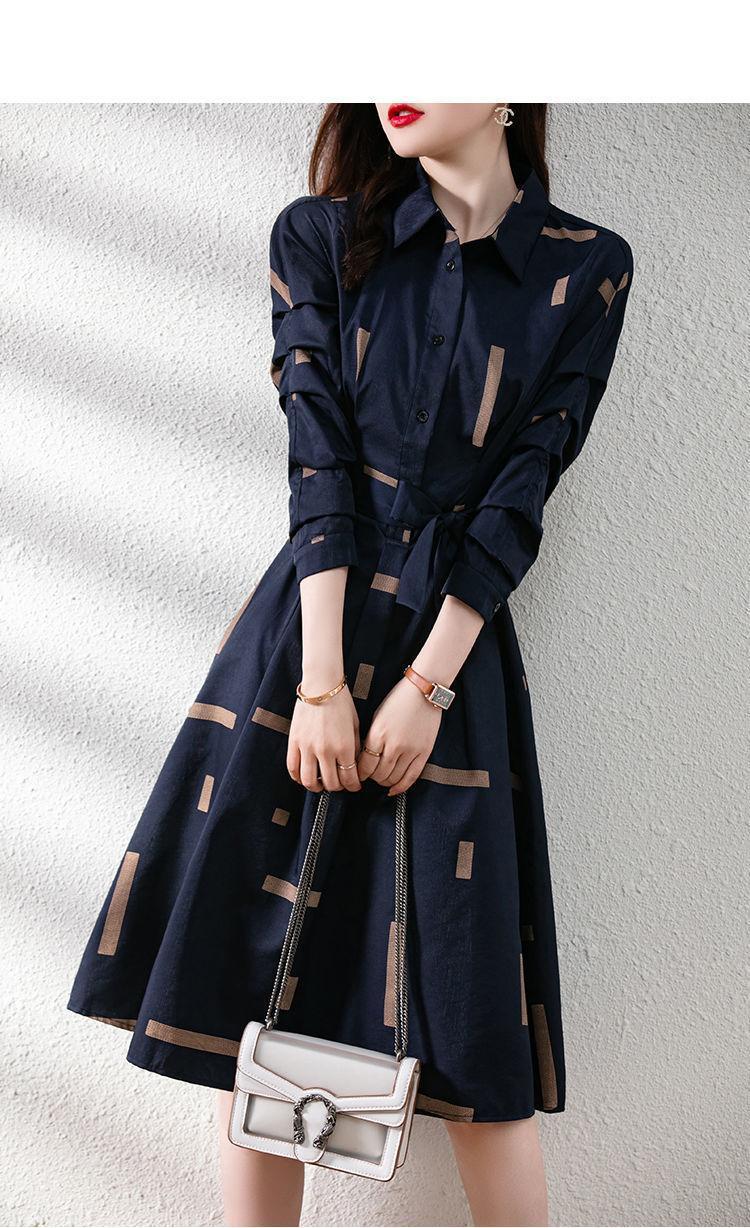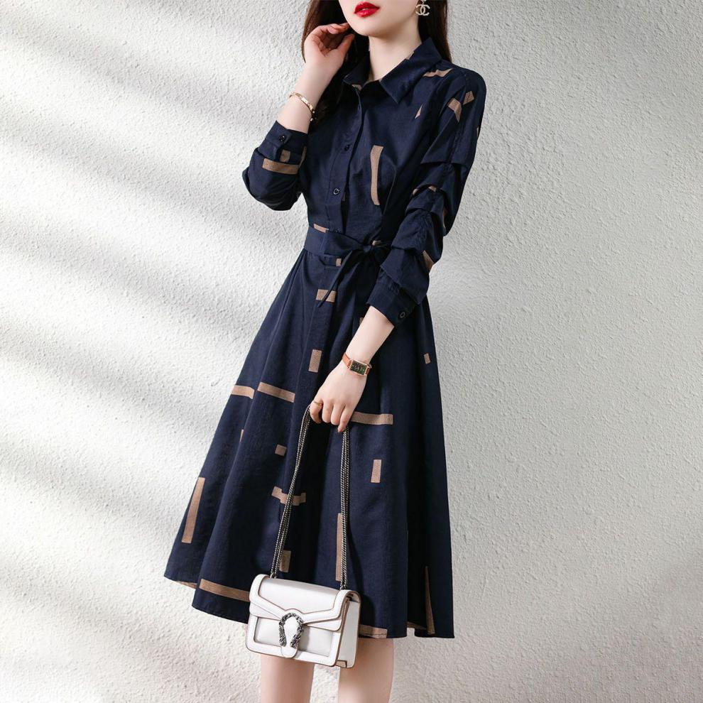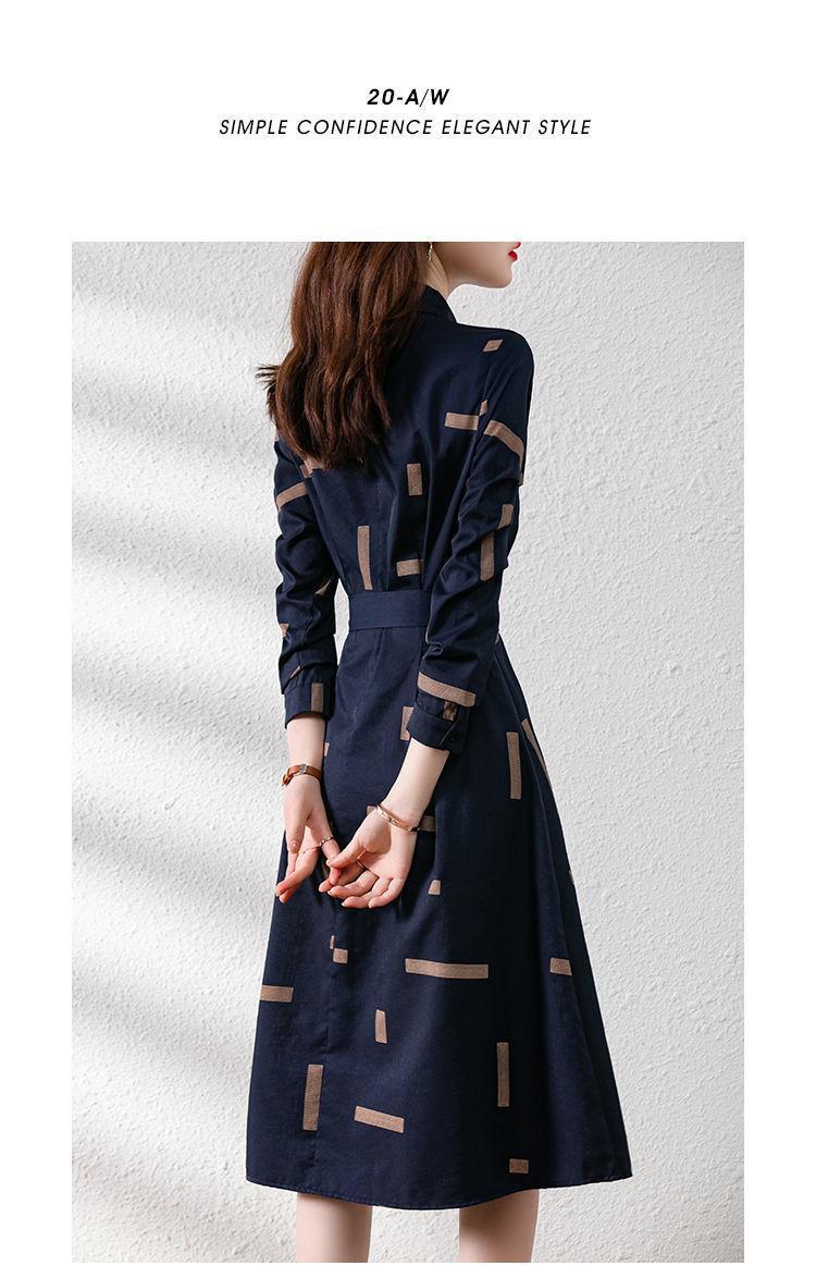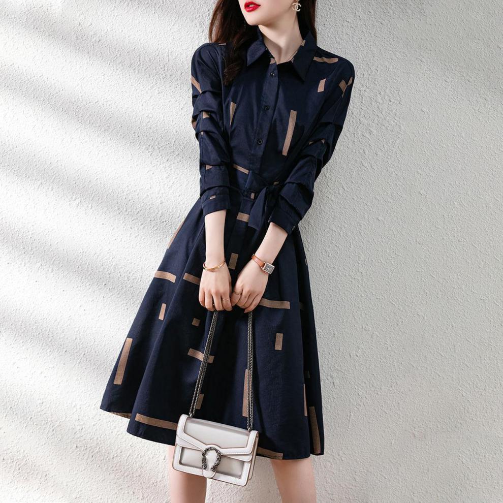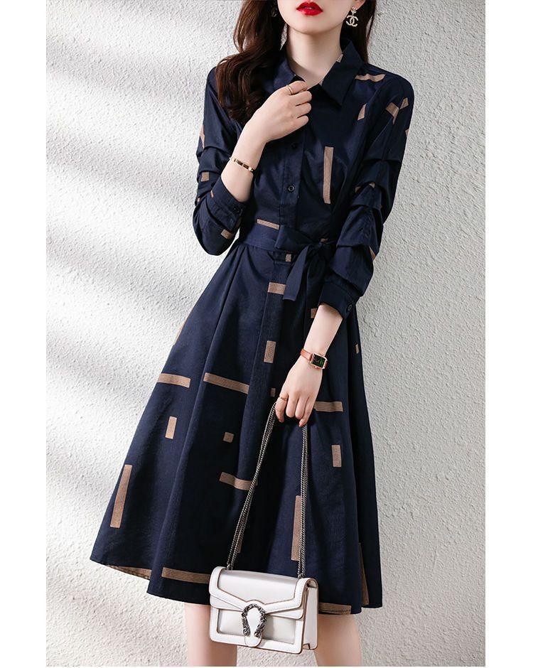 A620 우아한 빛 성숙한 간단한 우아한 명암 컬러 기하학적 패턴 벨트 랩 칼라 셔츠 원피스 2024 새로운스토어 가기