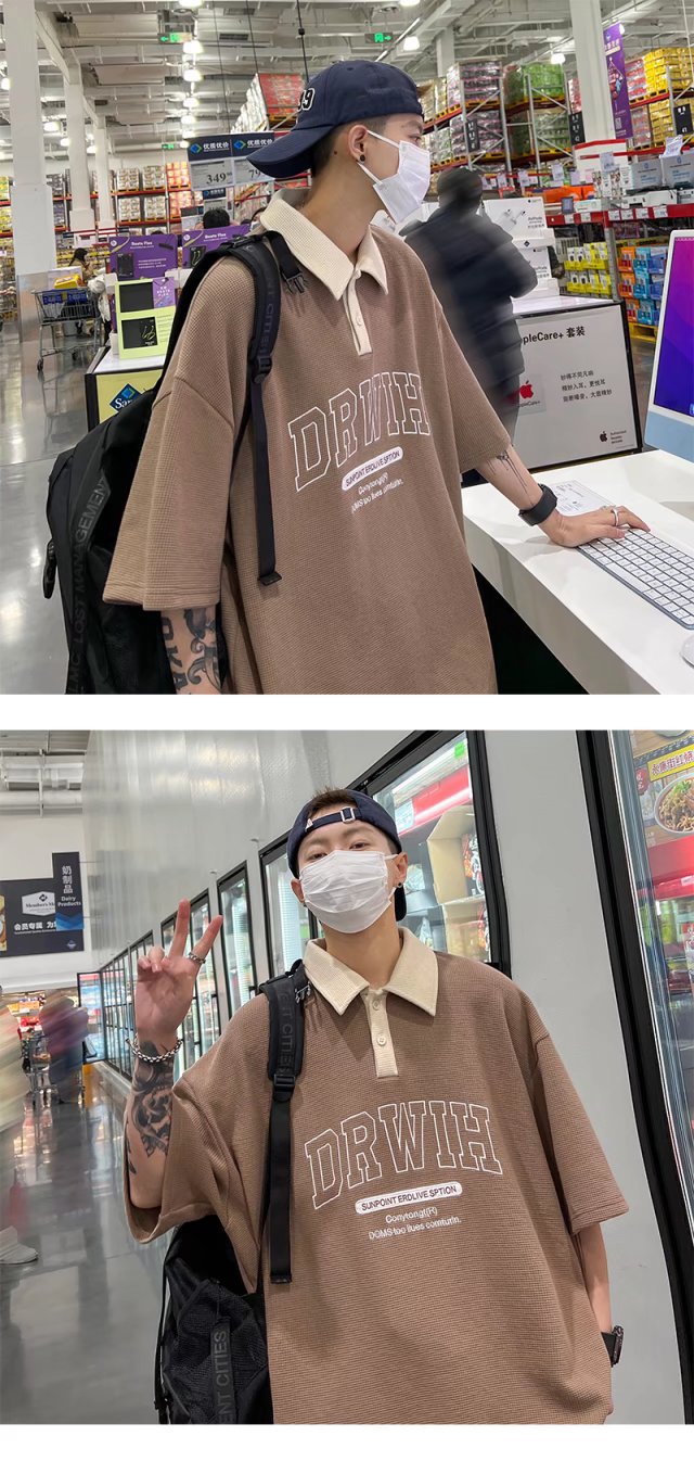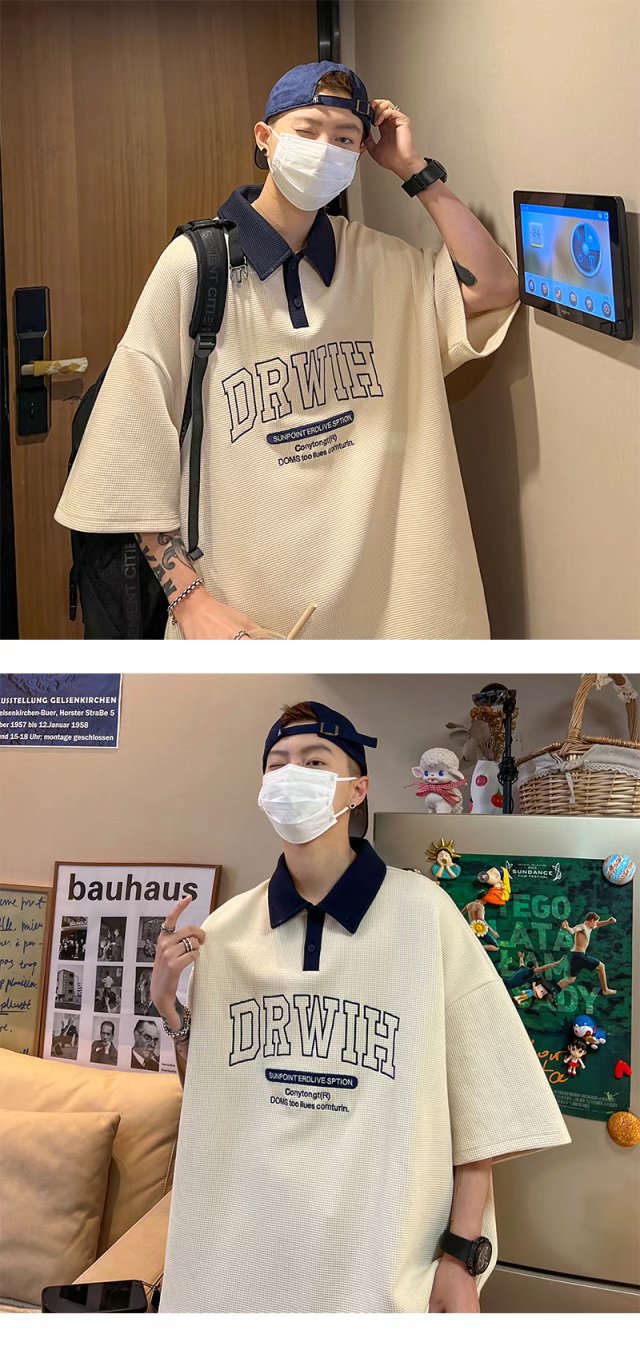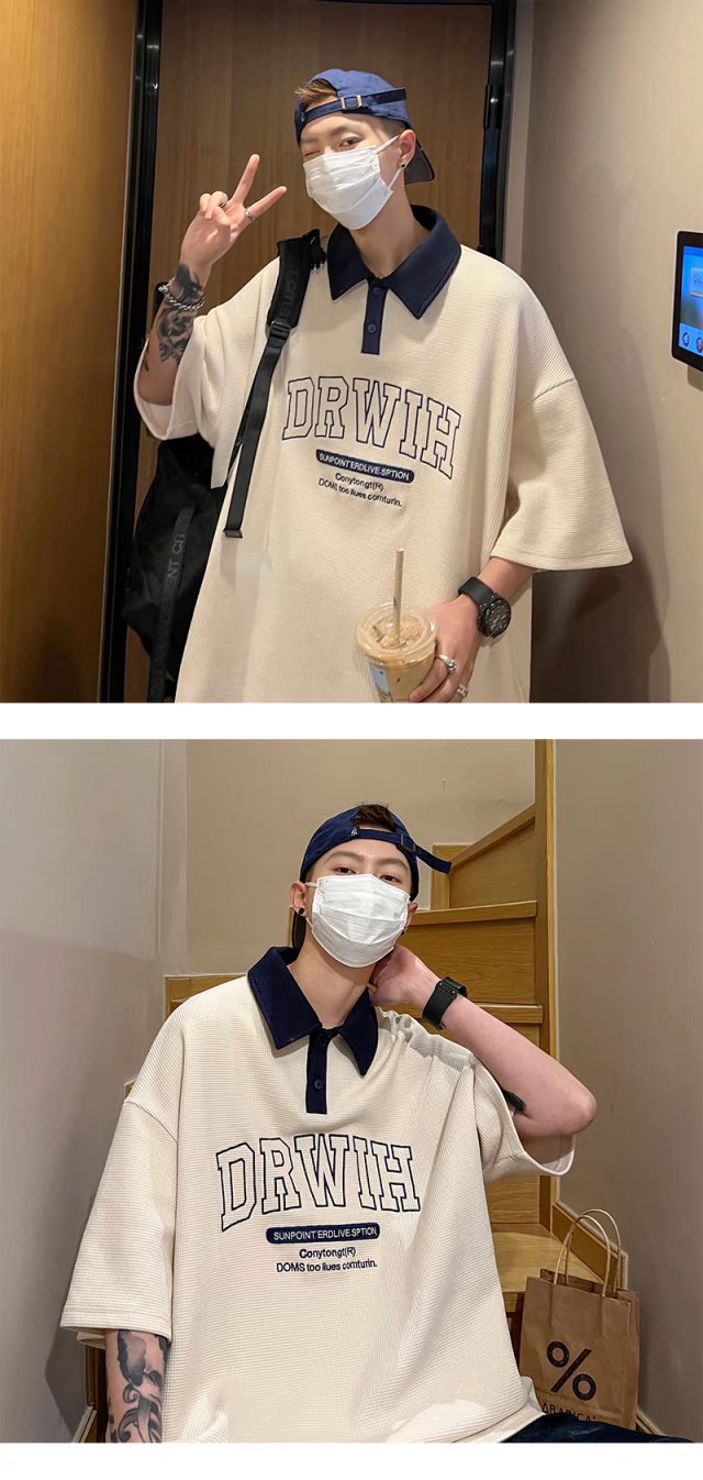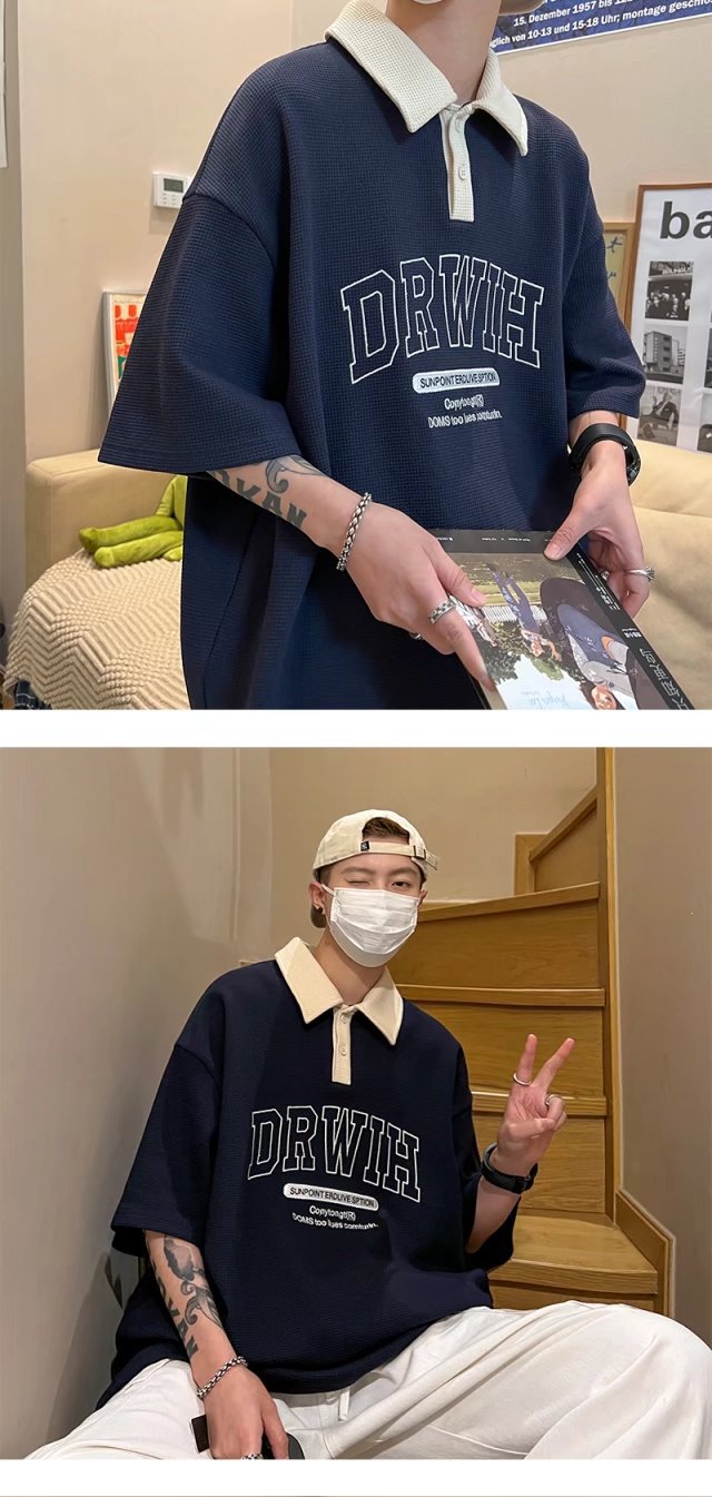 아메리칸 스타일 와플 반소매 폴로 셔츠 남성용 여름 얇은 패션 브랜드 루즈 탑, 트렌디 한 올 매치 하프 슬리브 티셔츠스토어 가기