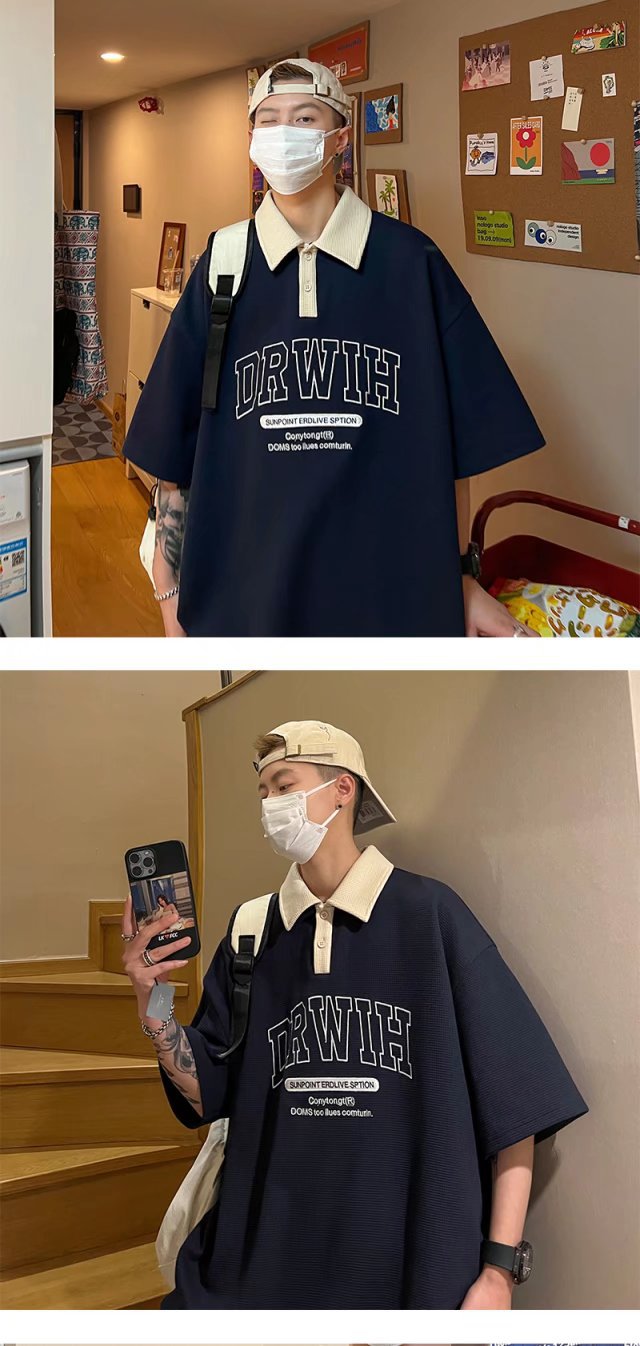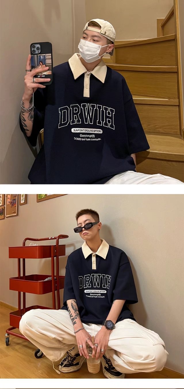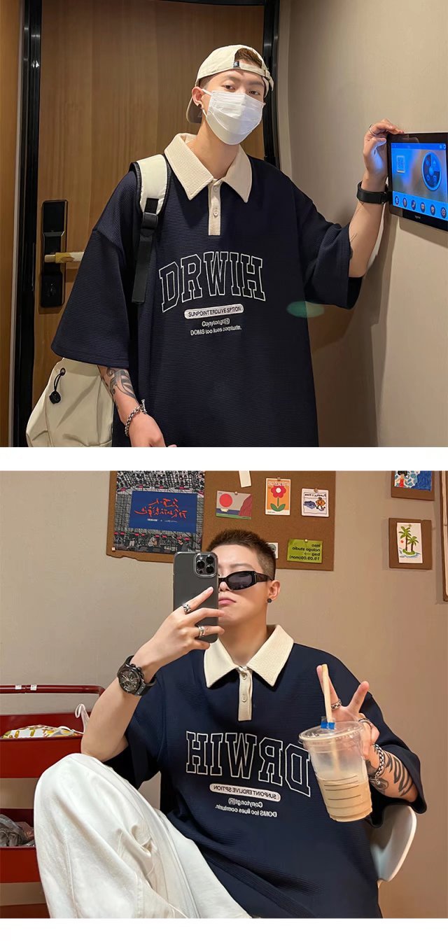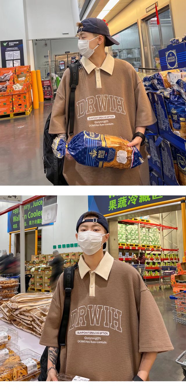 아메리칸 스타일 와플 반소매 폴로 셔츠 남성용 여름 얇은 패션 브랜드 루즈 탑, 트렌디 한 올 매치 하프 슬리브 티셔츠스토어 가기