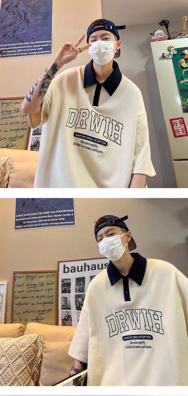 아메리칸 스타일 와플 반소매 폴로 셔츠 남성용 여름 얇은 패션 브랜드 루즈 탑, 트렌디 한 올 매치 하프 슬리브 티셔츠