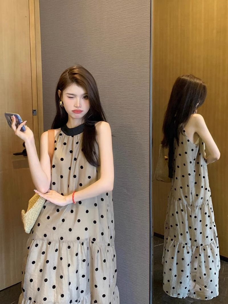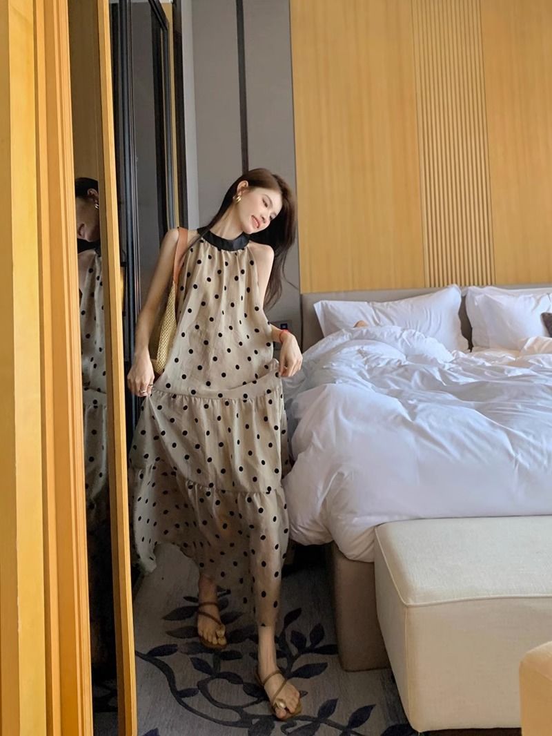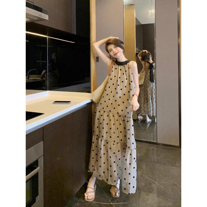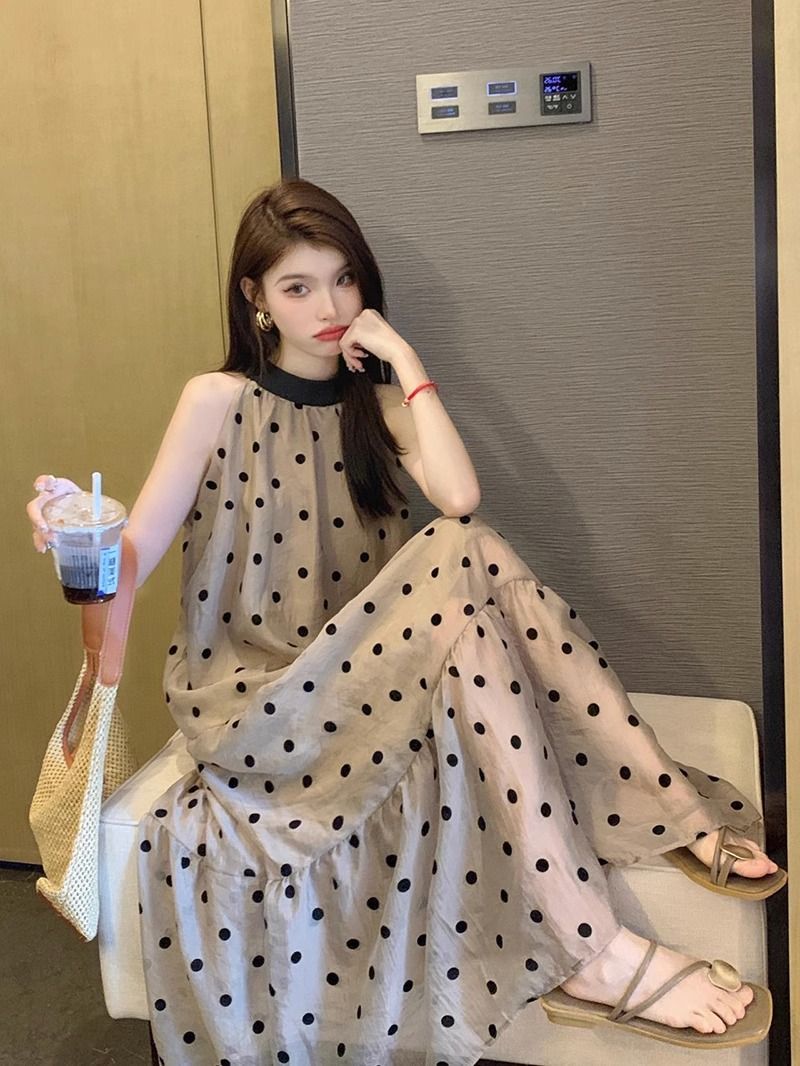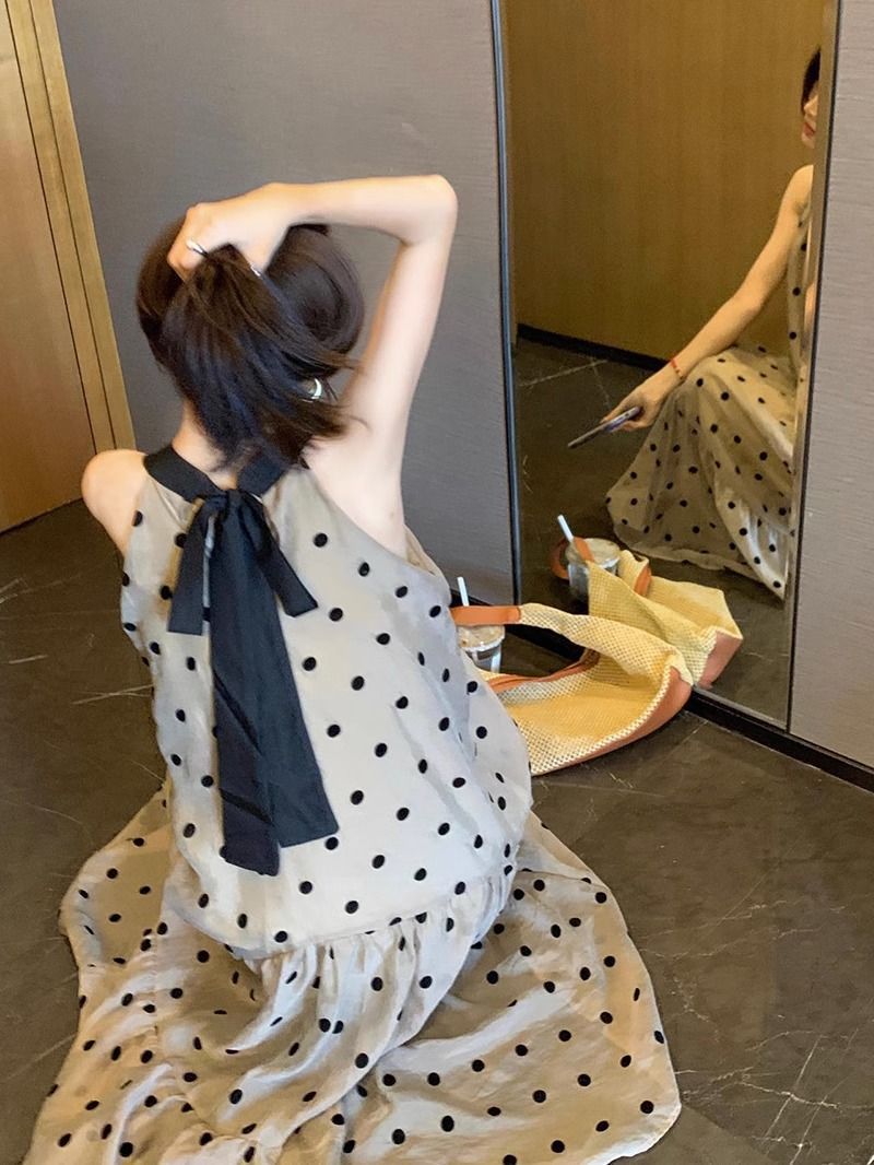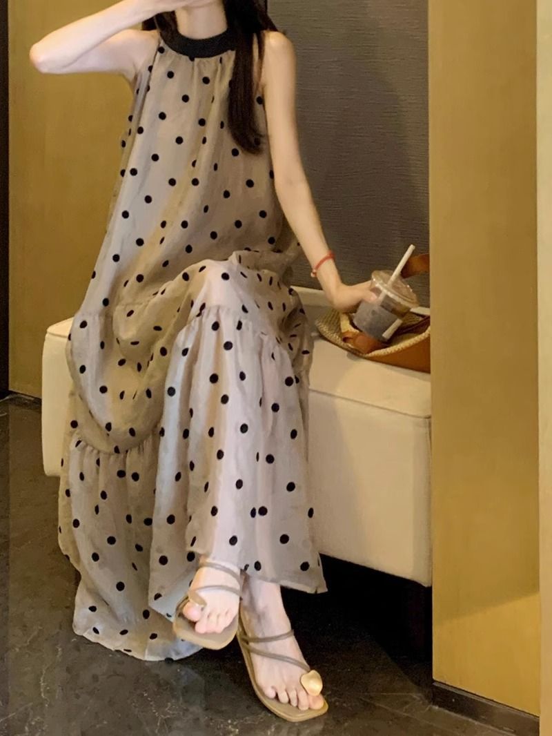 프랑스 스타일 민소매 점 슬링 원피스 여성 여름 새로운 해변 휴가 작은 우아한 긴 원피스