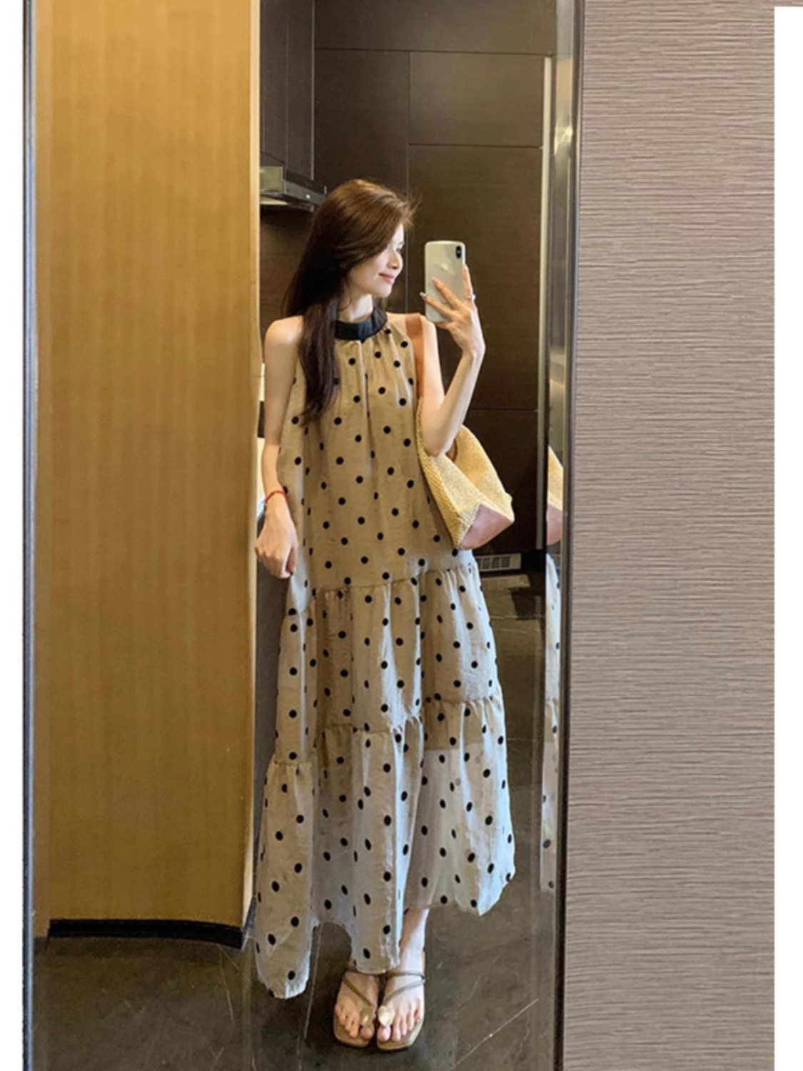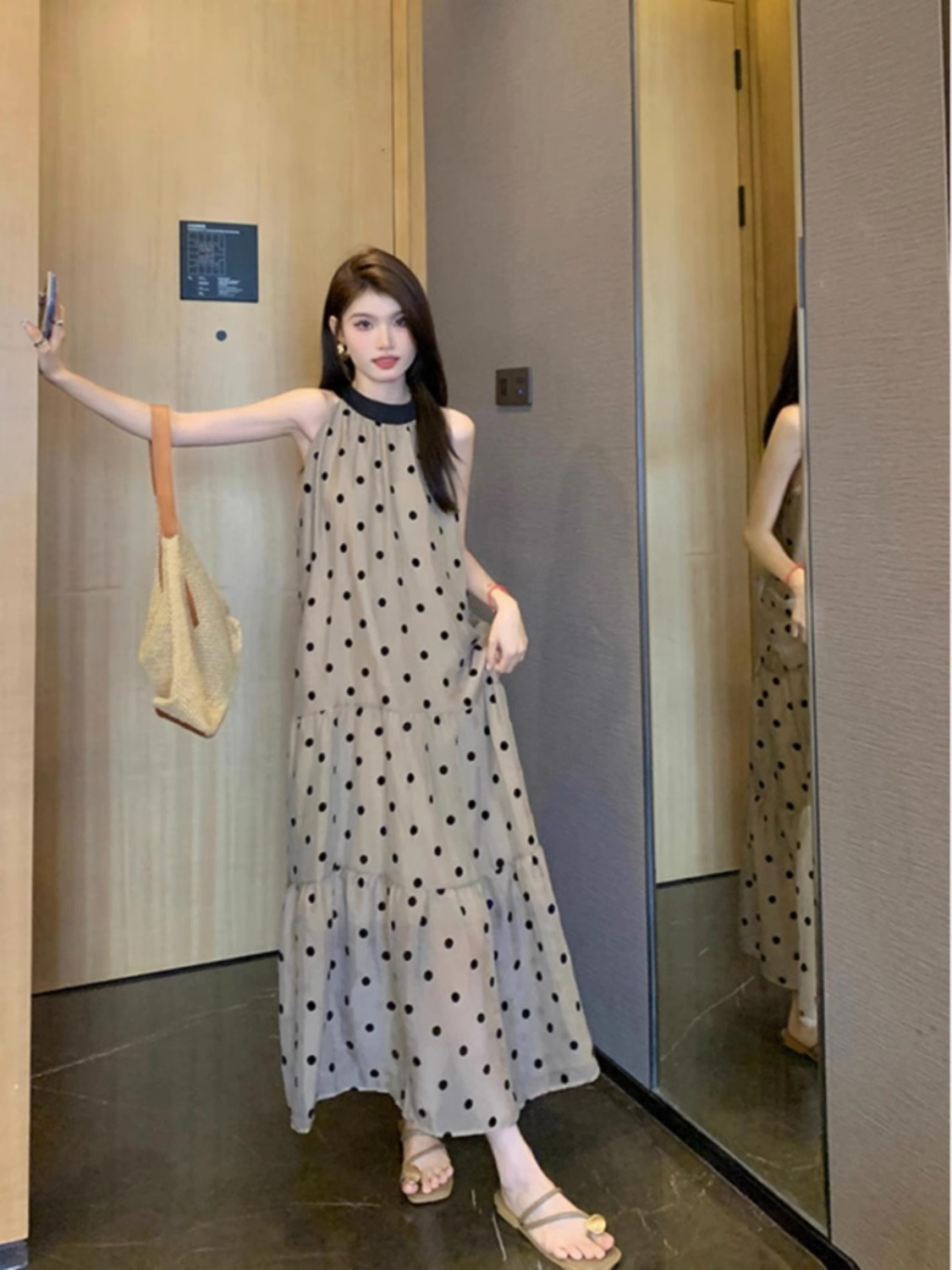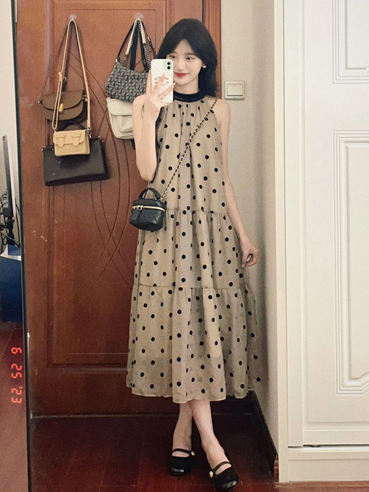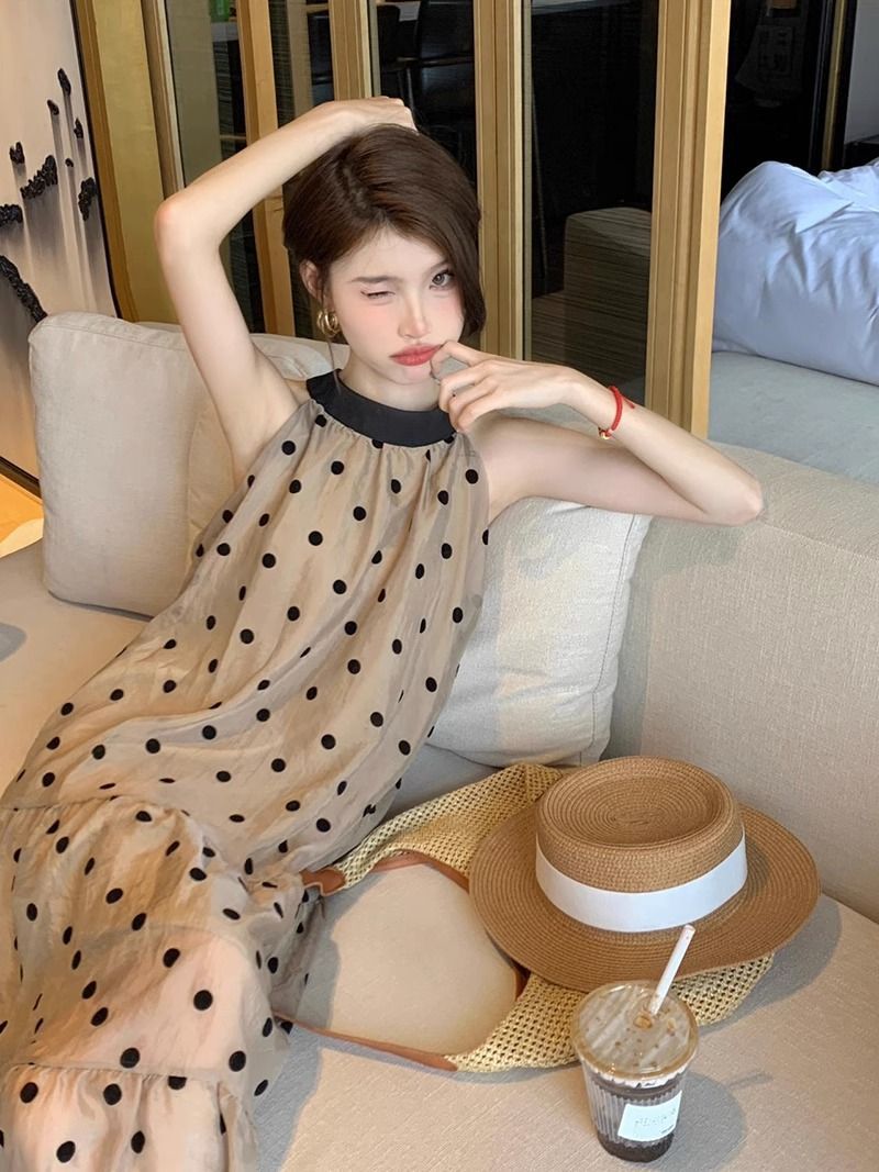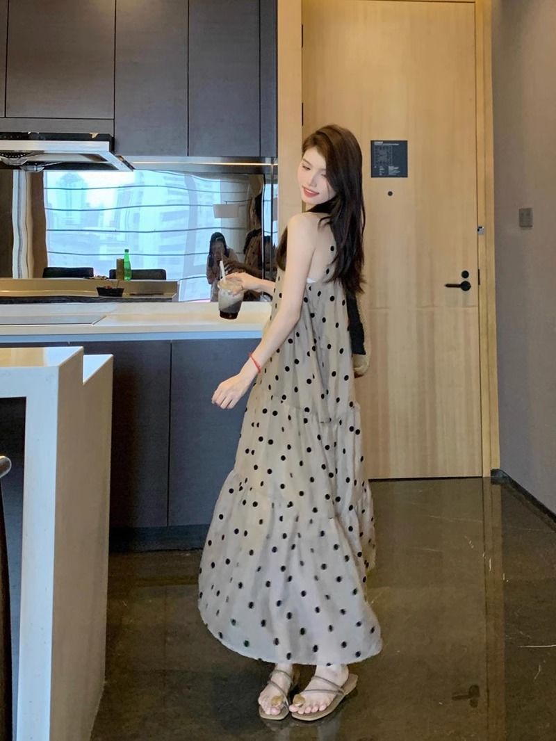 프랑스 스타일 민소매 점 슬링 원피스 여성 여름 새로운 해변 휴가 작은 우아한 긴 원피스